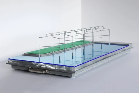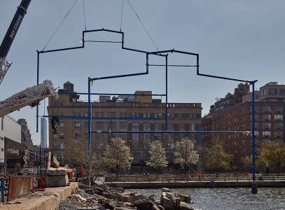 Through a close collaboration with David Hammons, the stainless steel structure has been developed with as few elements as possible. Slender 8in beams span 65ft and create a light, open frame that tends to disappear in the sculpture’s busy urban context. All of the structural elements were prefabricated and brought to the site in large sections where they were mechanically connected. Corrosive Hudson River waters, sea level rise and future storm scenarios were important considerations in the structure’s design and detailing.