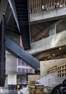 The new 93,000sf Glassell School of Art provides classroom, studio, exhibition, and lecture space, doubling the program size of its previous building, as part of the 14-acre campus expansion of the Museum of Fine Arts, Houston (MFAH). The L-shaped building is constructed from a series of sandblasted, exposed structural precast concrete panels. The perimeter consists of 178 wall panels varying in size and geometry with full-height glazed panels in between. Exposed precast hollowcore concrete planks span between cast-in-place concrete perimeter beams to form the floor system. A series of folded steel plate stairs crisscross the school’s triple-height entry forum, clear spanning between the perimeter beams at each floor level. Precast concrete planks support the school’s sloped green roof with integrated amphitheater seating. A continuous stairway allows public roof access for unobstructed views of the MFAH campus and greater Houston.