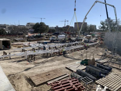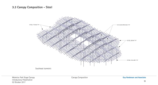 The Moody Amphitheater is an outdoor music and performing arts venue, carefully integrated with the renovated park landscape. The amphitheater’s focal point is a 20,000sf steel canopy composed of alternating layers of stacked I-beams, arranged in a denser pattern over the stage and feathered at the edges. The canopy’s structural scheme sculpturally satisfies the high stage loading requirements with a “cloud” of over 2,000 individual steel and aluminum members, supported on slender rectangular steel columns, concealing the two-way grillage of fabricated steel trusses. The canopy provides shelter to a cast-in-place concrete stage and venue support facility. The support facility’s exposed concrete walls follow the site’s curved geometry and topography. The framed concrete roof structure carries the high loading of the canopy and green roof above and incorporates mechanical systems.