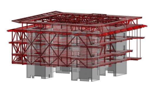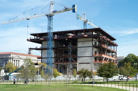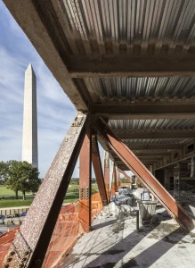 In this striking addition to the National Mall, the museum’s primary architectural gesture is its three-tiered exterior Corona screen wall. The Corona is suspended from the top of the building and forms a continuous atrium, free of structure between the façade and the inner gallery floors, allowing daylight to filter through its patterned bronze cladding and skylights. The above-grade building structure is entirely supported on four composite steel-and-concrete cores, creating an open lobby space that highlights its curved, custom ceiling. The galleries and administrative level floor framing consist of vertical steel trusses and long-span plate girders cantilevering from the central cores. At the southern entrance to the museum is a steel framed asymmetrical canopy, known as the “Porch,” which spans over 200ft between two piers. The below-grade structure is cast-in-place concrete, except for above the History Galleries. Here, long-span steel framing supports areas at grade with significant landscaping and flood loads.