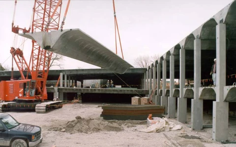 The parking garage at the Nelson-Atkins Museum of Art was added to the museum’s campus as part of its 2007 expansion. The new garage is situated underground and supports open space above for the museum entrances and the sculpture One Sun / 34 Moons by artist Walter De Maria, which includes 34 circular skylights that bring light to the parking below. The garage is formed from continuous waves made of independent “Wave T’s,” 12ft wide and 60ft long. The Wave T’s are prestressed, precast concrete beams with hollow centers. Each Wave T is independently supported on columns so that there are no cross girders to interfere with the continuity of the corrugated space.