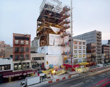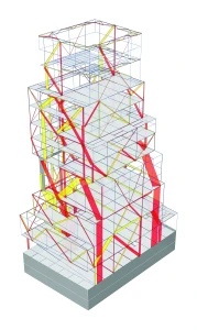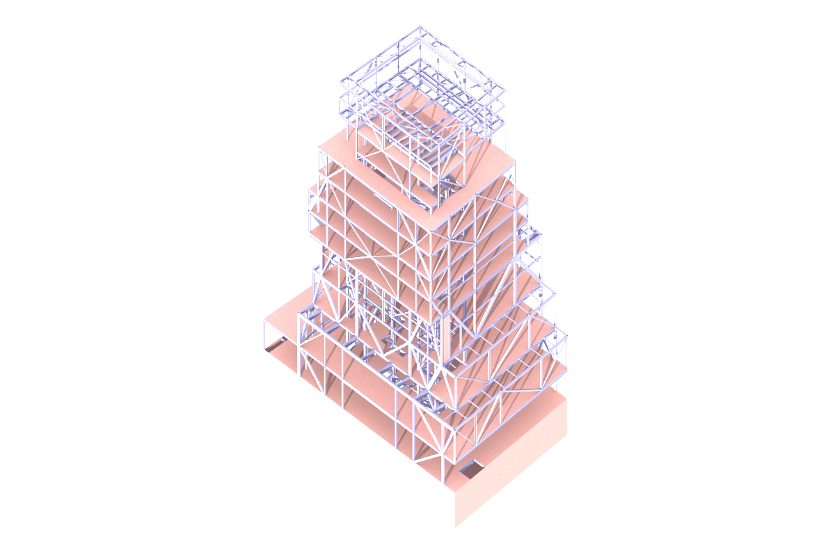 The design for the New Museum of Contemporary Art consists of a series of rectangular volumes that shift laterally as they rise. As a result, the only continuous vertical structure is in the central elevator core. The exterior walls are built of a series of shifting trusses that wrap around the east and west facades creating a number of floating corners. These trusses provide all of the setback transfers and the majority of the lateral resisting system of the building. The wall structure is kept to 8in in thickness to allow for minimal overall wall thickness.