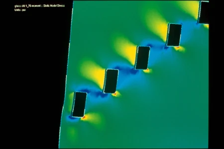 This stair represents a revival of the “cantilever stair” where treads overlap so the load on any tread cascades down to those below. The wall from which the treads extend carries the resulting torque. In this instance, the stair system uses 64in by 6in steel tubes risers, aluminum plate treads, and a perforated triple layer laminated and tempered glass wall to resist torque. The risers carry the cascade torque into the glass through an aluminum U-shaped stirrup that bears on three sides on Delrin wedges.