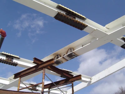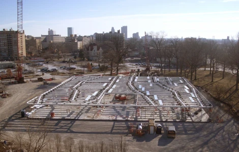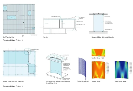 The Glass Pavilion is a free-standing addition to the Toledo Museum of Art with exterior and interior walls of glass. The interior glass walls form the galleries, and the cavities between the interior and exterior walls allow for ventilation and heating. The structure combines unorthodox solutions for steel framing in the roof and concrete framing in the floor to allow circulation of services in the thinnest possible depths. The steel roof consists of a moment-connected beam and girder horizontal grid and has a maximum structural depth of 12in for spans of up to 50ft. The concrete floor is made up of shallow, wide band beams with one-way slabs to create many linear slots through which to feed the HVAC from below. Machined round bar columns form pin connections at the top and reduce the diameter to 4 1/4in. Exposed vertical steel plates serve as both column and shear panel to combine vertical and lateral support with an extremely thin profile.