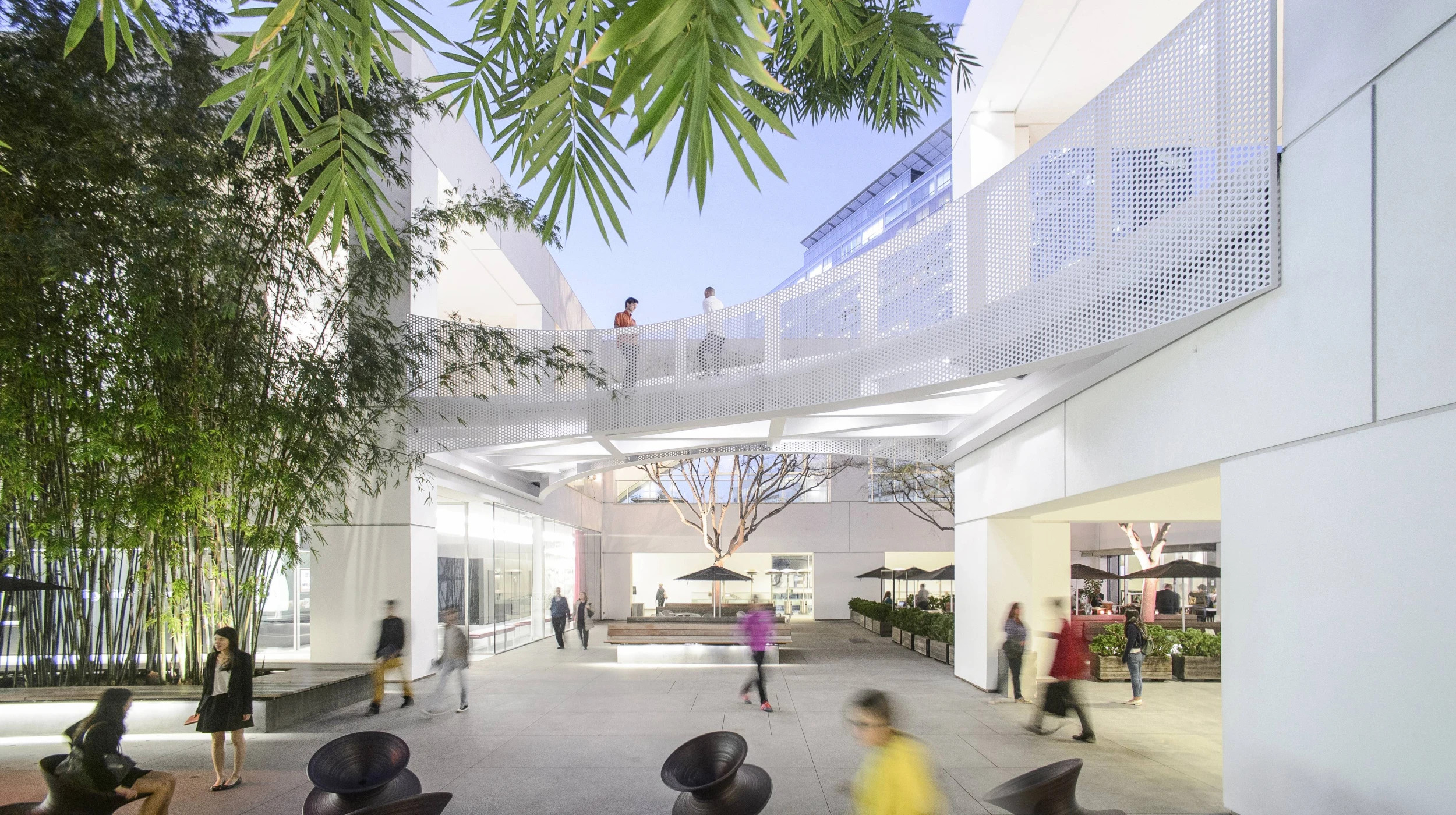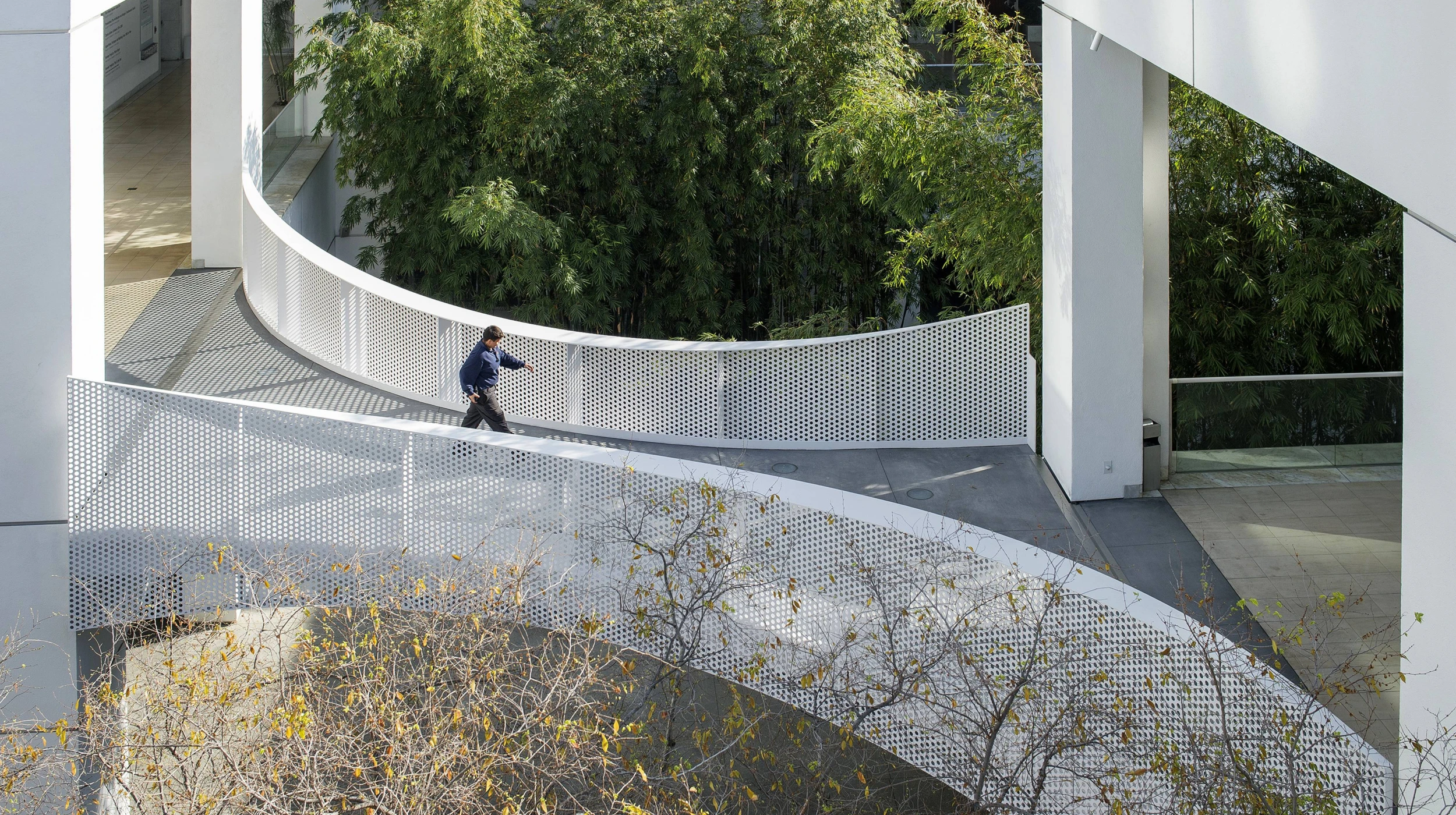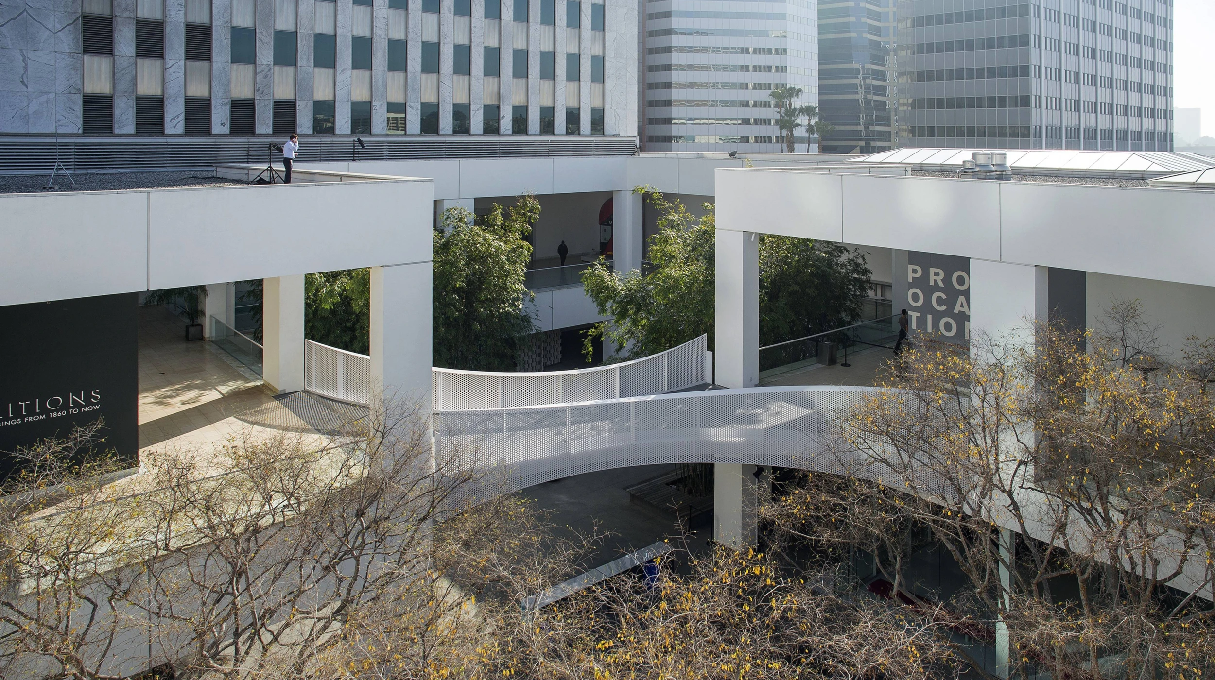 Designed in collaboration with Michael Maltzan Architecture, the new bridge spans 36ft across the open courtyard at the second floor, connecting museum gallery access. Fourteen circular glass lights cut into the bridge’s deck illuminate the courtyard below. The bridge’s width spans a maximum of 29ft 6in where the bridge connects with the building’s preexisting structural bays and narrows to a minimum width of 10ft at its center.