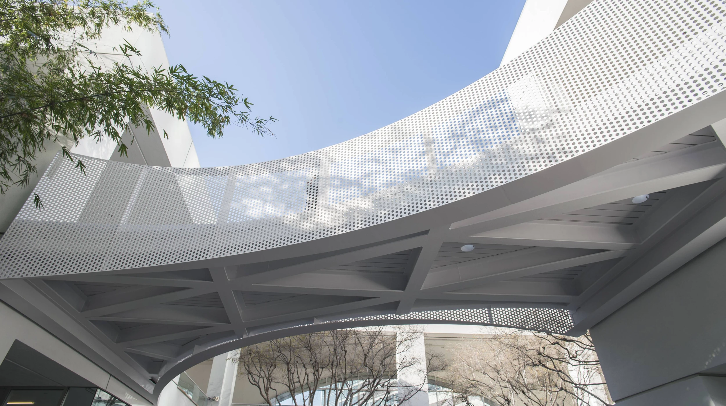 The bridge is composed of a structural concrete slab on a composite metal deck spanning between exposed steel beams with a seamless 3/16in perforated steel guardrail. The pattern of the bridge structural framing is aligned with the building columns and the curve of the bridge plan to form a horizontal truss. Two new header beams bearing on the existing building columns support the bridge ends, and spandrel beams on sliding and fixed points control the distribution of seismic forces and vibrations. Pedestrian induced vibrations are also limited by the perforated steel handrail acting as a slender upturned beam and contributing stiffness.