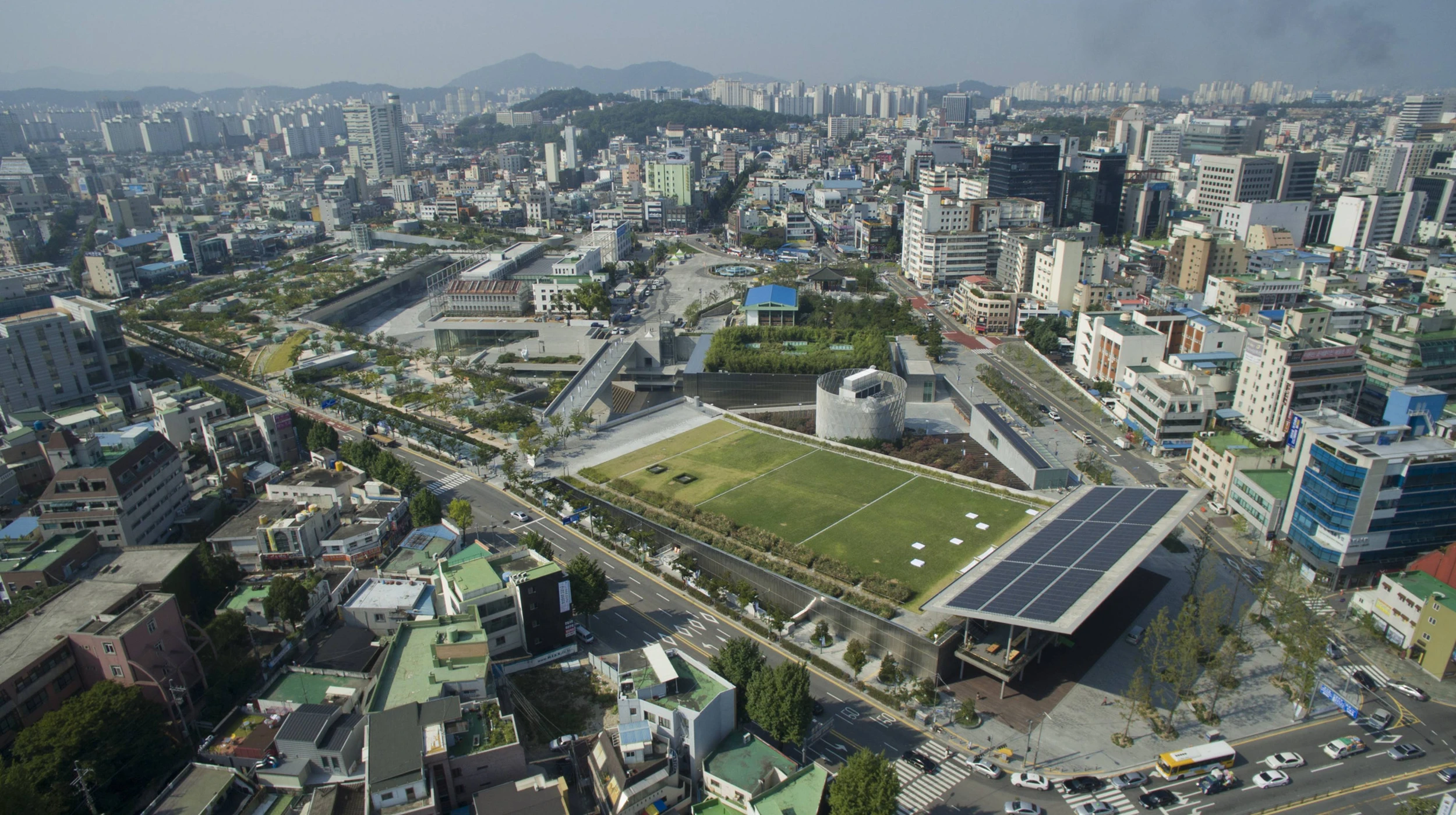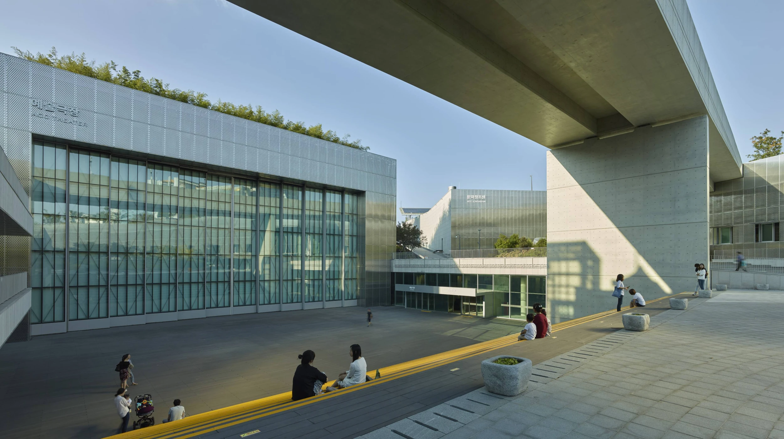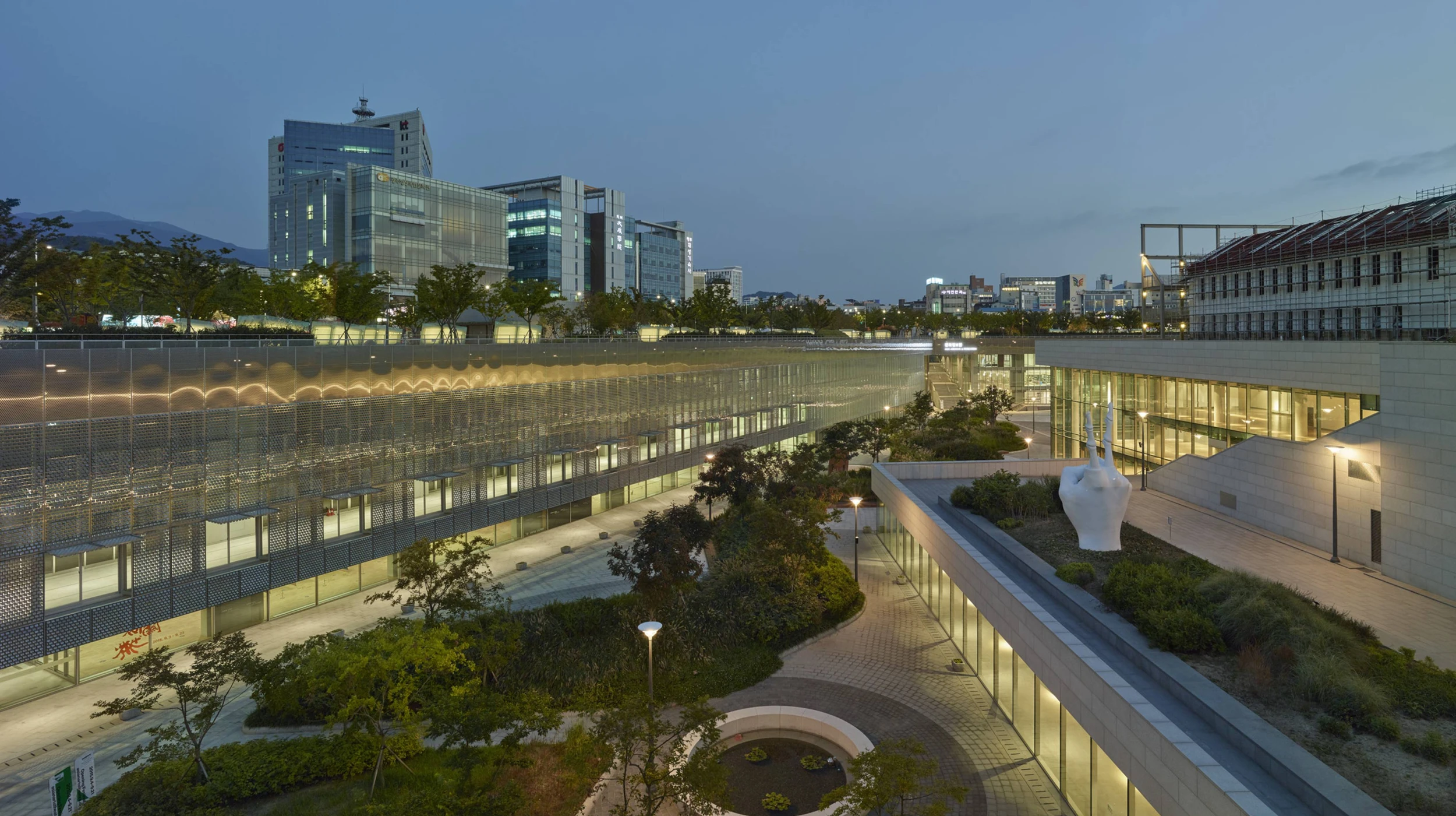 The Asia Culture Center is a 150,000m2 complex of mixed-use buildings for the exhibition, performance, and production of arts for the 21st century. The project consists of a full site excavation to 20m below the adjacent street level, which was then filled with buildings to street level at the perimeter with a publicly accessible park on the roof at street level. A depressed plaza provides direct access to the building levels below the park.