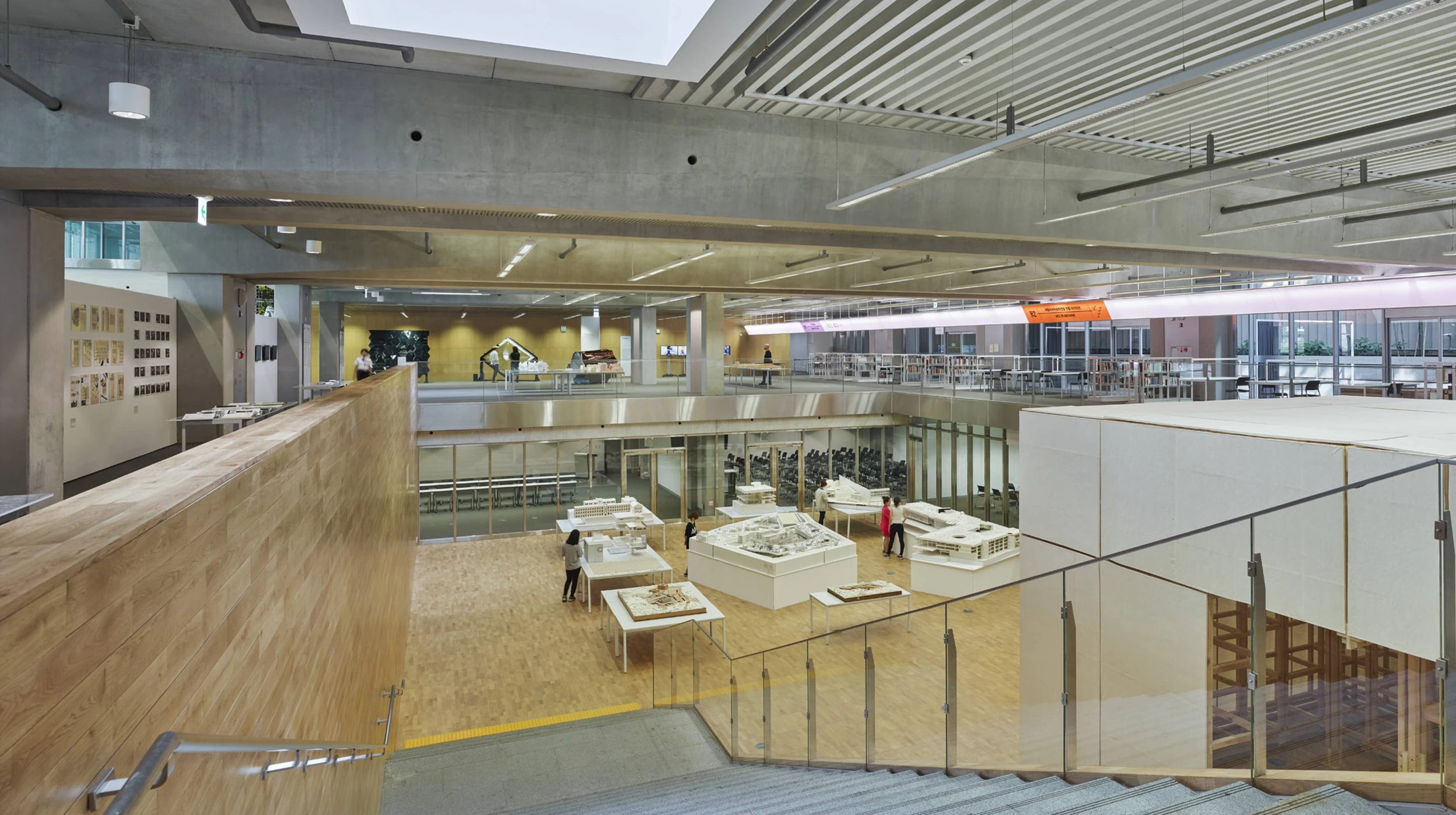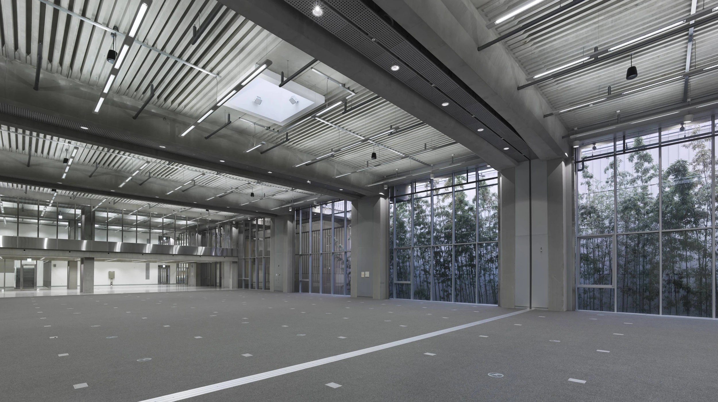 Long span exhibition and performance spaces are structured using exposed steel framing.
