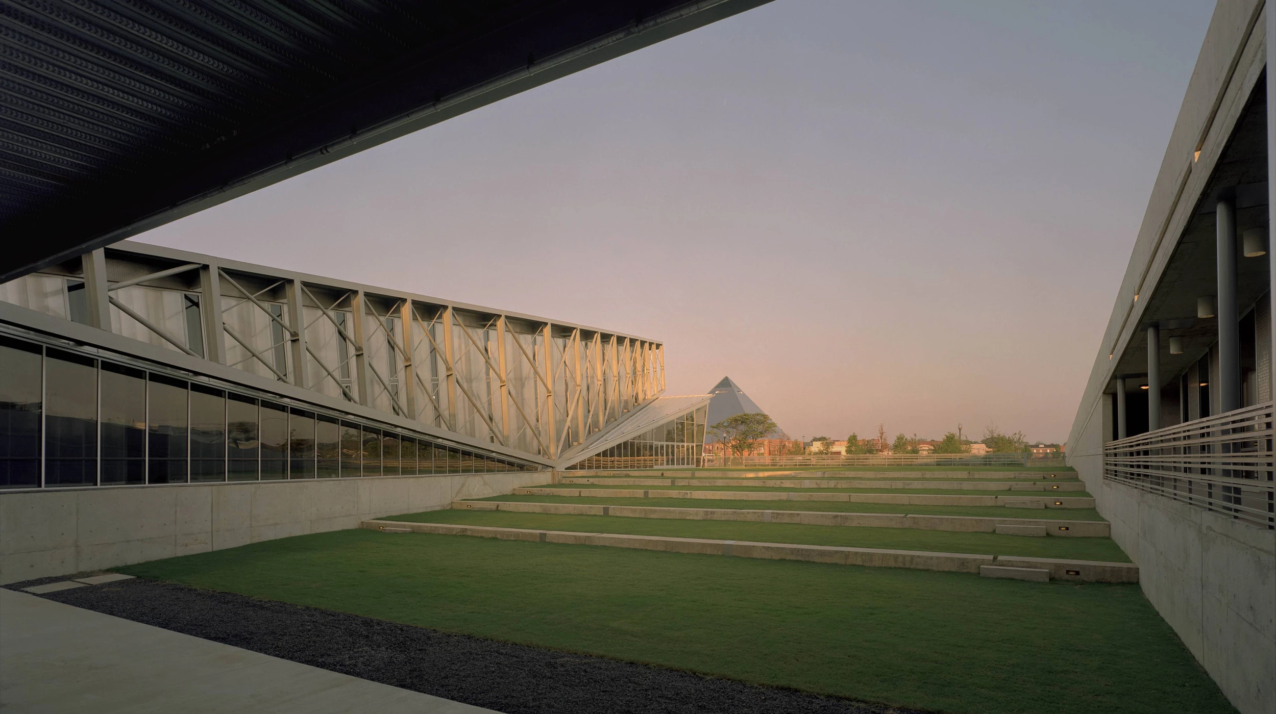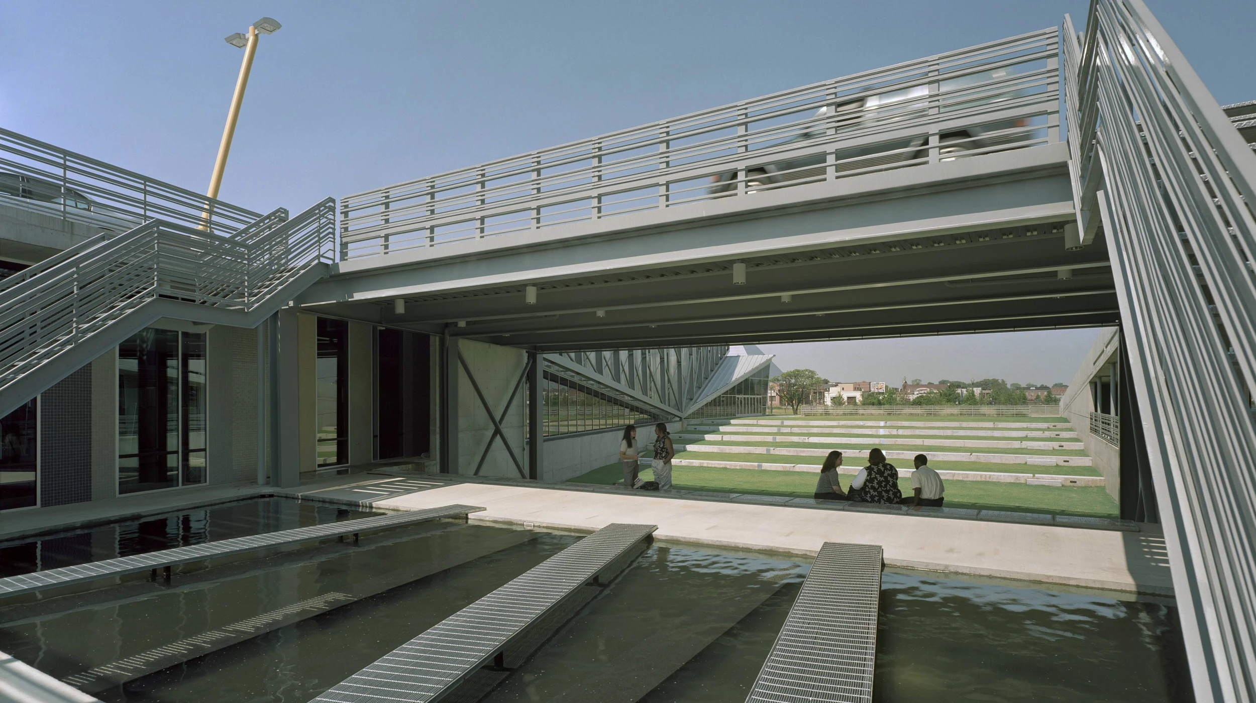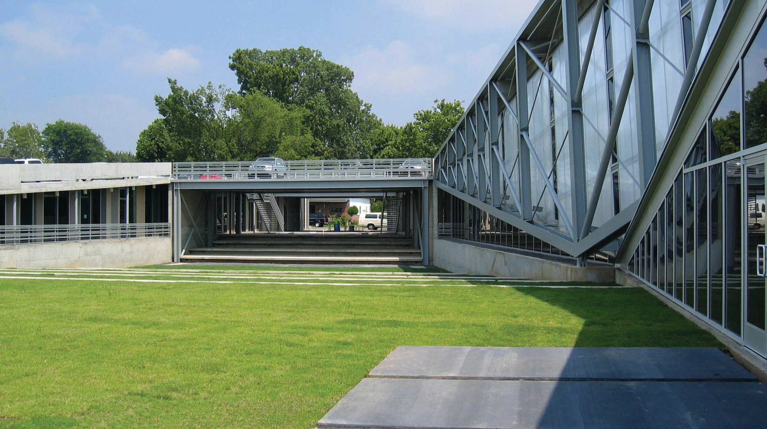 The building roof is ramped so that cars can drive up and park around its large U-shape. The center of the U is a stepped lawn courtyard and an open breeze-way. The highest part of the building is the climbing gymnasium. This is a long-span steel structure supported on two exposed cantilevered steel trusses. The trusses express the tension and compression distinctly. The truss bearings are visible and articulated.