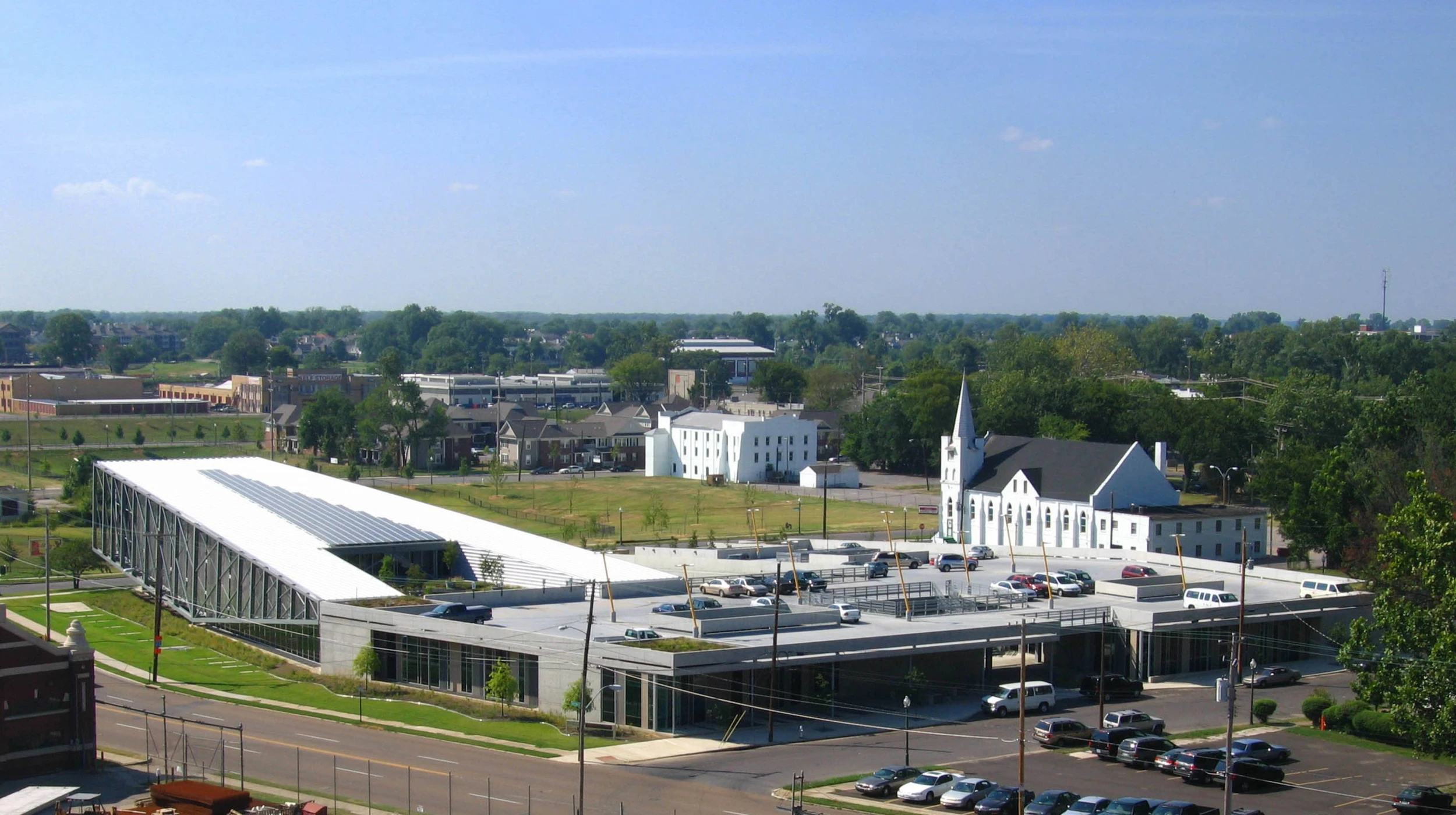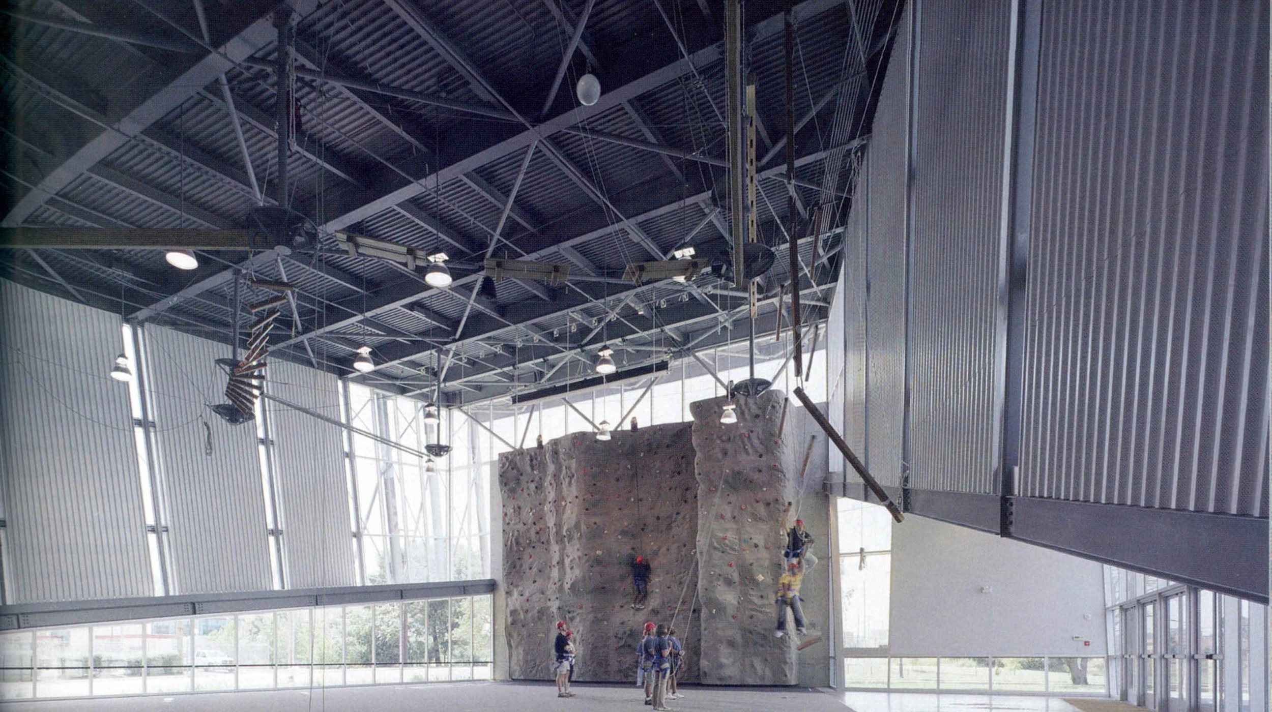 The BRIDGES Center in Memphis is a community outreach center for youths and adults. The center includes offices, classrooms and a large indoor climbing facility that features a suspended rope course for climbing, swinging and walking.