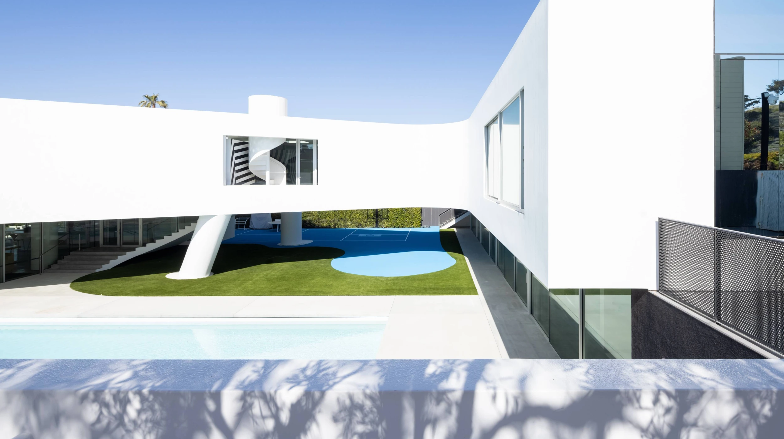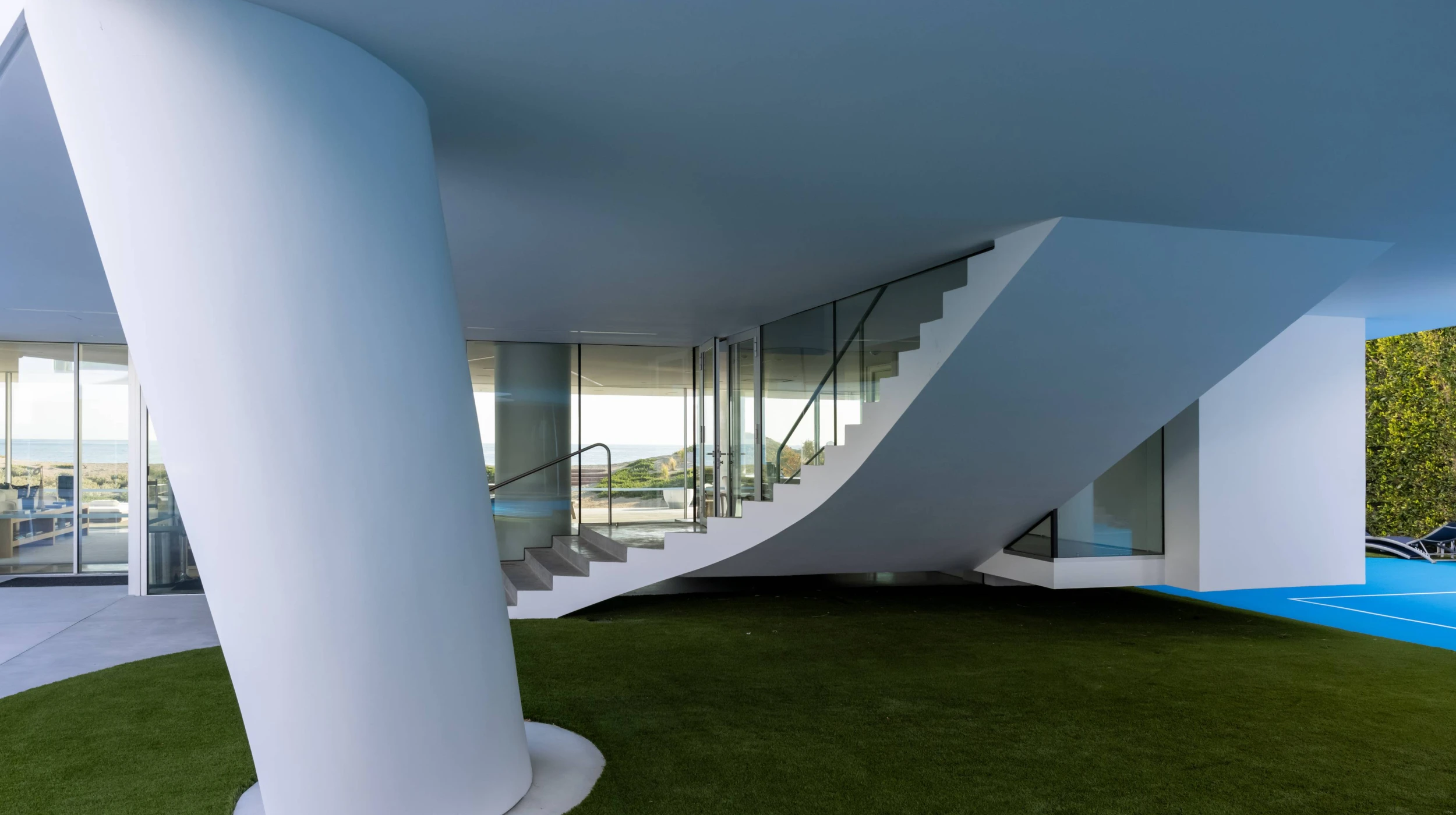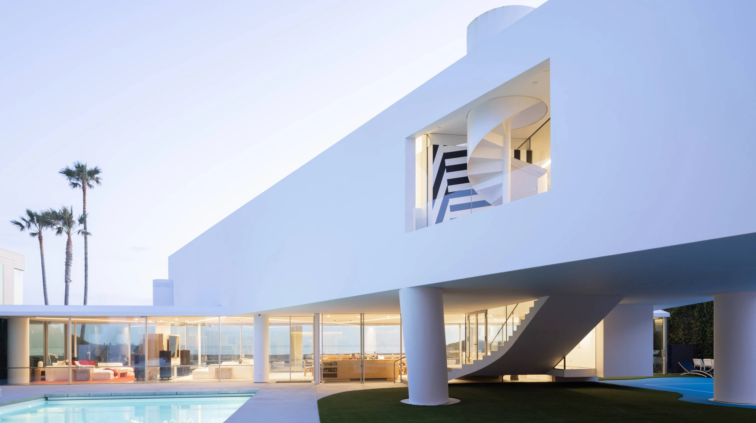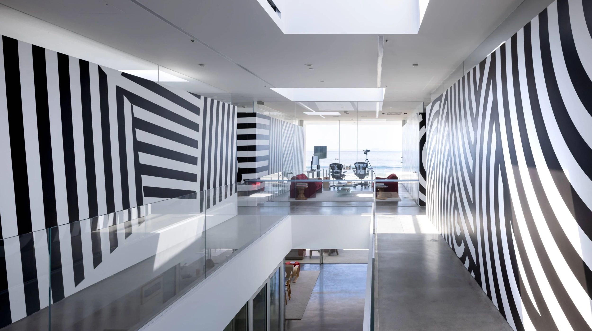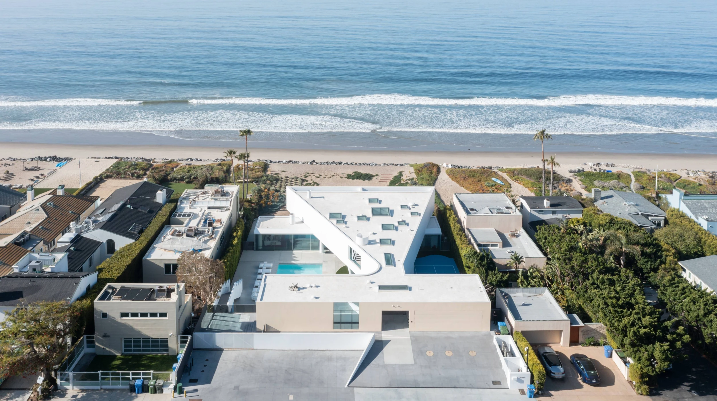 This 10,700 square foot, two story residence is situated on a beachfront site sloping toward the Pacific Ocean. It is arranged on two floors with an upper level at street-level and a lower level partially below-grade where the topography is higher. The lower level’s built areas are confined to the site’s eastern and western edges, creating large exterior spaces including a swimming pool and basketball court. The upper level is triangular in plan, telescoping to maximize ocean views. It is supported by the lower-level volumes’ vertical structure, consisting of concrete retaining walls and steel columns, and larger, clad exterior steel columns. The upper-level floor and roof framing consists of a primary steel frame with timber joist infill framing.
