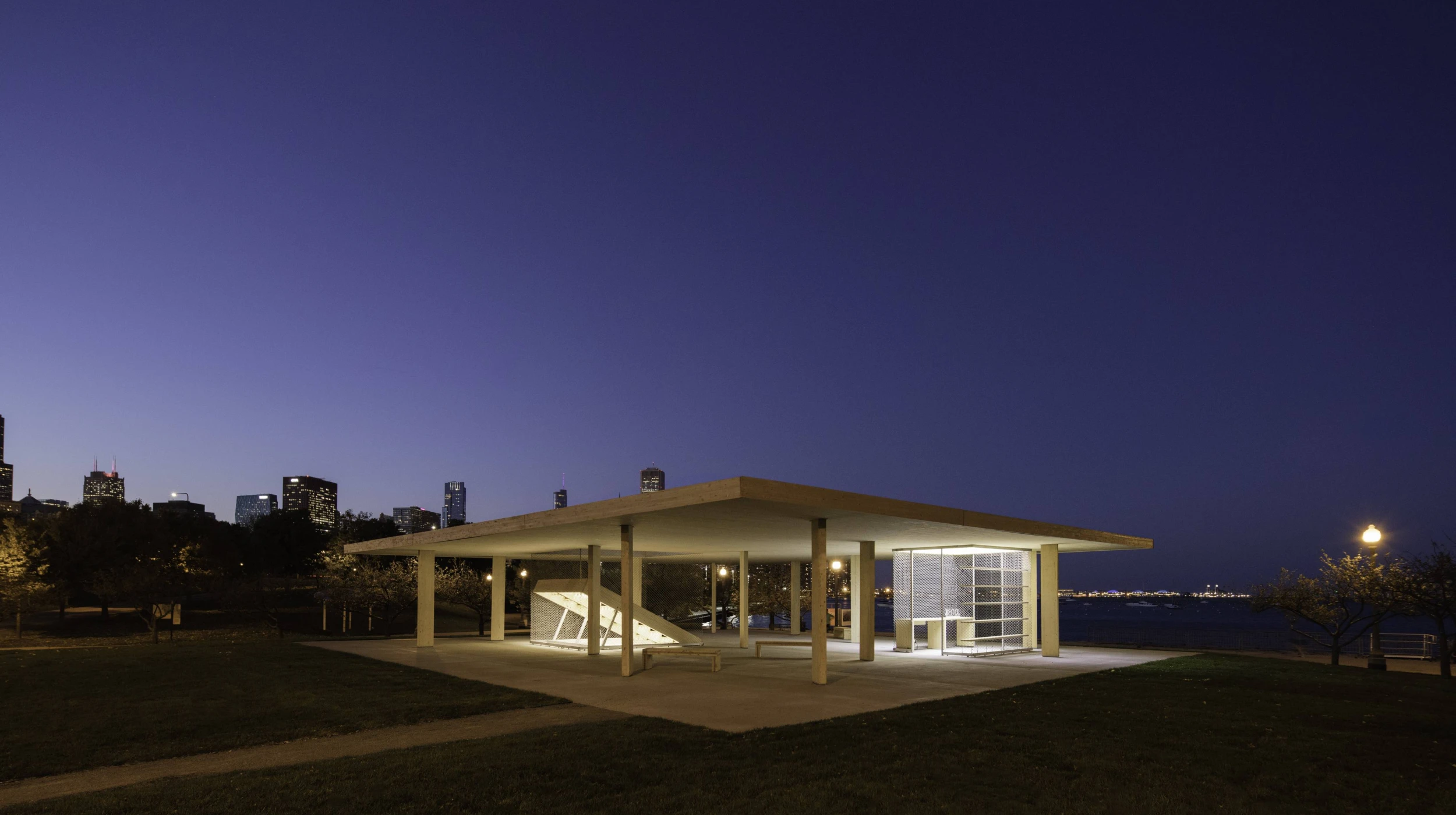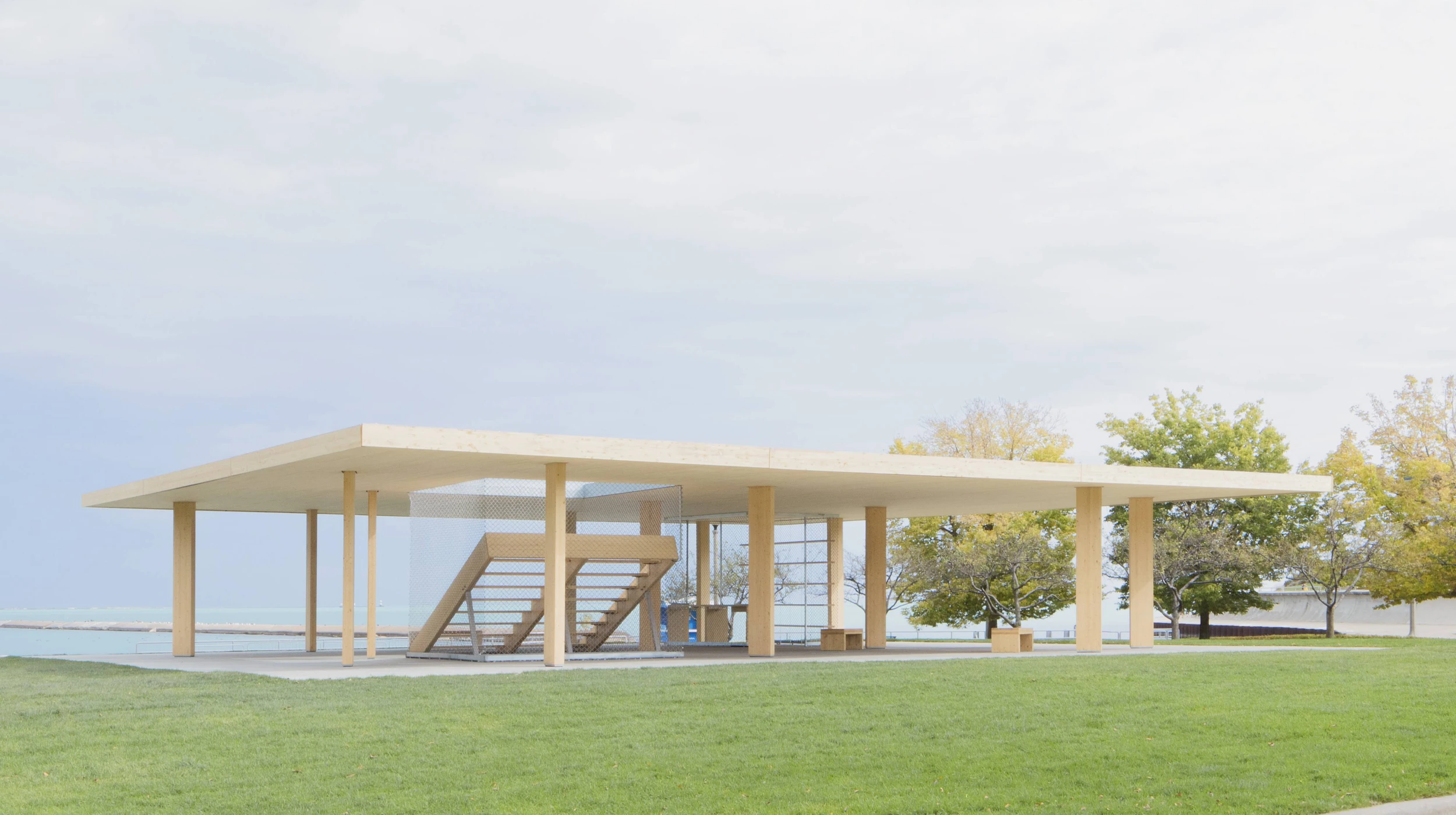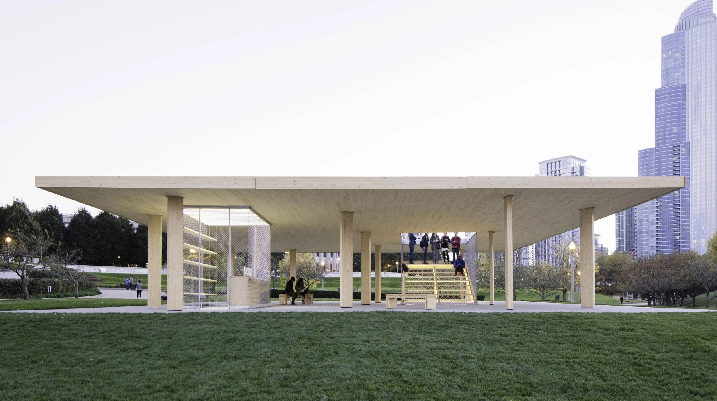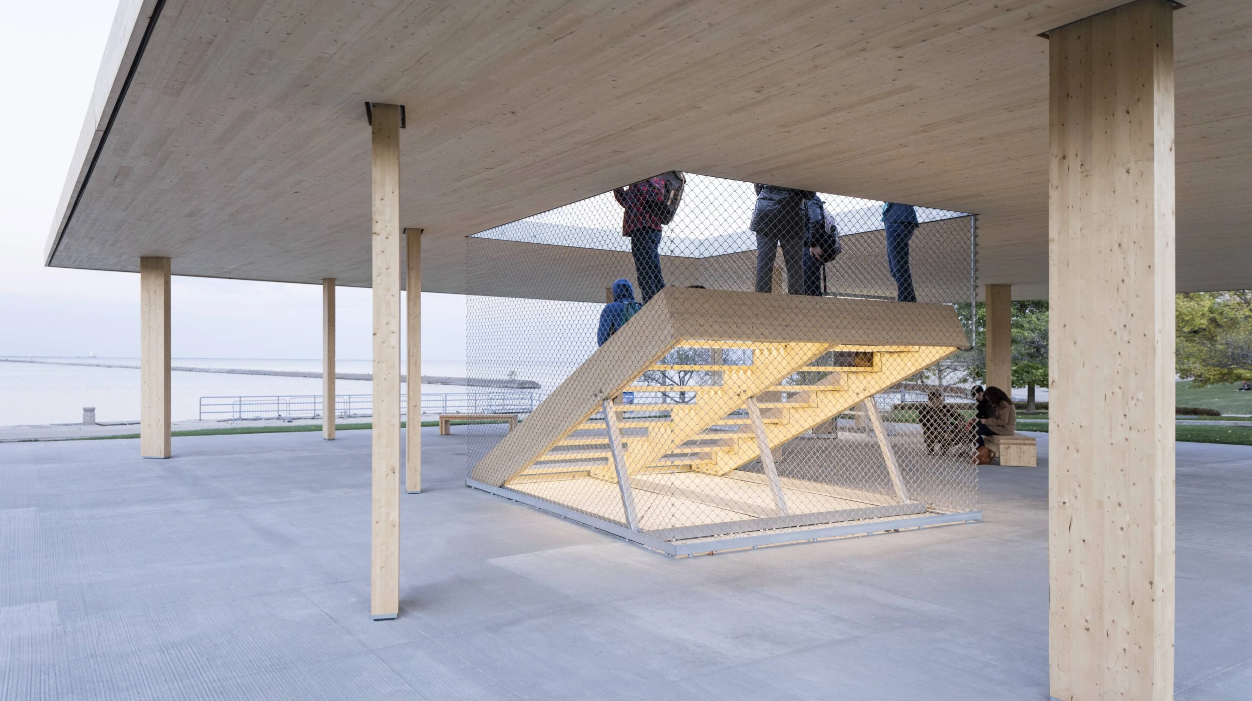Chicago Horizon provides shade and a unique view to the city and Lake Michigan from Chicago’s Millennium Park. The pavilion is the winner of the BP Prize in the Chicago Lakefront Kiosk Competition for the inaugural Chicago Architecture Biennial.