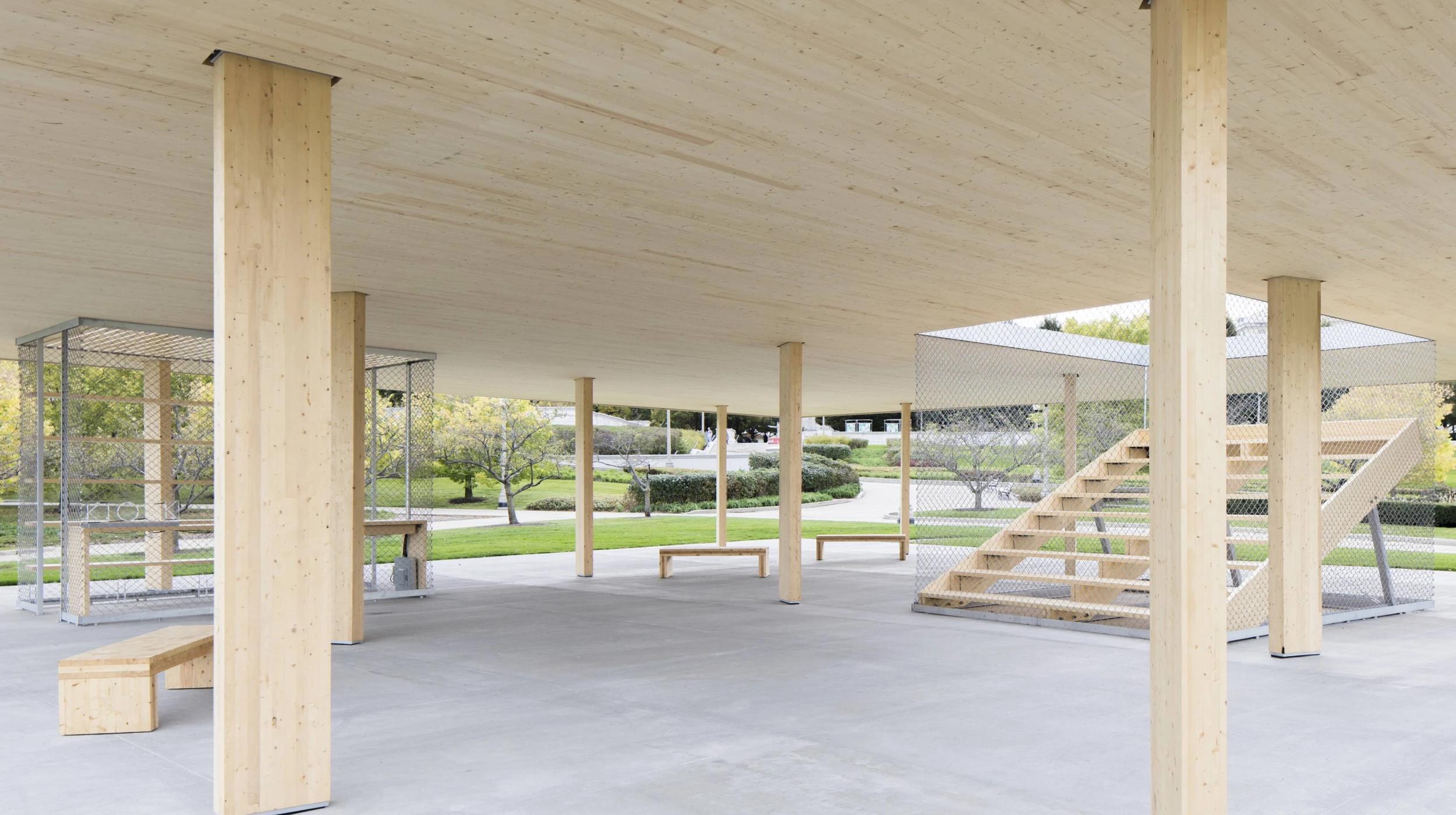 The pavilion roof structure applies flat plate construction (typical to concrete) to wood. Two perpendicularly arranged layers of cross laminated timber (CLT) panels carry bending in the panel’s long direction. The perpendicular layers above and below provide shear and moment transfer between adjacent panels. The result is a thin 8.25in two-way spanning roof structure that spans approximately 30ft between columns. The columns are simple glued laminated sections, held off the ground by a steel plate and reinforced neoprene pad. The columns pass through slots in the roof panels to a horizontal circular steel plate, which connects to the top of the panels to hang the roof and provide an uninterrupted soffit.