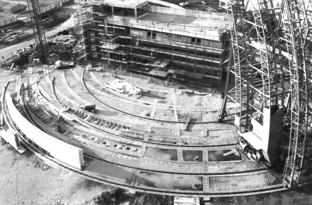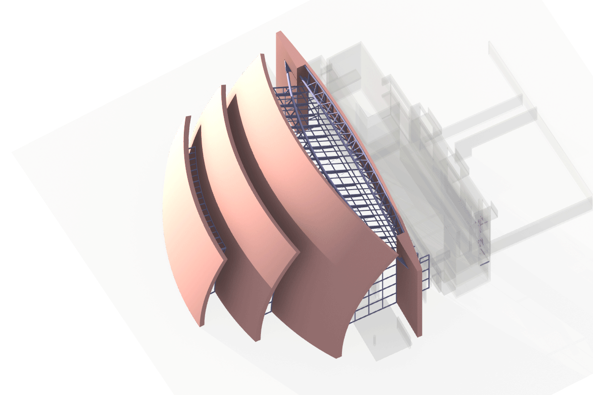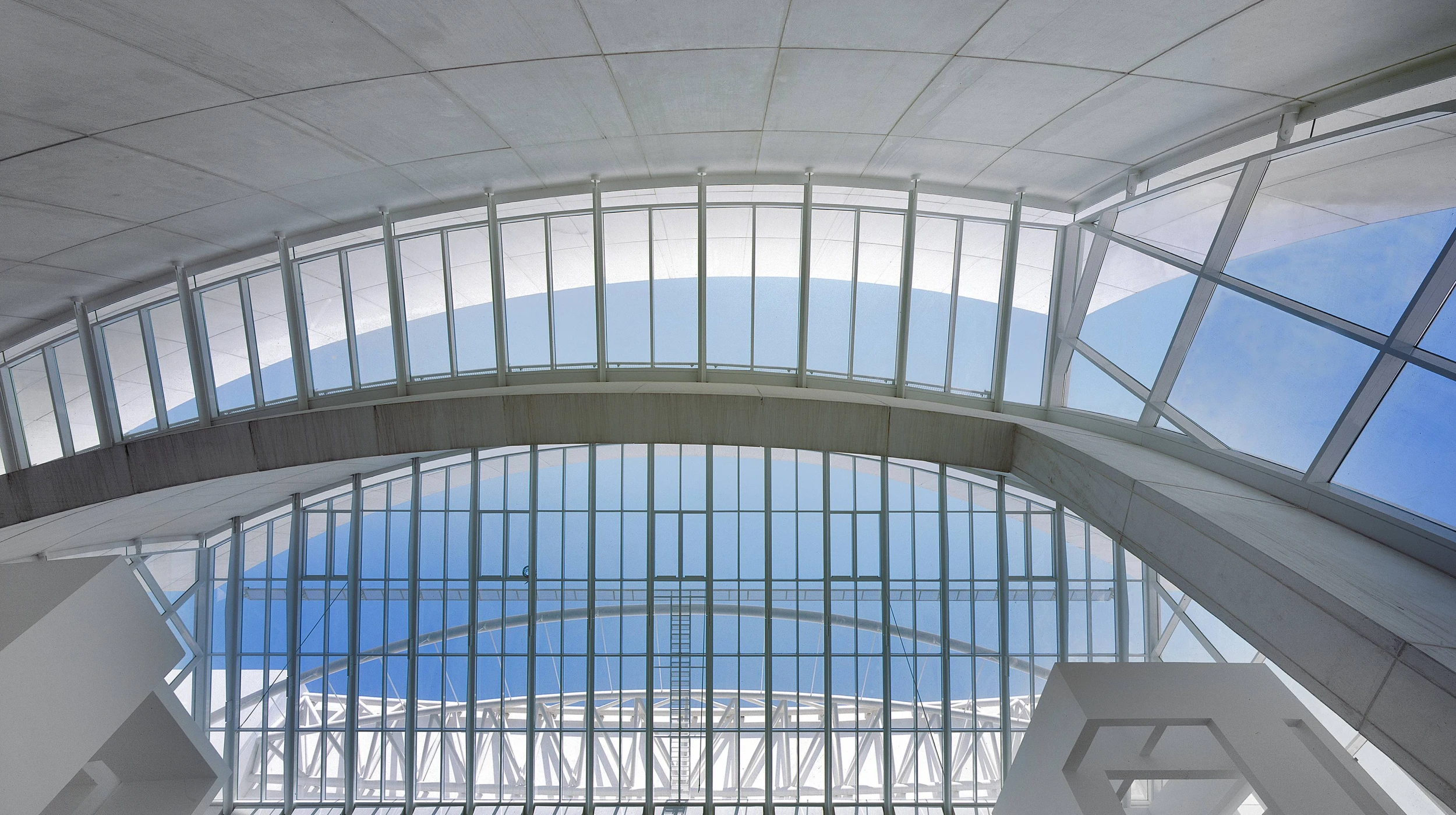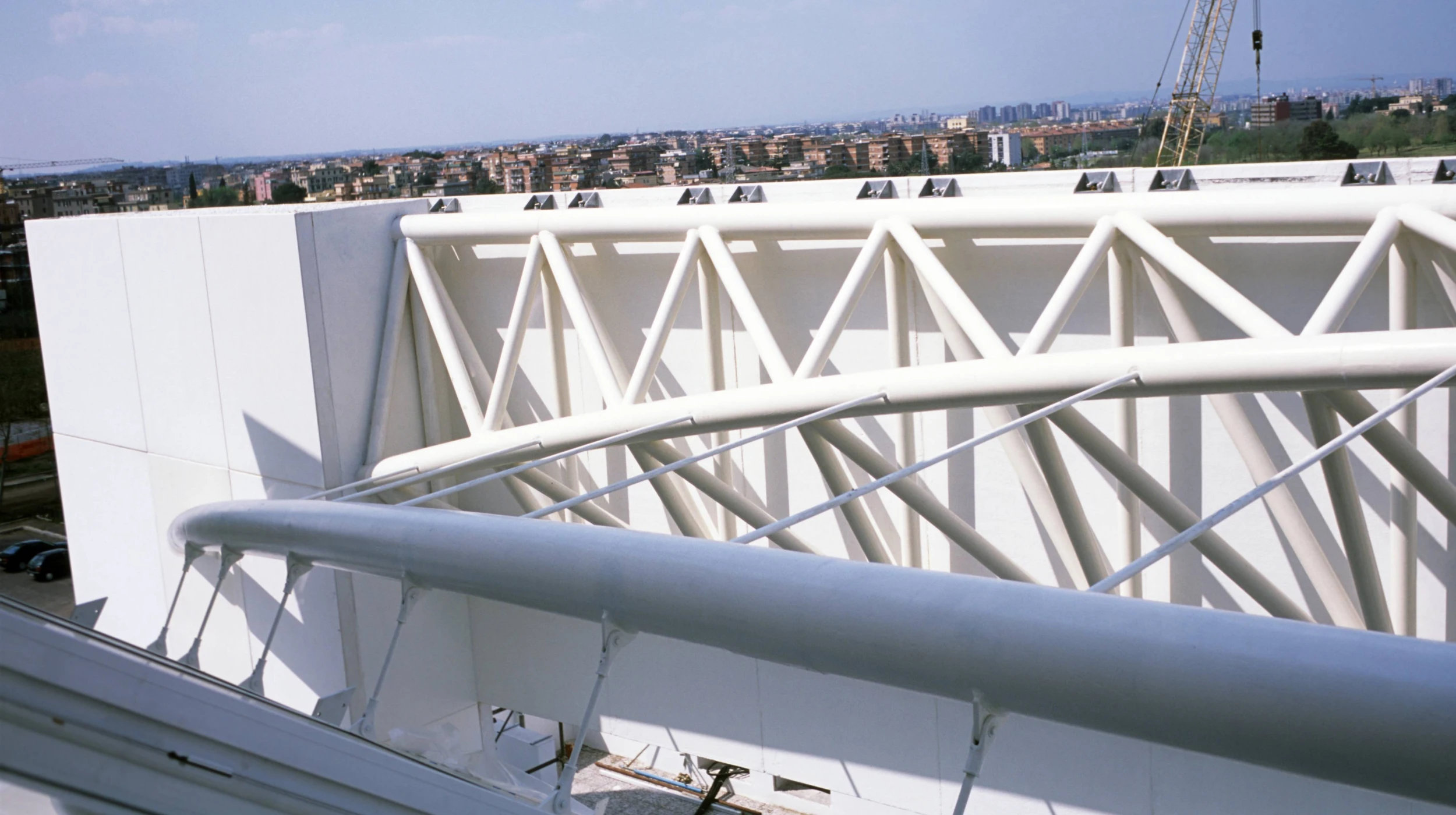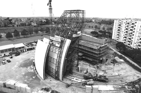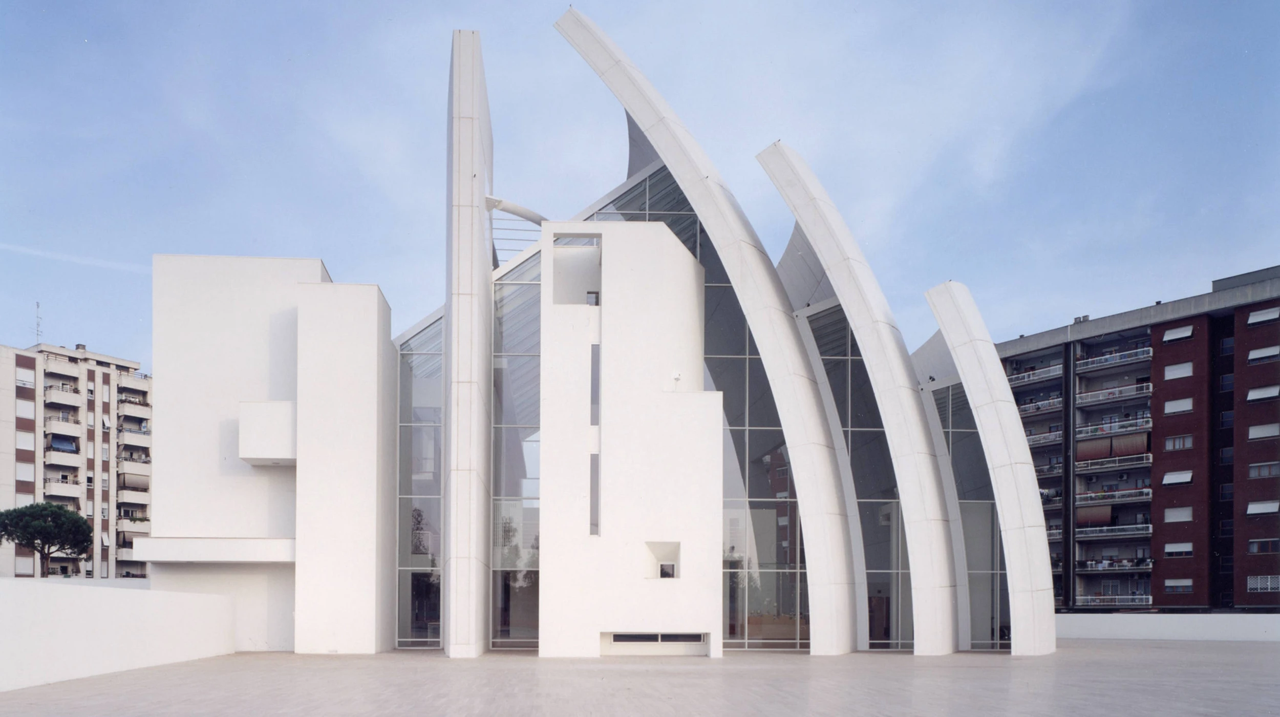 This is a competition-winning scheme for a church to commemorate the jubilee year 2000. It is located in Tor Tre Teste, just outside of Rome. The project is unique both in the form and the tectonics. The three ‘shells’ are all cut from the same approximately 38m radius sphere and built from precast concrete blocks 80cm thick by 3m tall by 2m wide. The blocks are cut from the sphere along ‘horizontal’ radial joints and true vertical minor circle joints. These vertical joints occur at varying angles to the surface so that the blocks are only identical on a vertical stack. The detailed design of the shells is by Italcementi, the Italian concrete supplier and fabricator. This was inspired by both the Roman use of large stone blocks and the more recent use of prefabricating blocks by Pier Luigi Nervi. It took little to convince the Italian engineers and contractors to adopt this approach. The glass roof of the church is supported by an exposed steel leaning arch, truss, and rafter structure.