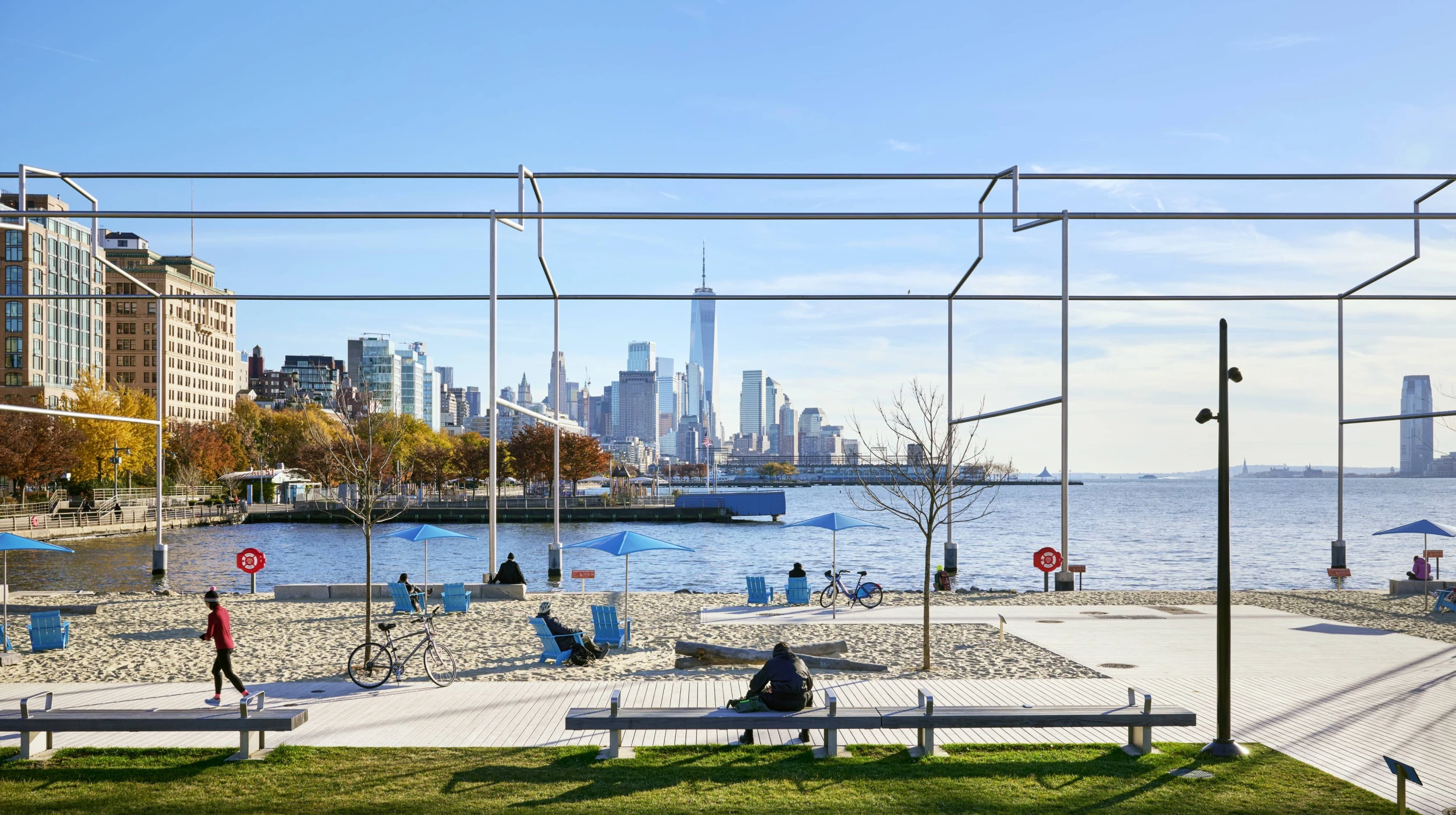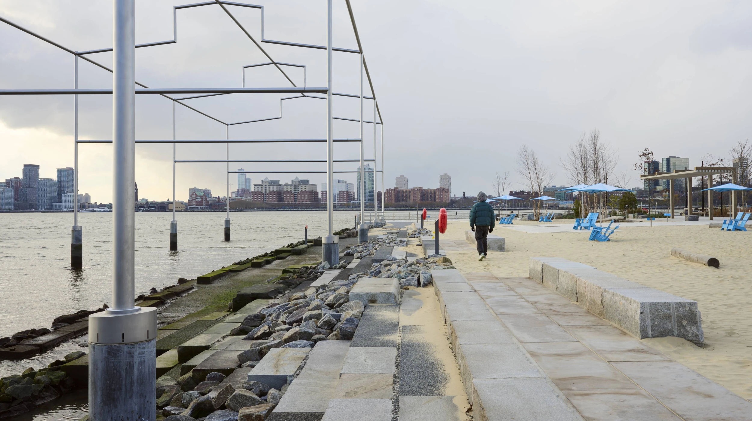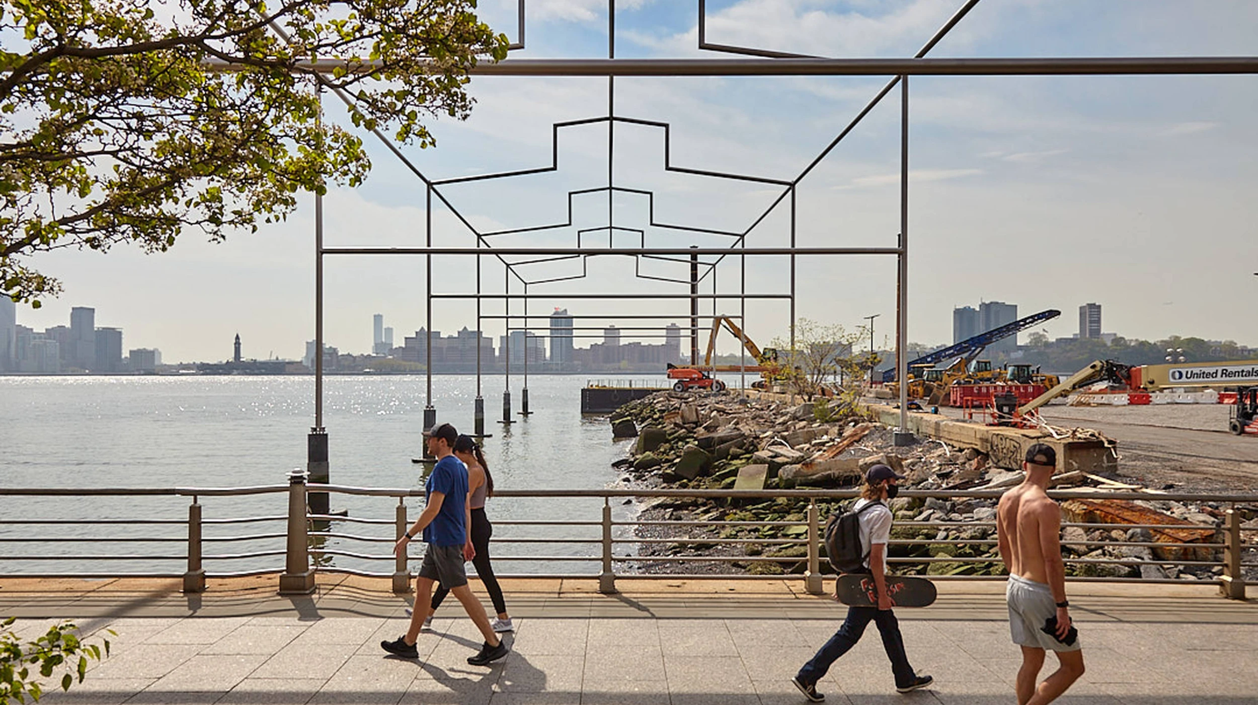 Day’s End is a permanent public art installation in the Hudson River Park. It was proposed by New York City artist David Hammons in collaboration with the Whitney Museum of American Art. The structure is conceived as a “ghost monument” to the celebrated work of the same name by artist Gordon Matta-Clark, who cut giant openings into the since demolished Pier 52 building. Hammons’ work—a minimal, ethereal frame—outlines a place that no longer exists. It raises important questions about the waterfront, inviting viewers to consider the social, cultural, economic and environmental history that it represents.