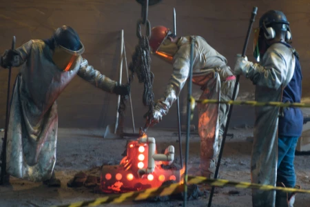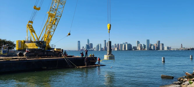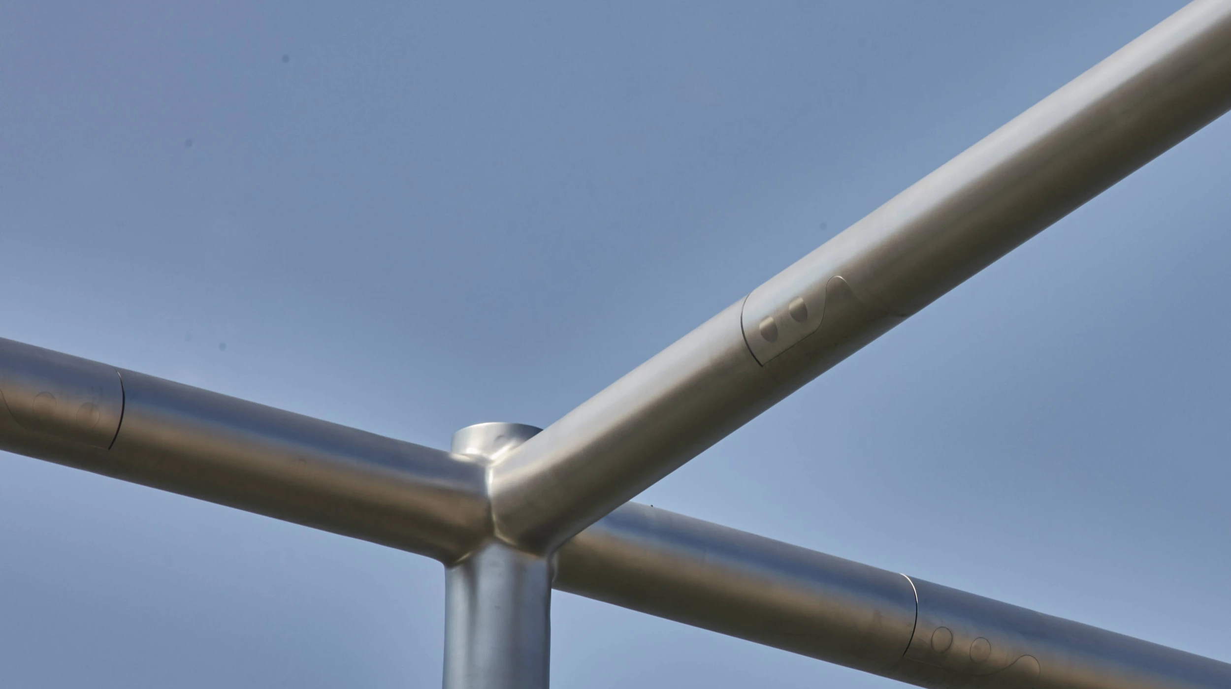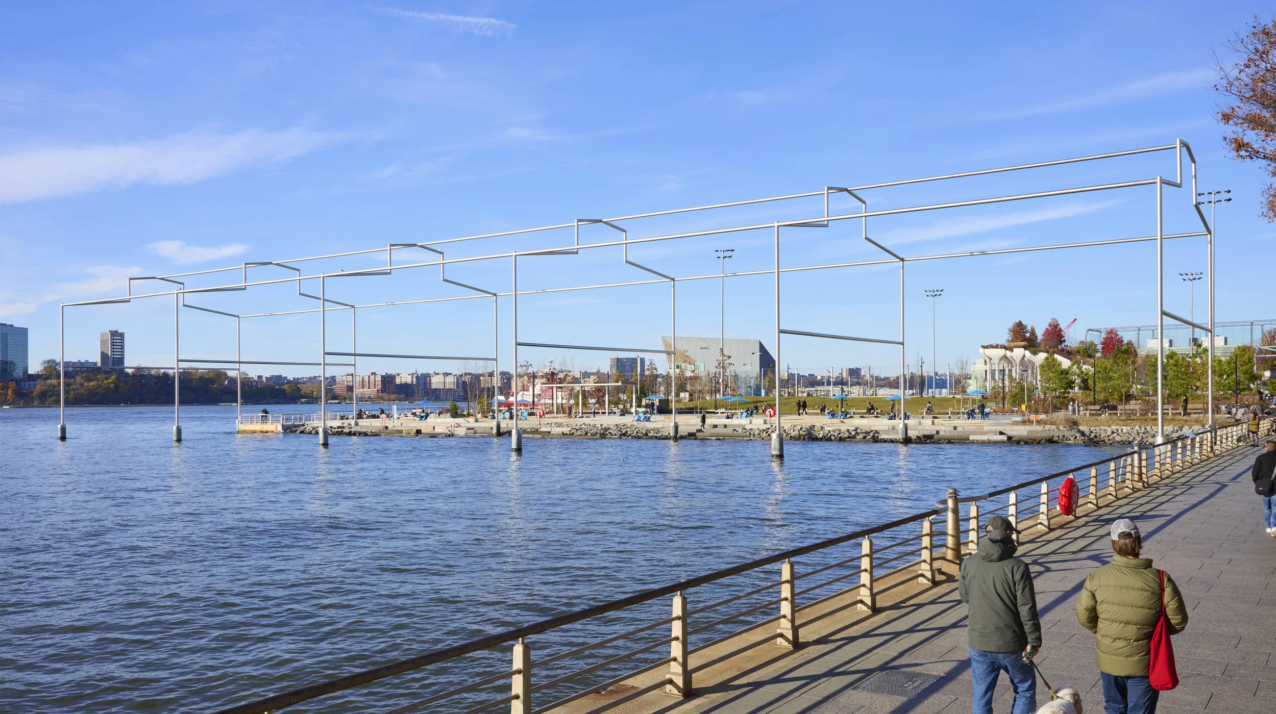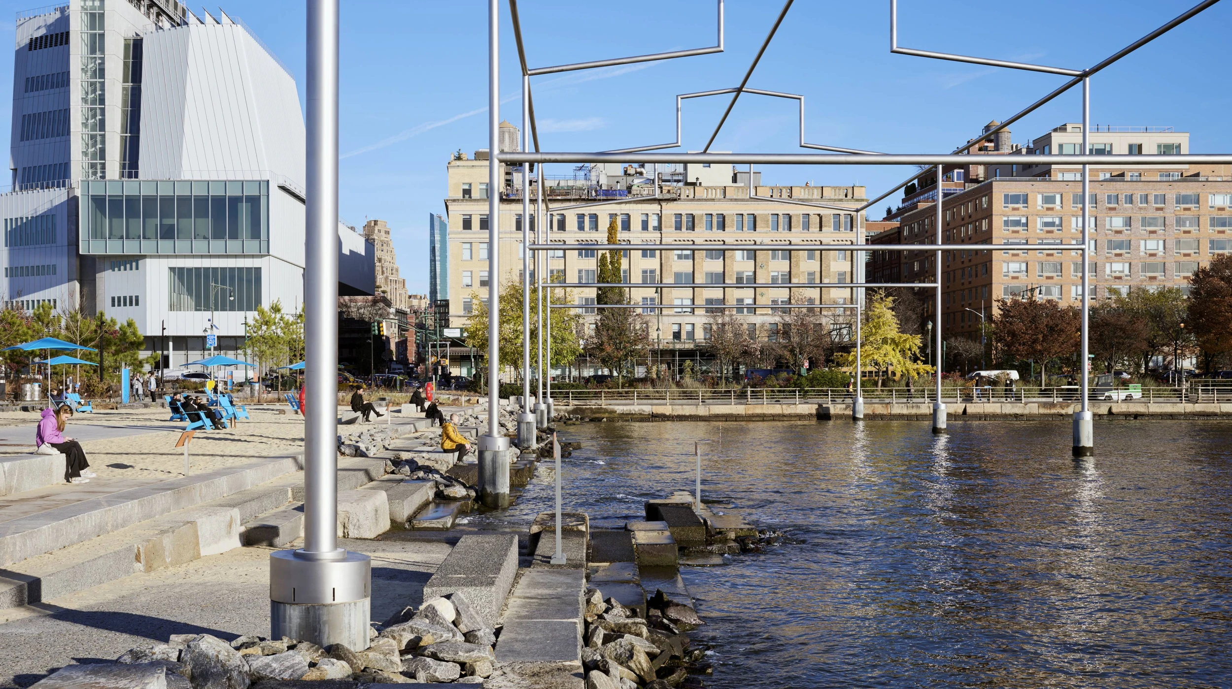 Through a close collaboration with David Hammons, the stainless steel structure has been developed with as few elements as possible. Slender 8in beams span 65ft and create a light, open frame that tends to disappear in the sculpture’s busy urban context. All of the structural elements were prefabricated and brought to the site in large sections where they were mechanically connected. Corrosive Hudson River waters, sea level rise and future storm scenarios were important considerations in the structure’s design and detailing.