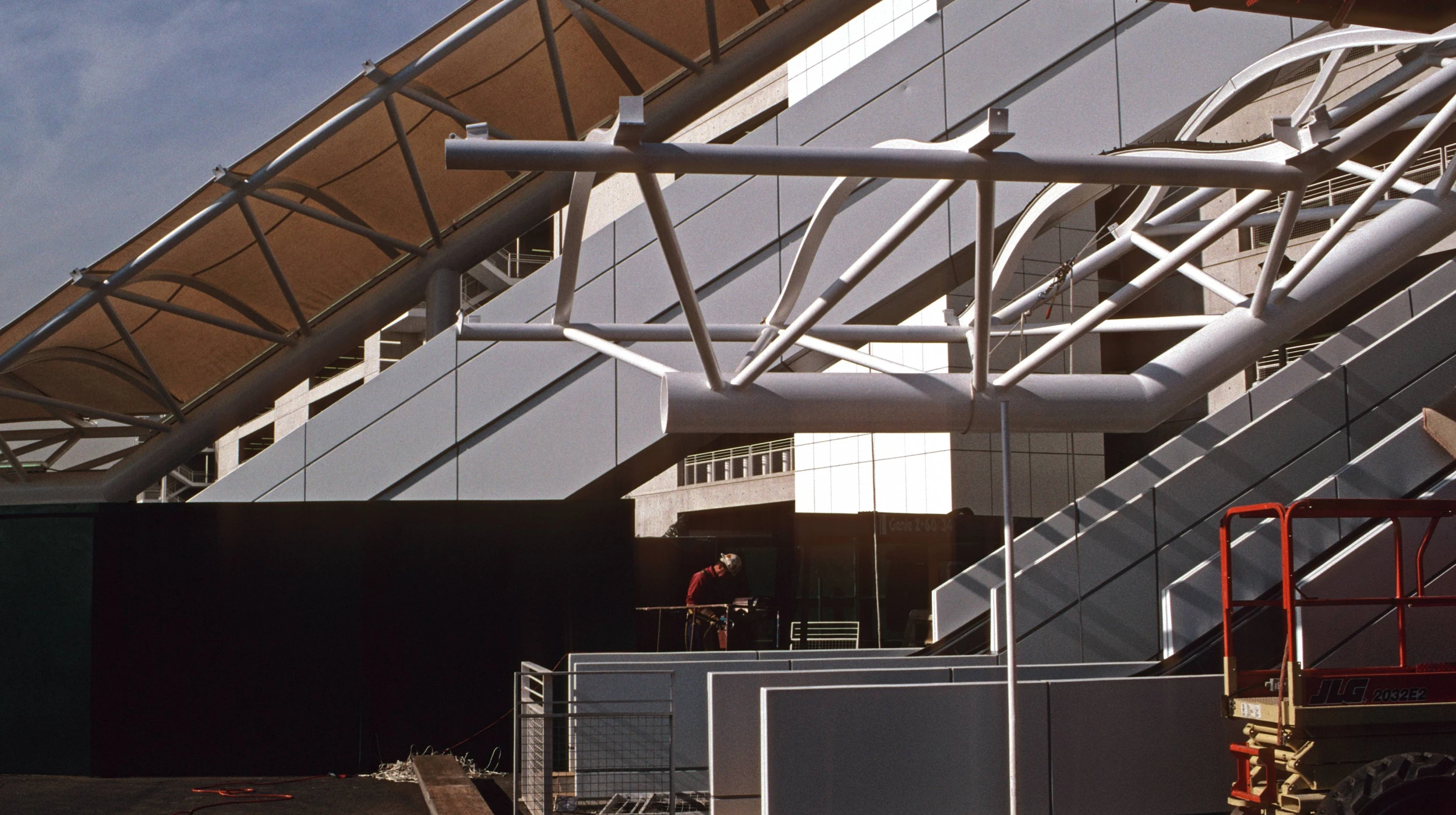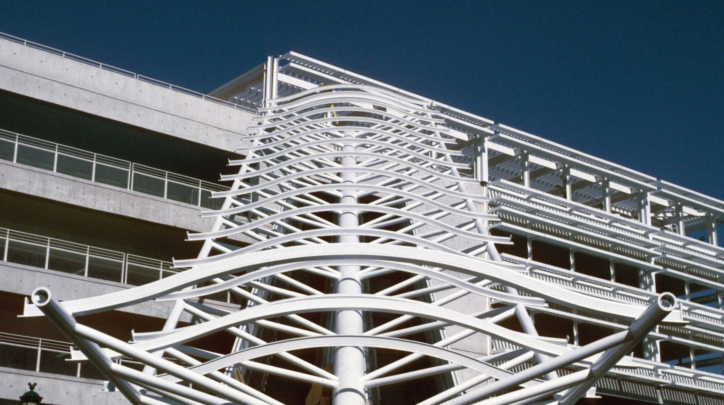 The Disneyland Parking Structure, with a capacity for 10,250 cars, was the first major project undertaken by Guy Nordenson and Associates at the office’s inception in 1997. In 2000 GNA designed and engineered steel and fabric canopies for three exterior escalators connecting to the garage at the fifth, third, and second floors. Each canopy consists of a steel truss spanning clear from the face of the parking structure to a single post at ground level and cantilever at the ends. The trusses are three-dimensional, with a large central spine pipe bottom chord connected to the two smaller steel pipe top chords with small pipe ribs. The top chords support doubly curved arches that are the armature for the fabric membrane. The top ends of the trusses are attached to roller supports that allow the trusses to move independently of the parking structure in a seismic event. The canopies were designed, fabricated, and erected in just six months to maintain the scheduled opening date of the parking structure.