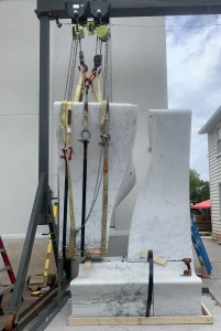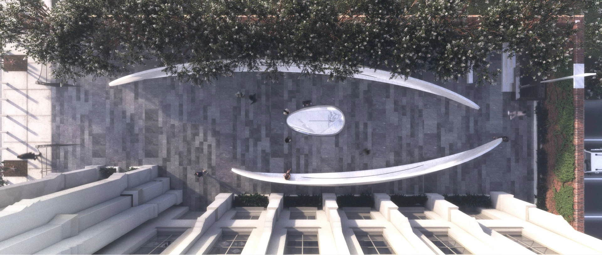 GNA has worked with Handel Architects to develop the structural design of the marble fellowship benches, the memorial fountain and other site structures. The solid marble benches are roughly oval-shaped in elevation, with their height peaking at 9.5ft. They are concave in section to provide a bench seat at the bottom and slight cover overhead. The benches’ arched plan configuration embraces the memorial fountain between them, and they are approximately 63ft and 80ft in length. Each bench is made up of a series of marble blocks, and GNA worked with the team to shape the stone elements so that they support each other. Each block nests into the next through a spiral joint, producing an interlocking effect between the blocks. The engagement of all the blocks working together is what makes the bench stable as a whole.