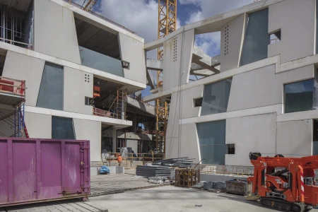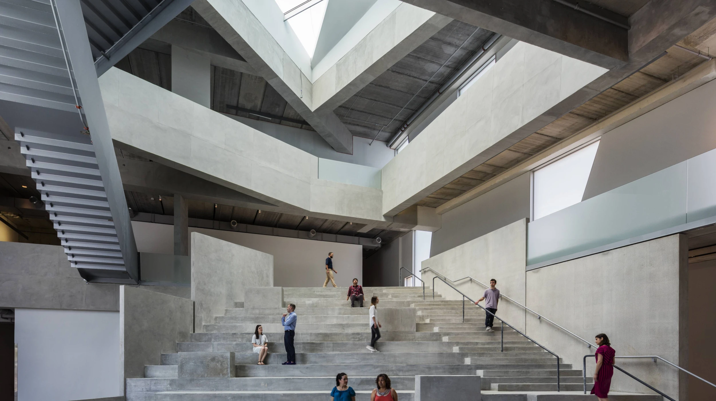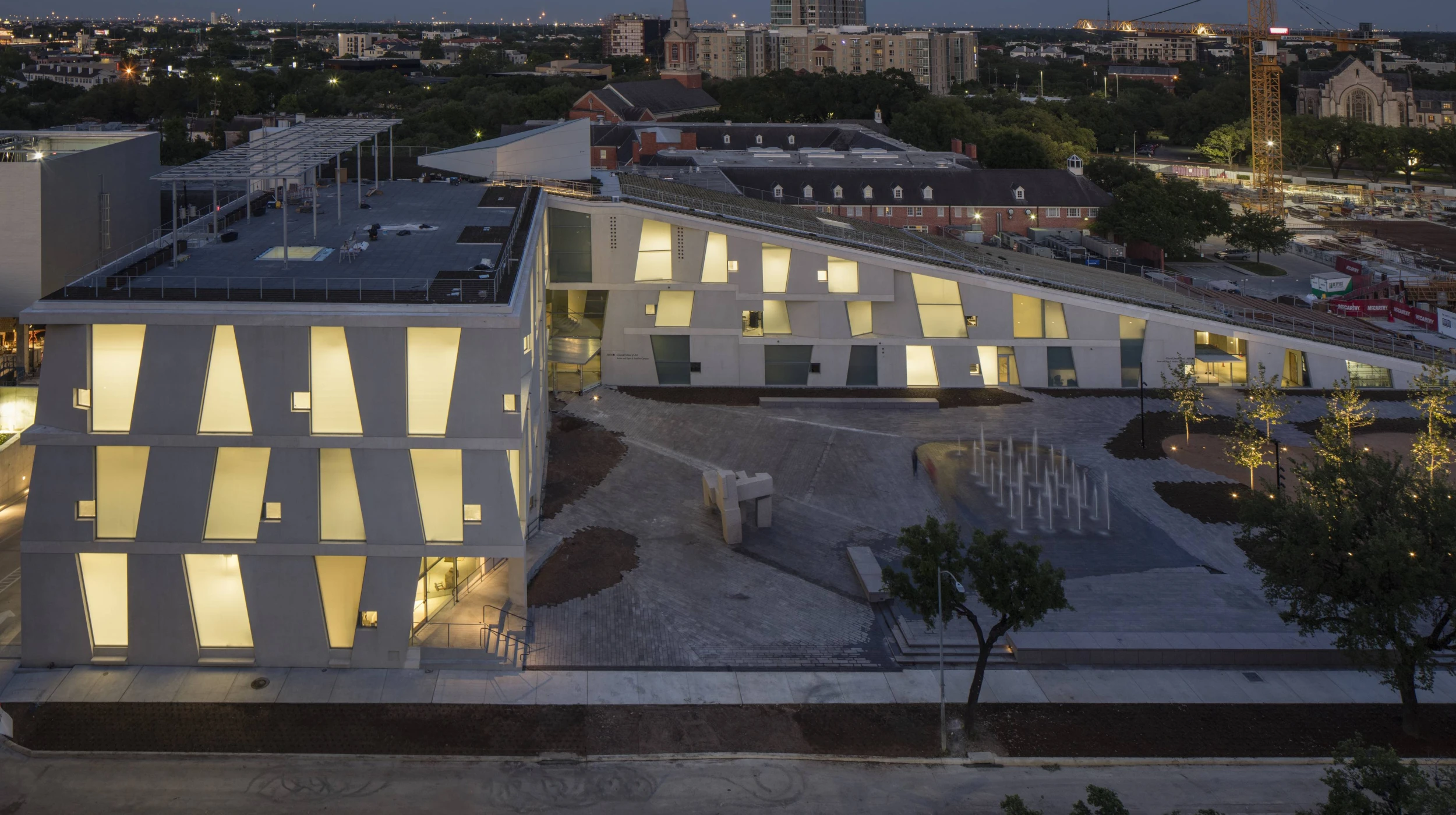 The new 93,000sf Glassell School of Art provides classroom, studio, exhibition, and lecture space, doubling the program size of its previous building, as part of the 14-acre campus expansion of the Museum of Fine Arts, Houston (MFAH). The L-shaped building is constructed from a series of sandblasted, exposed structural precast concrete panels. The perimeter consists of 178 wall panels varying in size and geometry with full-height glazed panels in between. Exposed precast hollowcore concrete planks span between cast-in-place concrete perimeter beams to form the floor system. A series of folded steel plate stairs crisscross the school’s triple-height entry forum, clear spanning between the perimeter beams at each floor level. Precast concrete planks support the school’s sloped green roof with integrated amphitheater seating. A continuous stairway allows public roof access for unobstructed views of the MFAH campus and greater Houston.