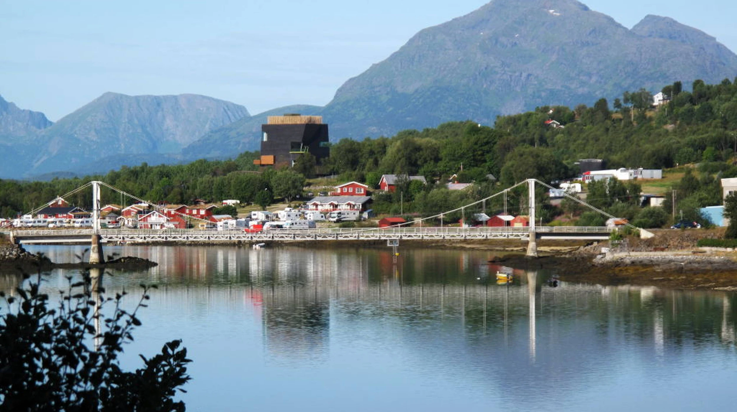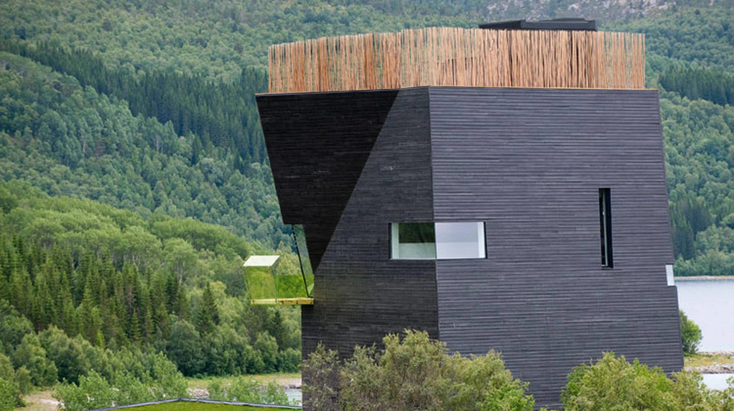 Dedicated to the Norwegian writer, the Knut Hamsun Center is a 24,445sf museum located above the Arctic Circle, and includes exhibition areas, a library and reading room, a cafe, and a 230 seat auditorium. The museum structure is supported by a single wall column alongside the elevator, providing support for the slabs and beams.