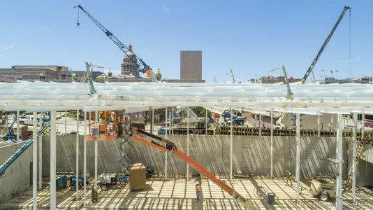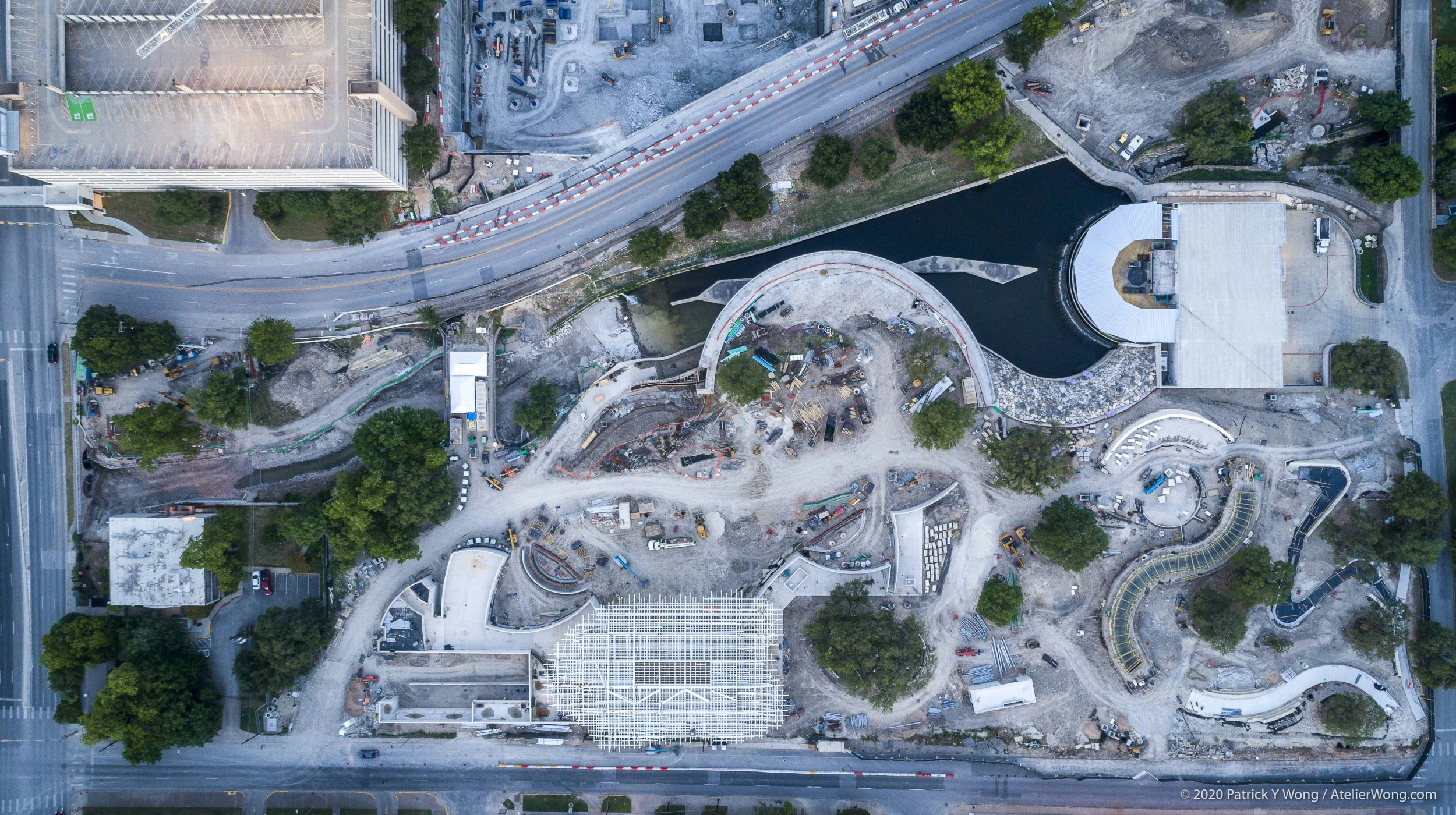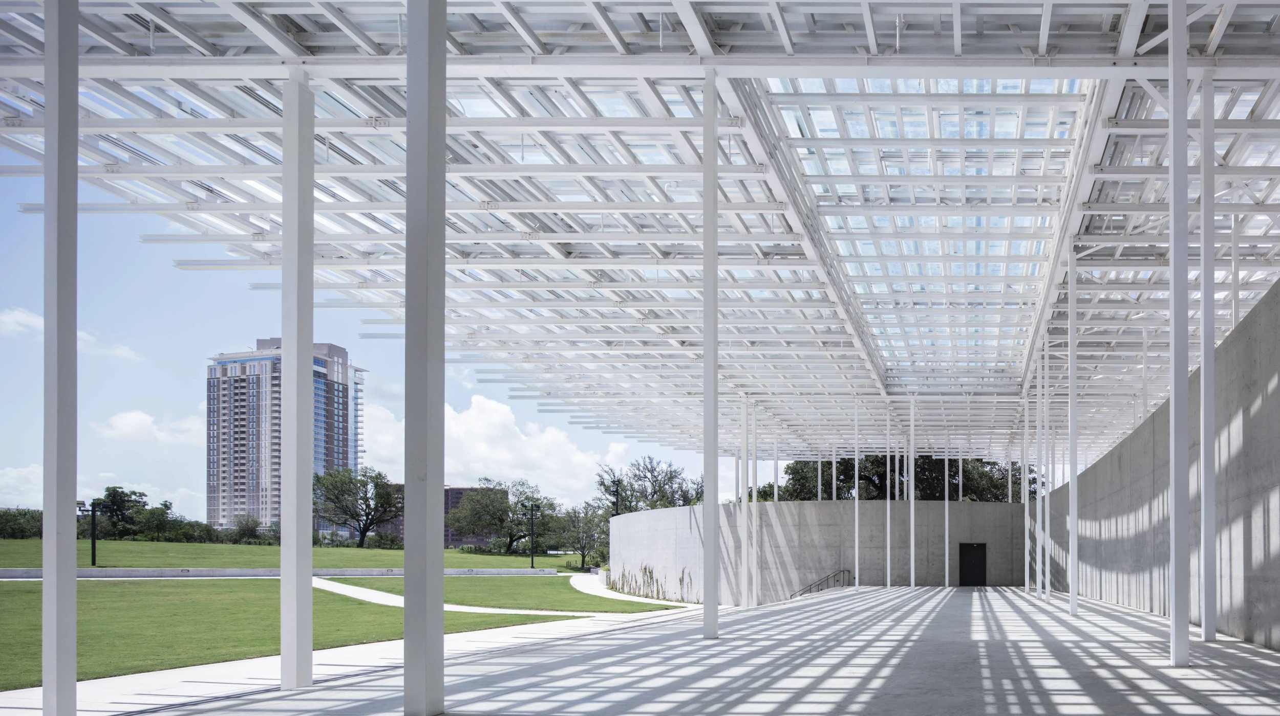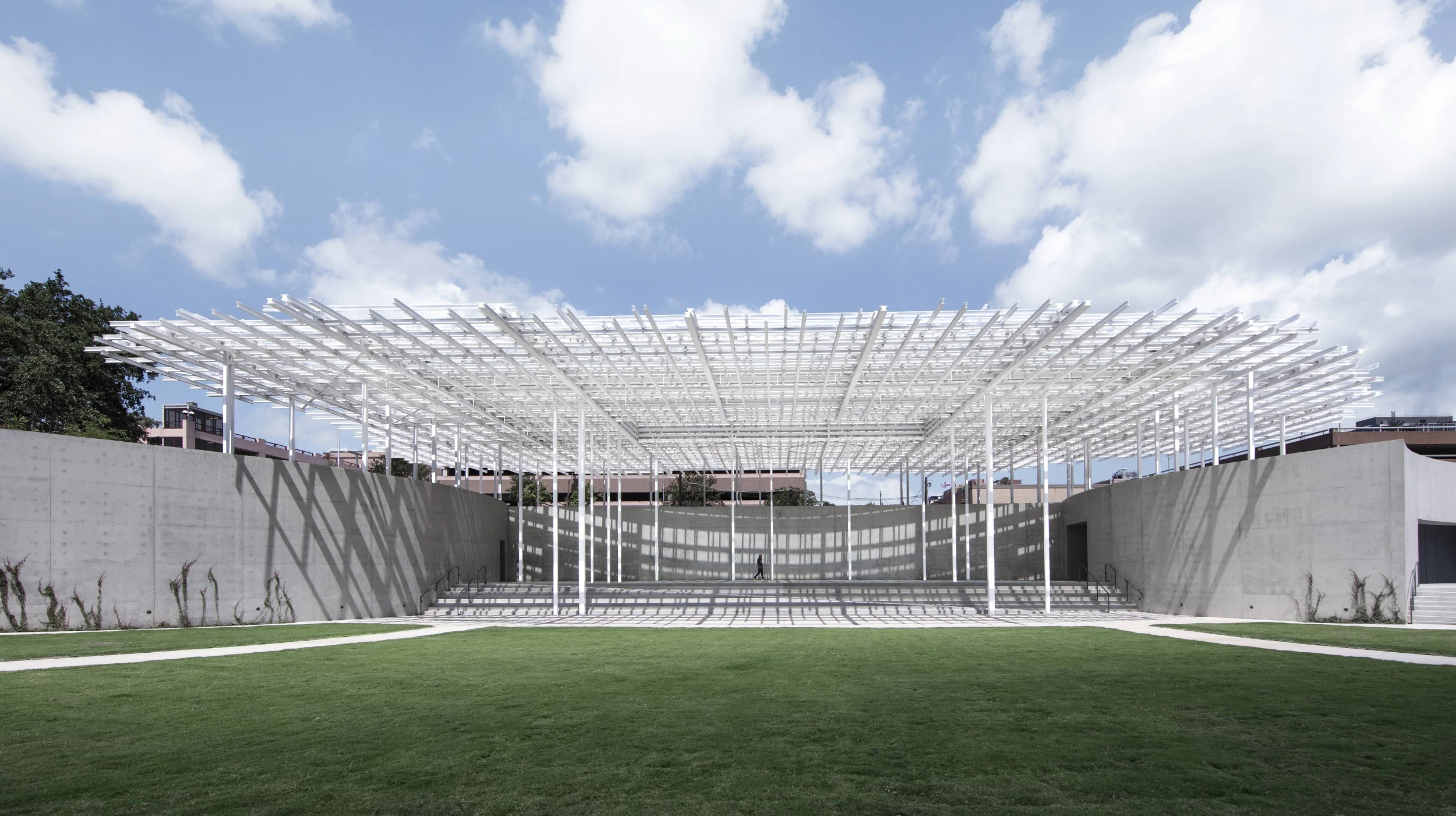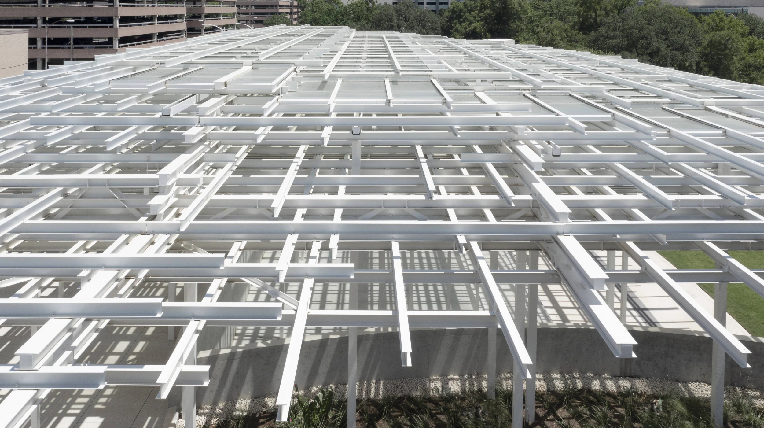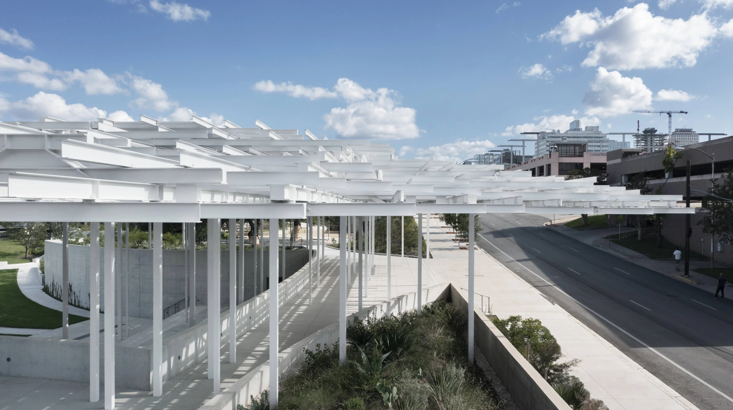 The Moody Amphitheater is an outdoor music and performing arts venue, carefully integrated with the renovated park landscape. The amphitheater’s focal point is a 20,000sf steel canopy composed of alternating layers of stacked I-beams, arranged in a denser pattern over the stage and feathered at the edges. The canopy’s structural scheme sculpturally satisfies the high stage loading requirements with a “cloud” of over 2,000 individual steel and aluminum members, supported on slender rectangular steel columns, concealing the two-way grillage of fabricated steel trusses. The canopy provides shelter to a cast-in-place concrete stage and venue support facility. The support facility’s exposed concrete walls follow the site’s curved geometry and topography. The framed concrete roof structure carries the high loading of the canopy and green roof above and incorporates mechanical systems.