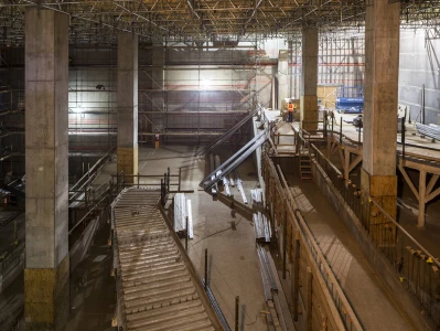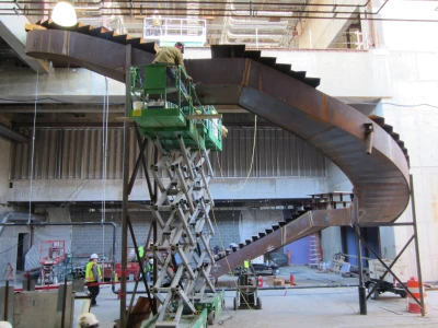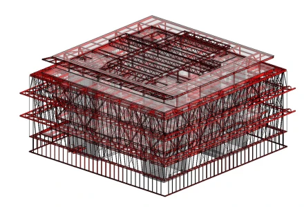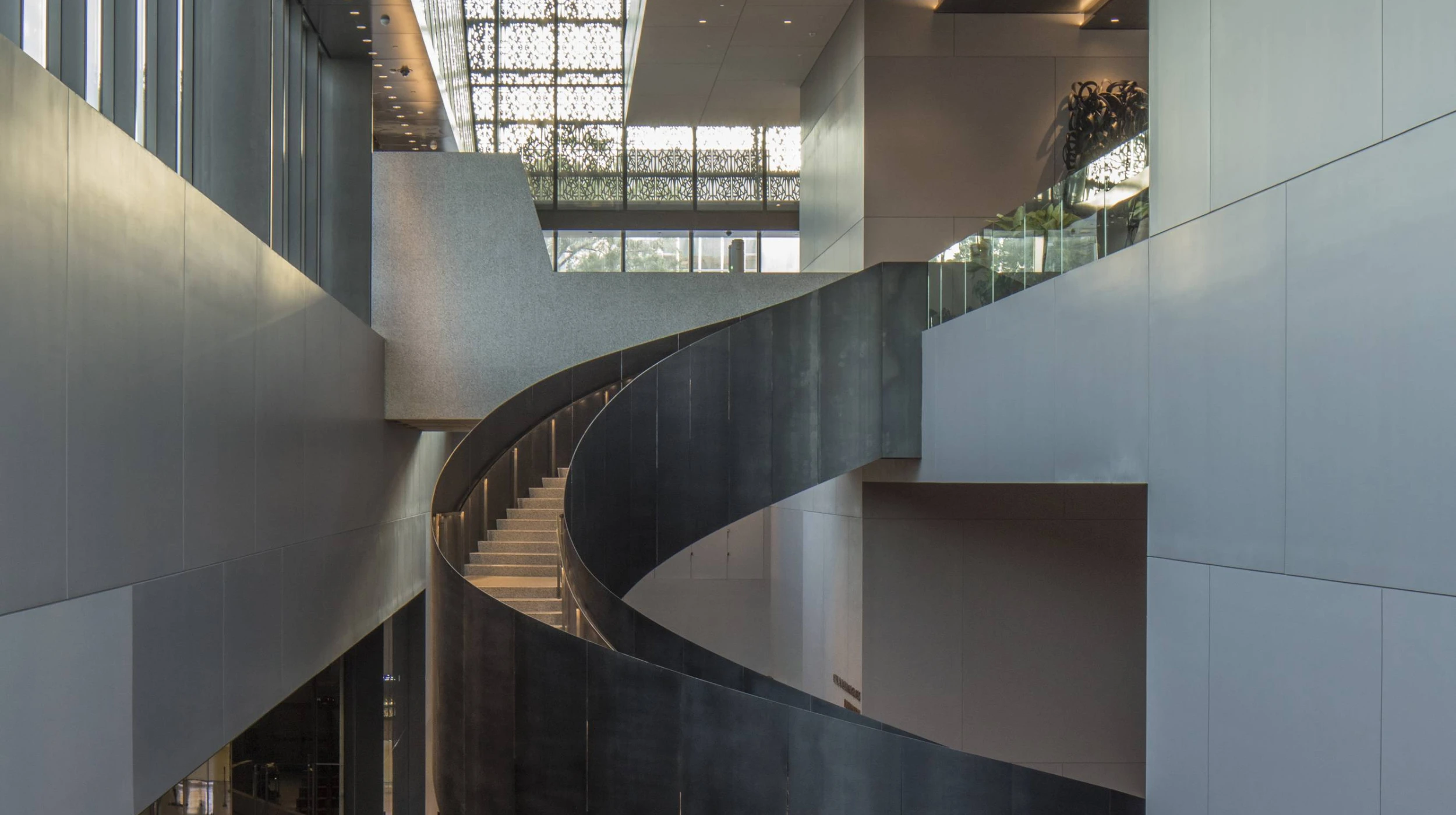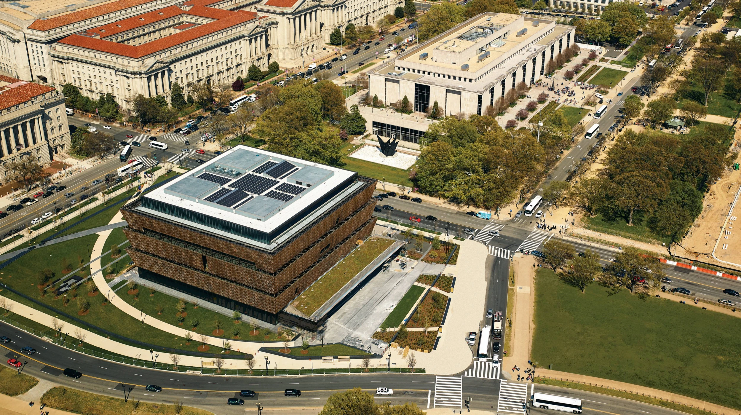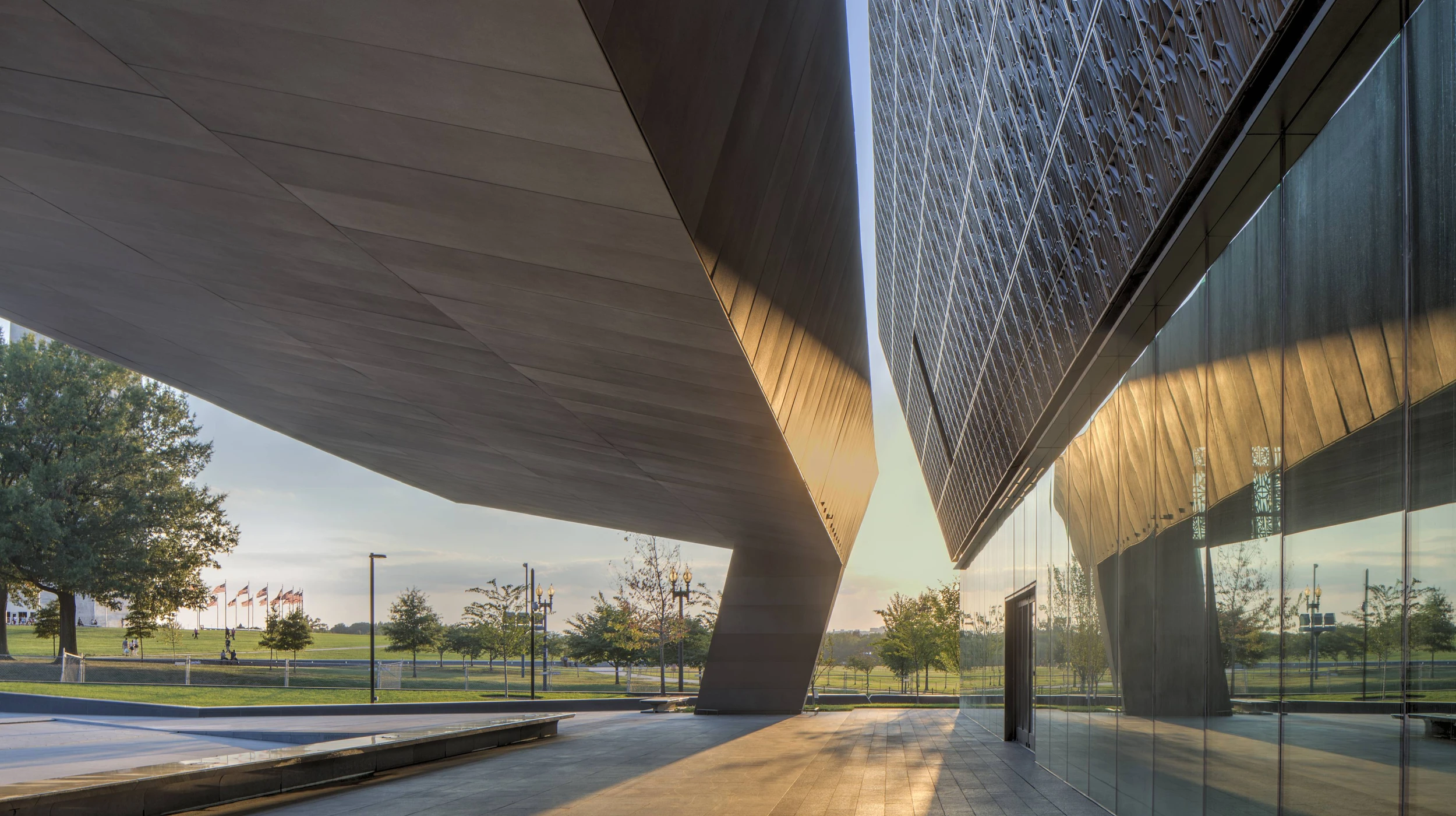 In this striking addition to the National Mall, the museum’s primary architectural gesture is its three-tiered exterior Corona screen wall. The Corona is suspended from the top of the building and forms a continuous atrium, free of structure between the façade and the inner gallery floors, allowing daylight to filter through its patterned bronze cladding and skylights. The above-grade building structure is entirely supported on four composite steel-and-concrete cores, creating an open lobby space that highlights its curved, custom ceiling. The galleries and administrative level floor framing consist of vertical steel trusses and long-span plate girders cantilevering from the central cores. At the southern entrance to the museum is a steel framed asymmetrical canopy, known as the “Porch,” which spans over 200ft between two piers. The below-grade structure is cast-in-place concrete, except for above the History Galleries. Here, long-span steel framing supports areas at grade with significant landscaping and flood loads.