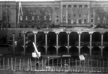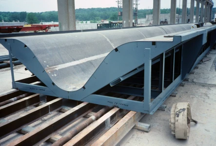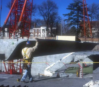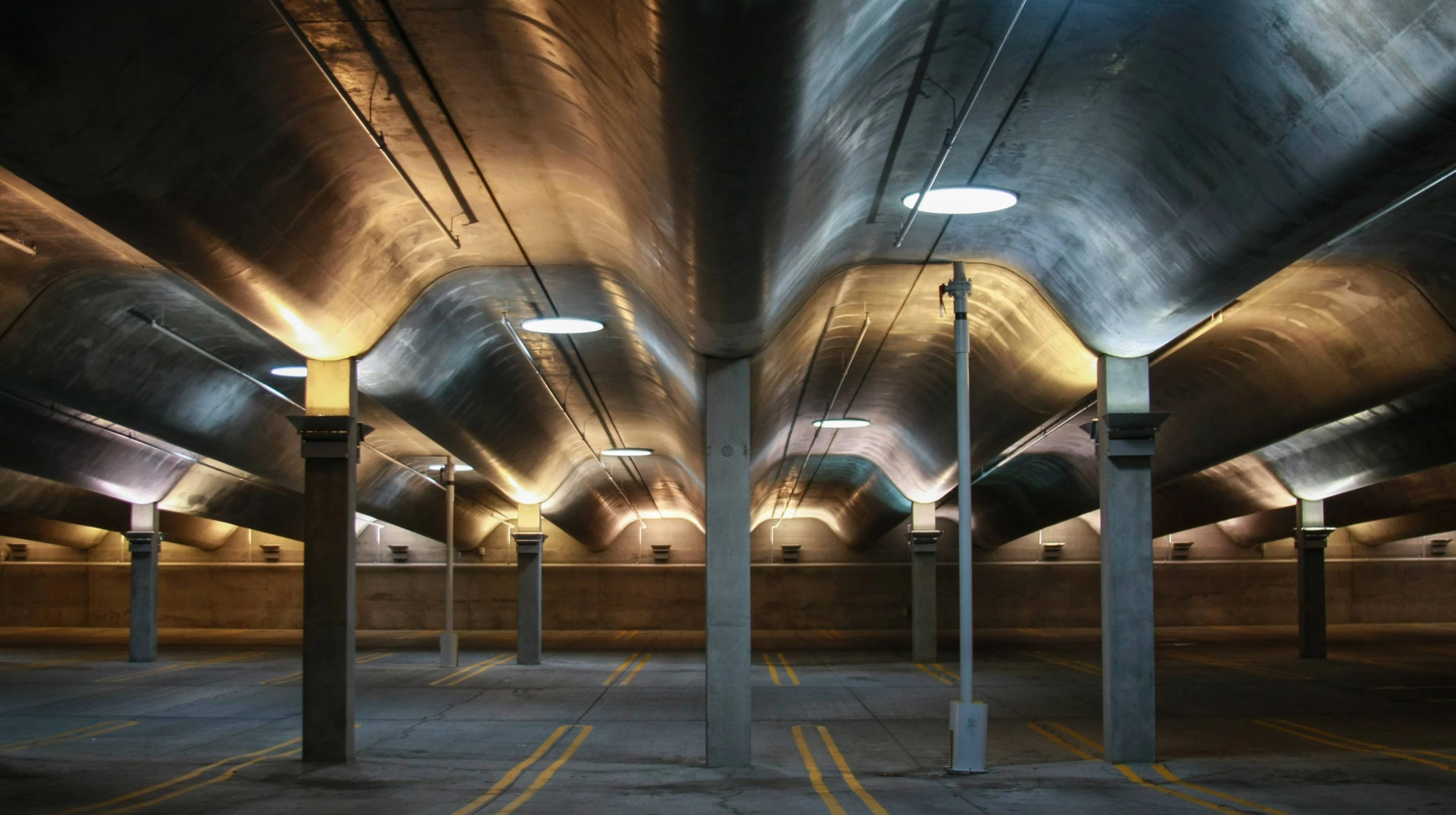 The parking garage at the Nelson-Atkins Museum of Art was added to the museum’s campus as part of its 2007 expansion. The new garage is situated underground and supports open space above for the museum entrances and the sculpture One Sun / 34 Moons by artist Walter De Maria, which includes 34 circular skylights that bring light to the parking below. The garage is formed from continuous waves made of independent “Wave T’s,” 12ft wide and 60ft long. The Wave T’s are prestressed, precast concrete beams with hollow centers. Each Wave T is independently supported on columns so that there are no cross girders to interfere with the continuity of the corrugated space.
