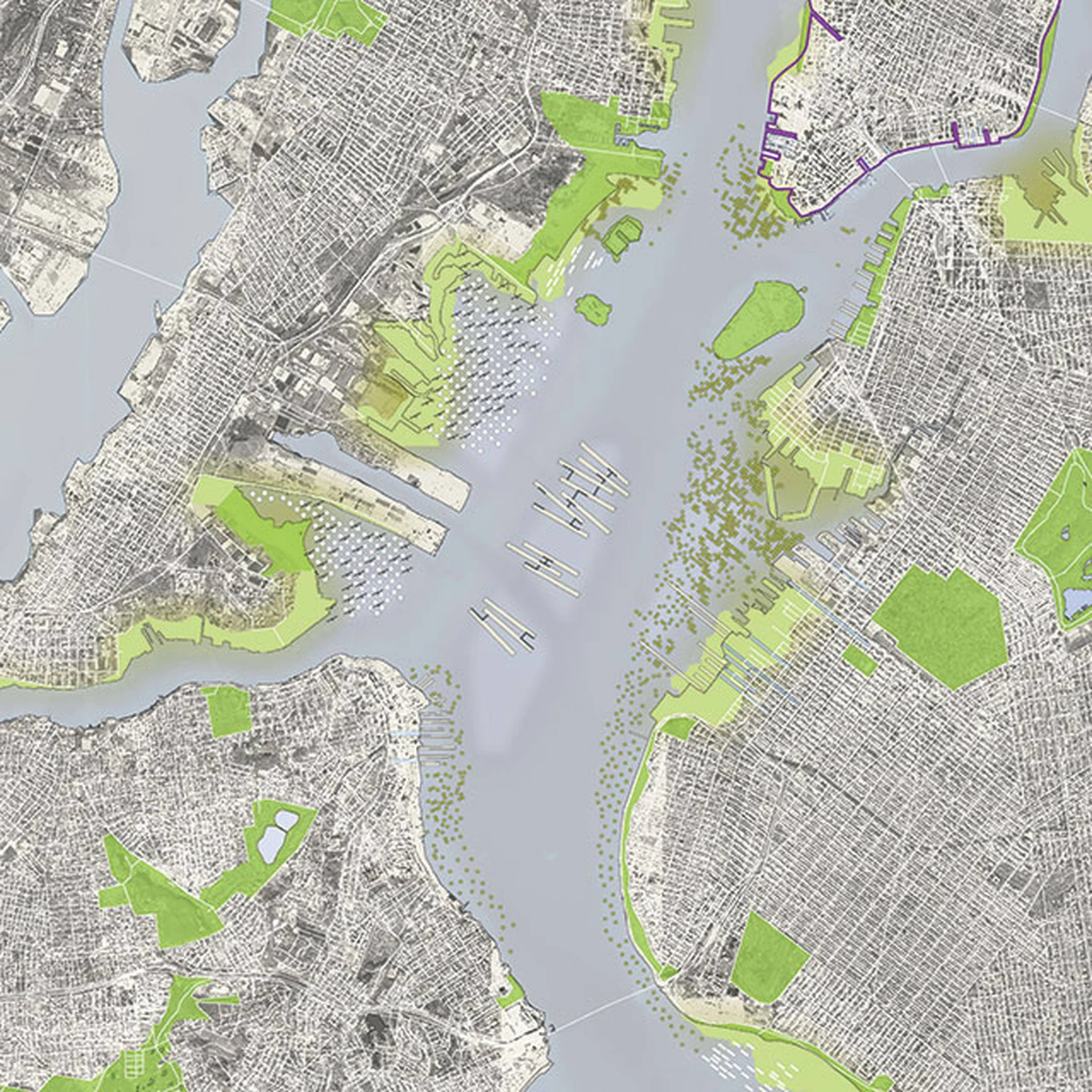 Three objectives summarize the strategies developed: Construction of an archipelago of islands and reefs along the shallow shoals of the New York–New Jersey Upper Bay to dampen powerful storm currents as well as encourage the development of new estuarial habitats; revitalization of the waterfront by designing a broad, porous, “fingered” coastline which combines tidal marshes, parks, and piers for recreation and community development; and enacting zoning formulae that adapt efficiently in response to the impact of storms in order to increase community resilience to future natural disasters. These three principles—on the water, along the coast, and in the communities—comprise a proposal for a coastal planning strategy which seeks not only to protect the New York–New Jersey region from sea level rise and storm surge flooding, but also to re-conceptualize the relationship between infrastructure and ecology in the twenty-first century waterfront city.