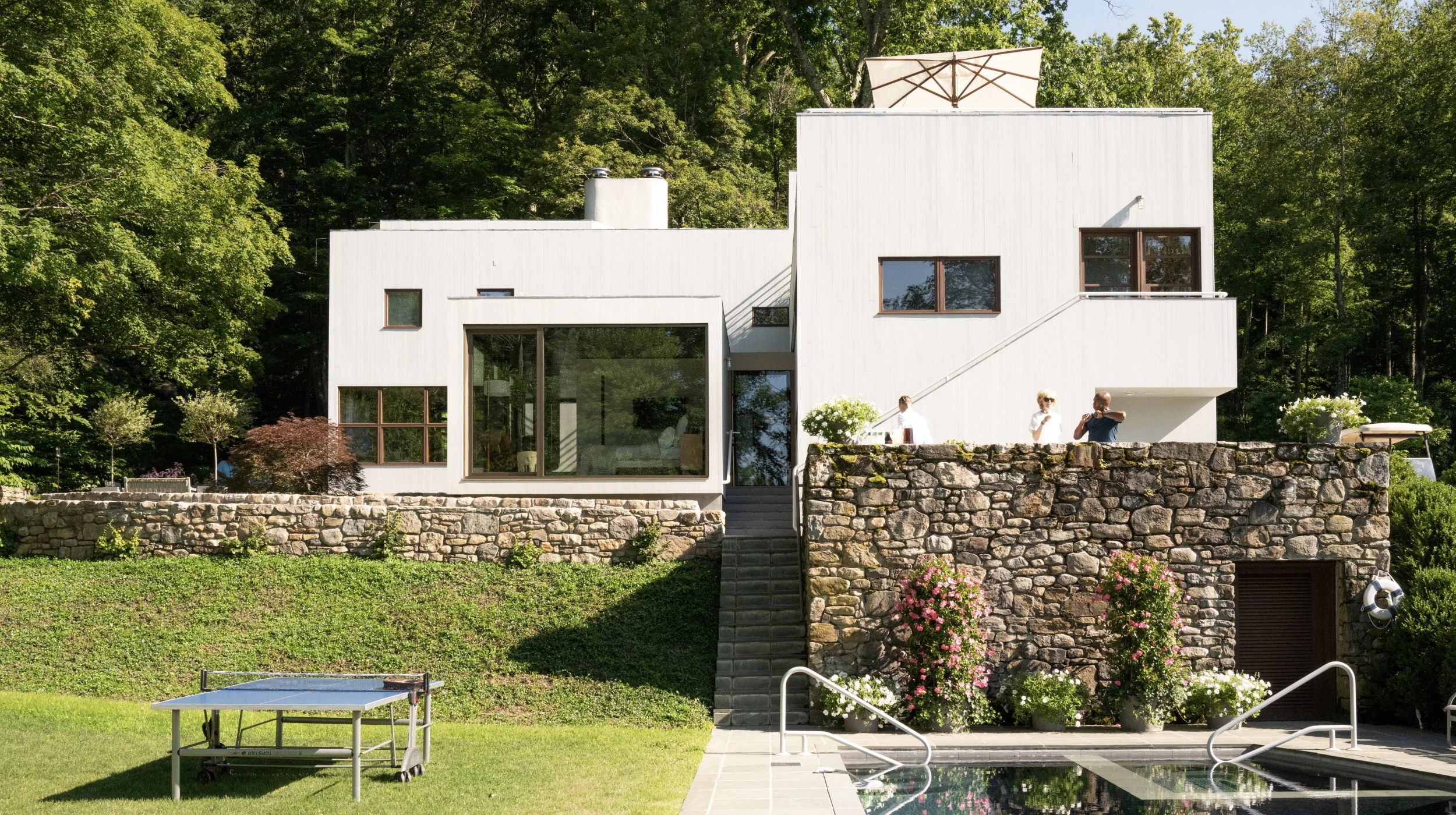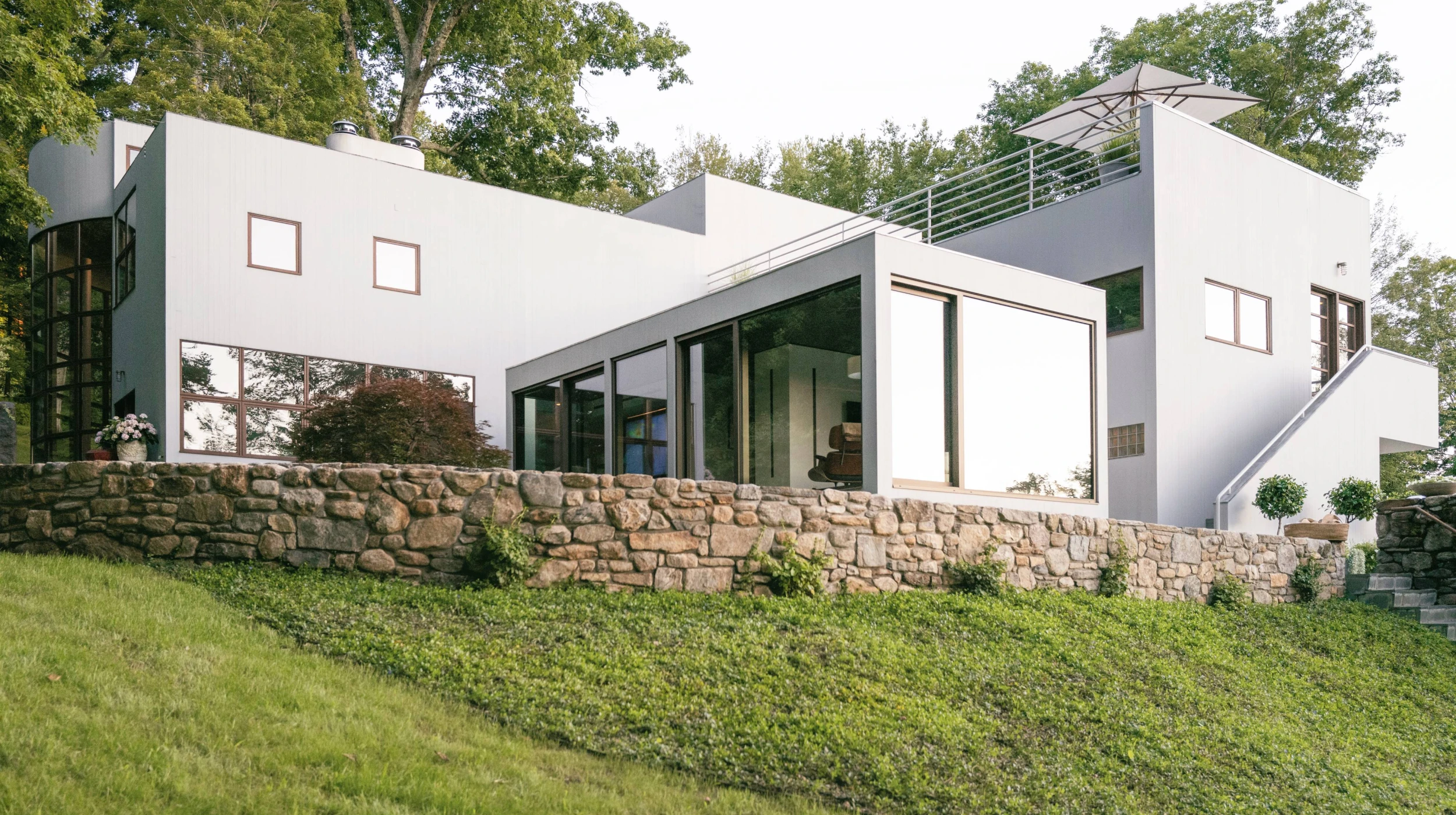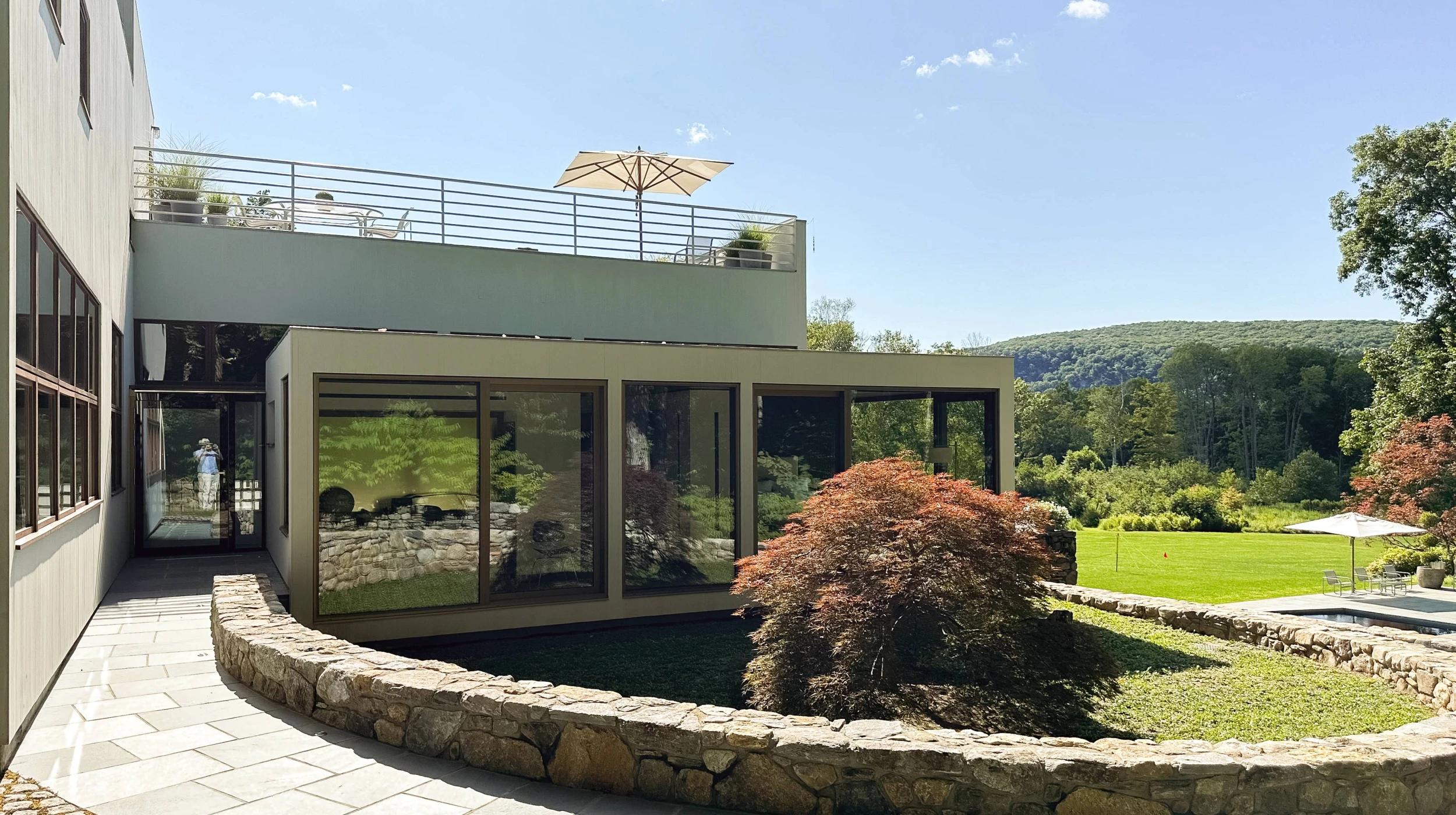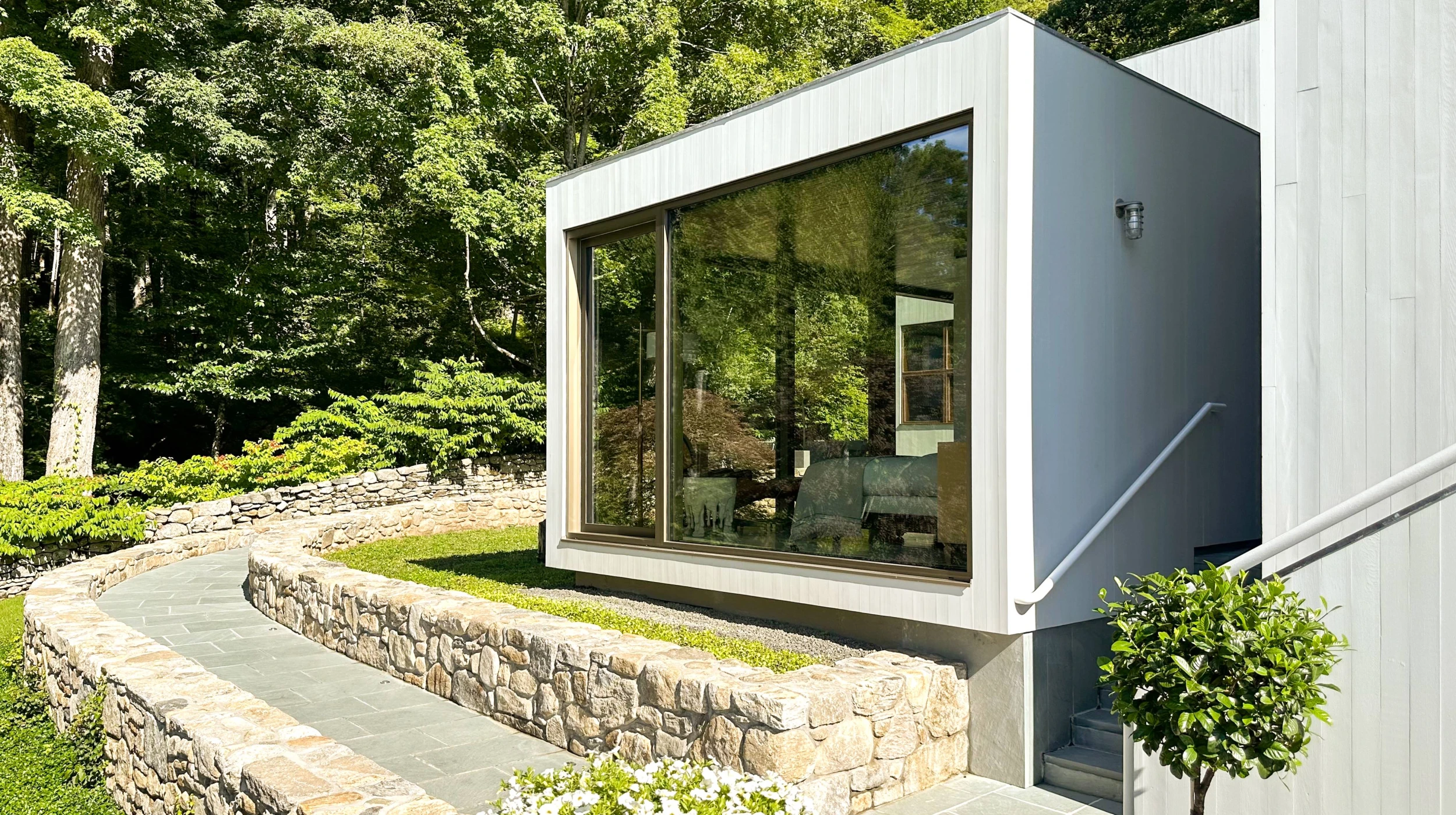 The 600sf pavilion, designed by Michael Arad at Handel Architects, is an addition to a private residence by the prominent modernist architect Charles Gwathmey. The pavilion, situated between the existing residence’s two wings, is separated from the original structure by a glass corridor. A priority for the addition was for it to meet the residents’ need for wheelchair accessibility and to complement the aesthetic of the main house while not competing with it. The interior and the access to the addition from the outside is fully accessible. In coordination with the landscape architect, a gently curved ramp wraps around the building’s exterior to connect the addition with the property’s driveway. Fieldstone retaining walls border the ramp and enhance the property’s landscaping, demonstrating the success of well-integrated accessible design.