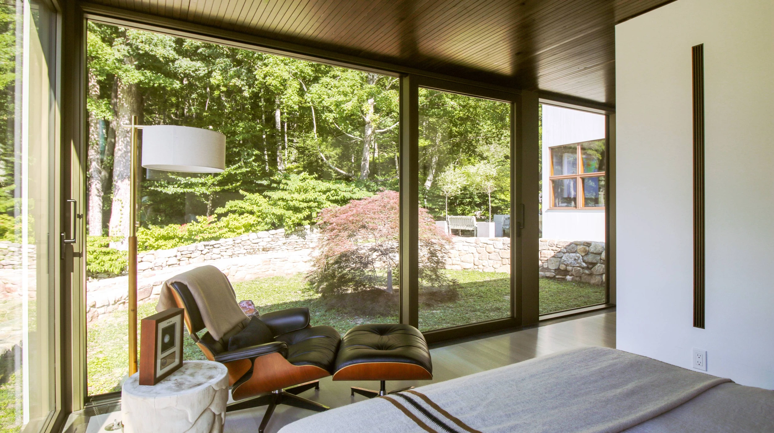 The pavilion’s superstructure and its below-ground foundation system were carefully coordinated with the existing house. To help minimize the visual impact of the addition on the property, the pavilion’s foundation is set back with the steel structure cantilevering over the foundation on a series of steel angles, giving the addition a floating effect. To maintain obstructed views from the windows of the rooms in the main house, the new addition has a compact roof structure, made possible by the use of Port Orford Cedar Nail Laminated Timber (NLT). Columns and beams consisting of slender steel angles support the NLT and tie the roof system together.