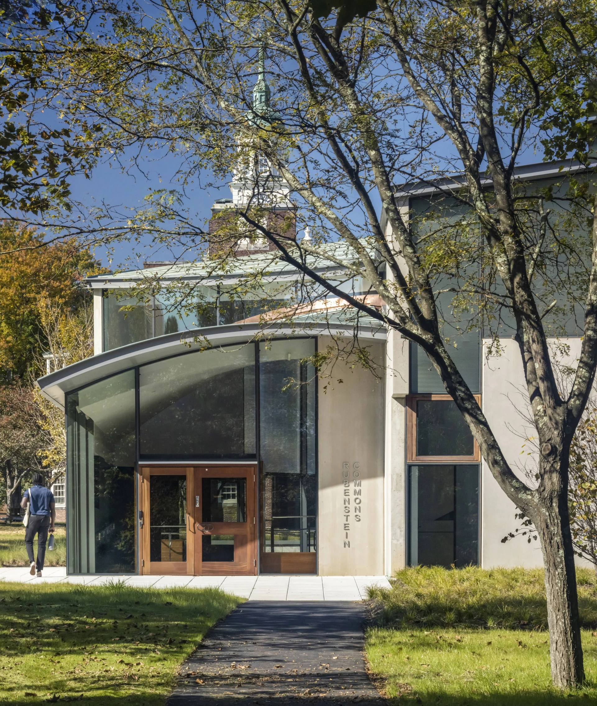 Since its founding in 1930, the Institute for Advanced Study has provided the world’s most influential scientists and scholars with an environment for intensive study and close collaboration. The Rubenstein Commons will act as a new nexus on the Institute’s campus for fellows and researchers across disciplines to gather and advance new ideas. The commons’ exposed concrete exterior, sweeping copper roof, and reflecting pools engrain the structure in its surrounding wooded landscape. The building structure is composed of 26 precast concrete bearing walls, each with a unique geometry, which are positioned along the building’s enclosure. Prismatic glass panels fill the spaces between the wall panels, and curved steel beam grooves above span between the concrete walls, creating a scalloped roof surface, allowing clerestory light to the interior.