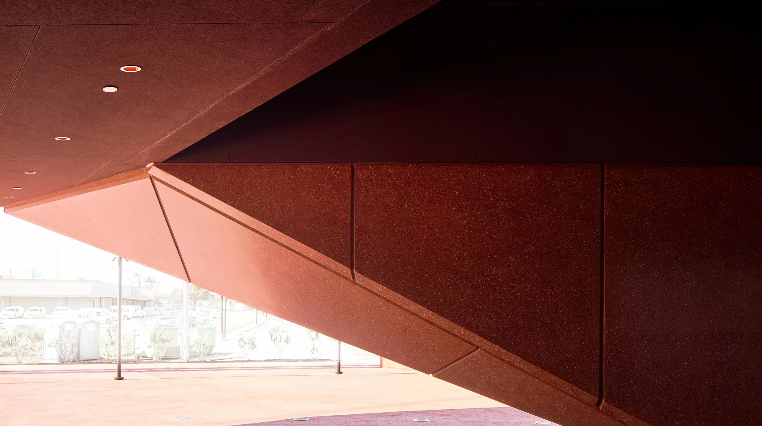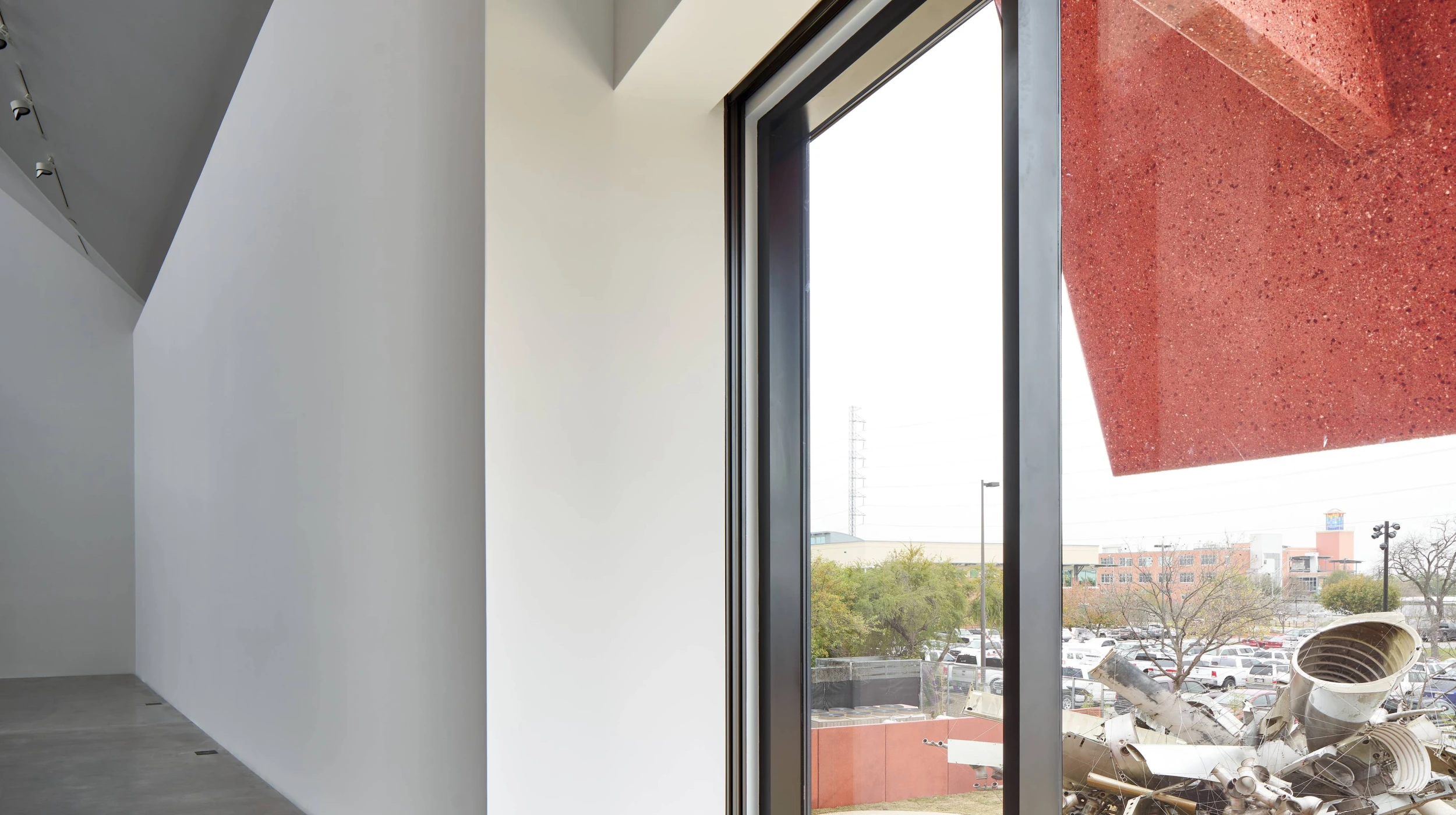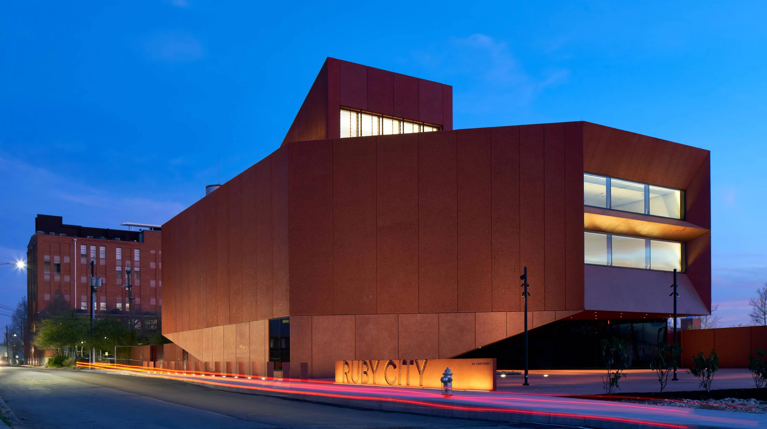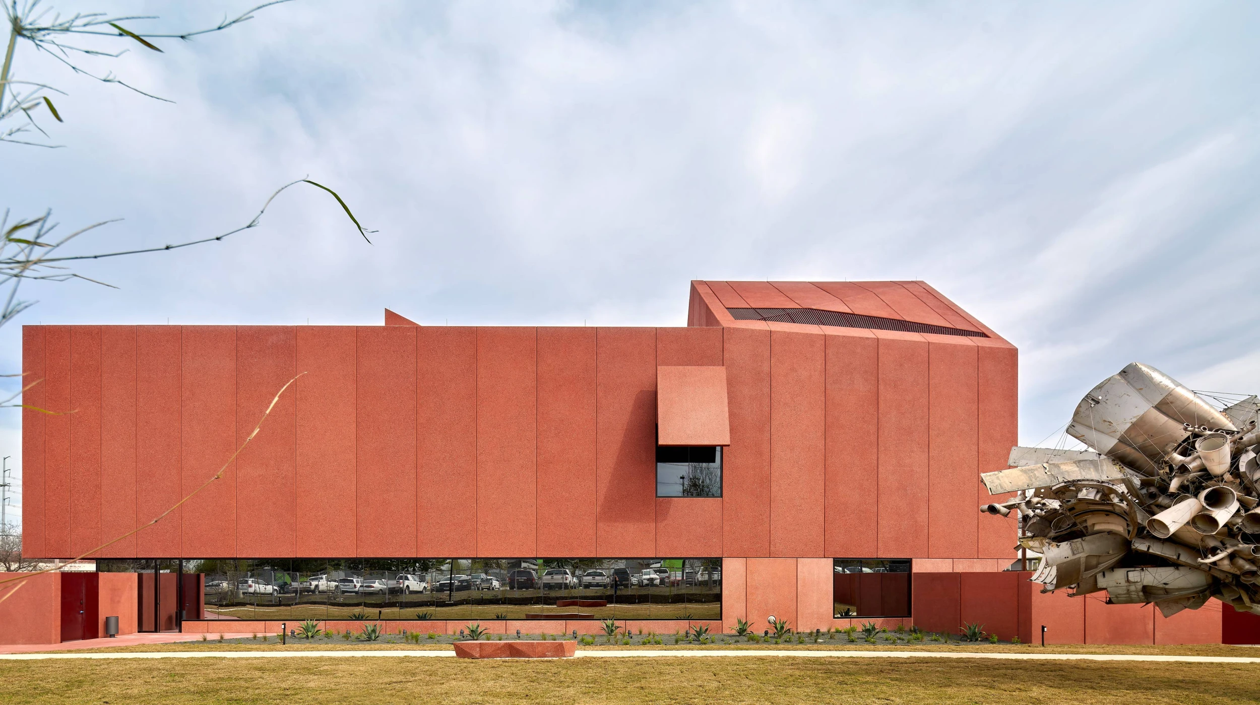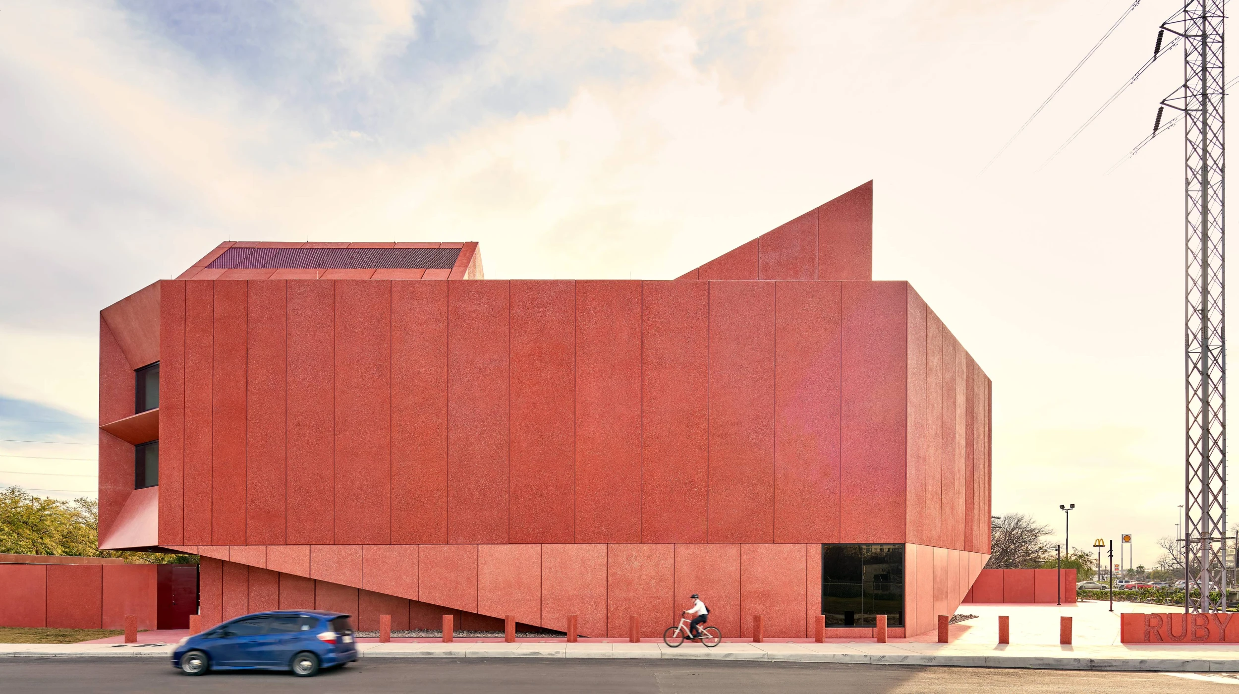 Ruby City is a new addition to the growing contemporary art campus of the Linda Pace Foundation. The 14,000sf two-story building provides a home for a growing collection of contemporary art and includes gallery space, offices, and administration. The building evokes its namesake through its jagged, gem-like form and sparkling red concrete exterior. Its asymmetric massing lifts off the ground and penetrates through the roof. The building features a cave-like cantilevered entrance with a grand staircase that leads visitors up into the galleries. The exhibition spaces are lit by large, volumetric skylights that contribute to the monolithic, faceted architecture. Drilled concrete piers support the structure, along with an intricate system of steel columns, beams, and braces that negotiate eccentric geometries and dramatic cantilevers. The steel structure is carefully coordinated with the custom precast concrete façade panels which are tinted red with glass aggregate.