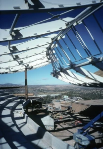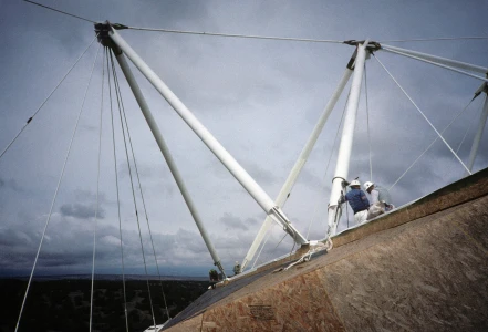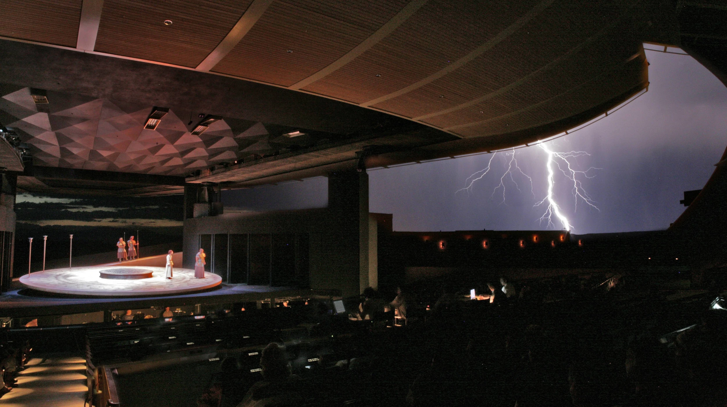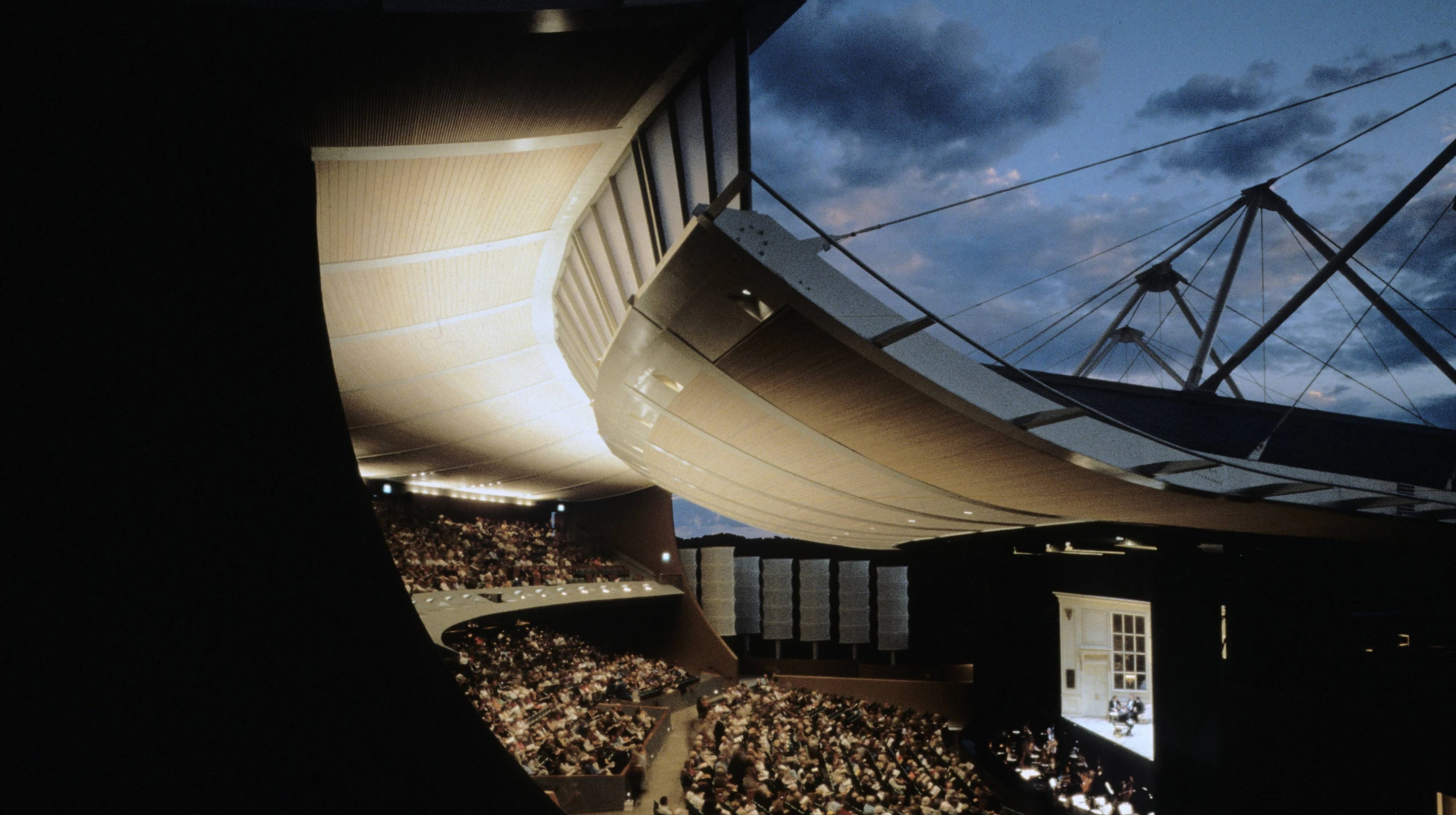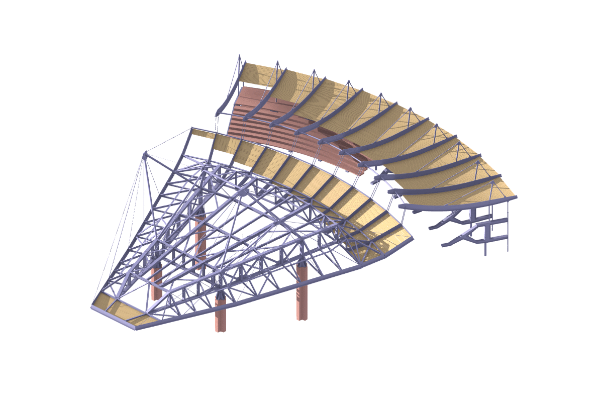 The challenge on this project was to provide a new roof over the existing opera stage that would be 50 percent larger yet still supported on the existing “star” columns and their foundations. The balcony structure was replaced and its roof joined to the main roof by a warped clerestory. The result eliminated the previously existing gap between the main and balcony roofs - and through which the rain regularly fell on the audience. The new roof structure, locally known as the “mothership”, is rod-stayed, off the star columns, from paired V masts splayed apart and supporting, through a fan or harp of rods, 4 primary ribs, each an inverted T. Between these the roof, which is also the acoustical surface, is made of heavy glue-laminated decking. The balcony structure uses a molar-like rigid structure to translate the cantilever moment of the seating rackers into a vertical couple supported on a thin hanger and column.