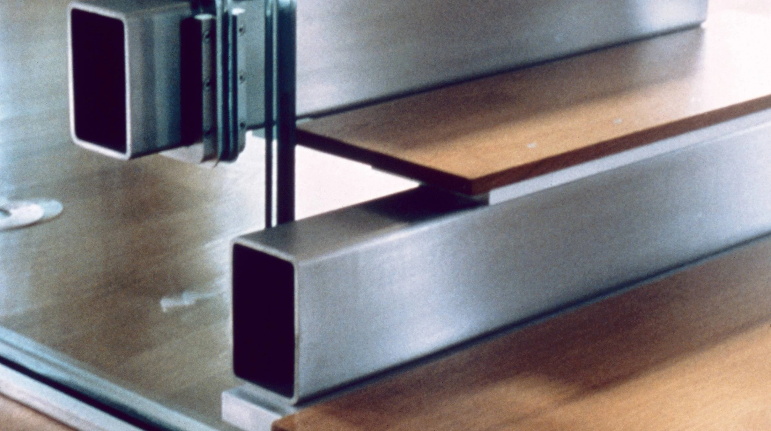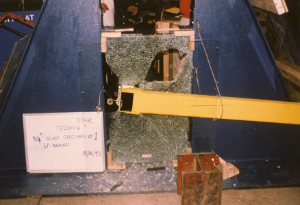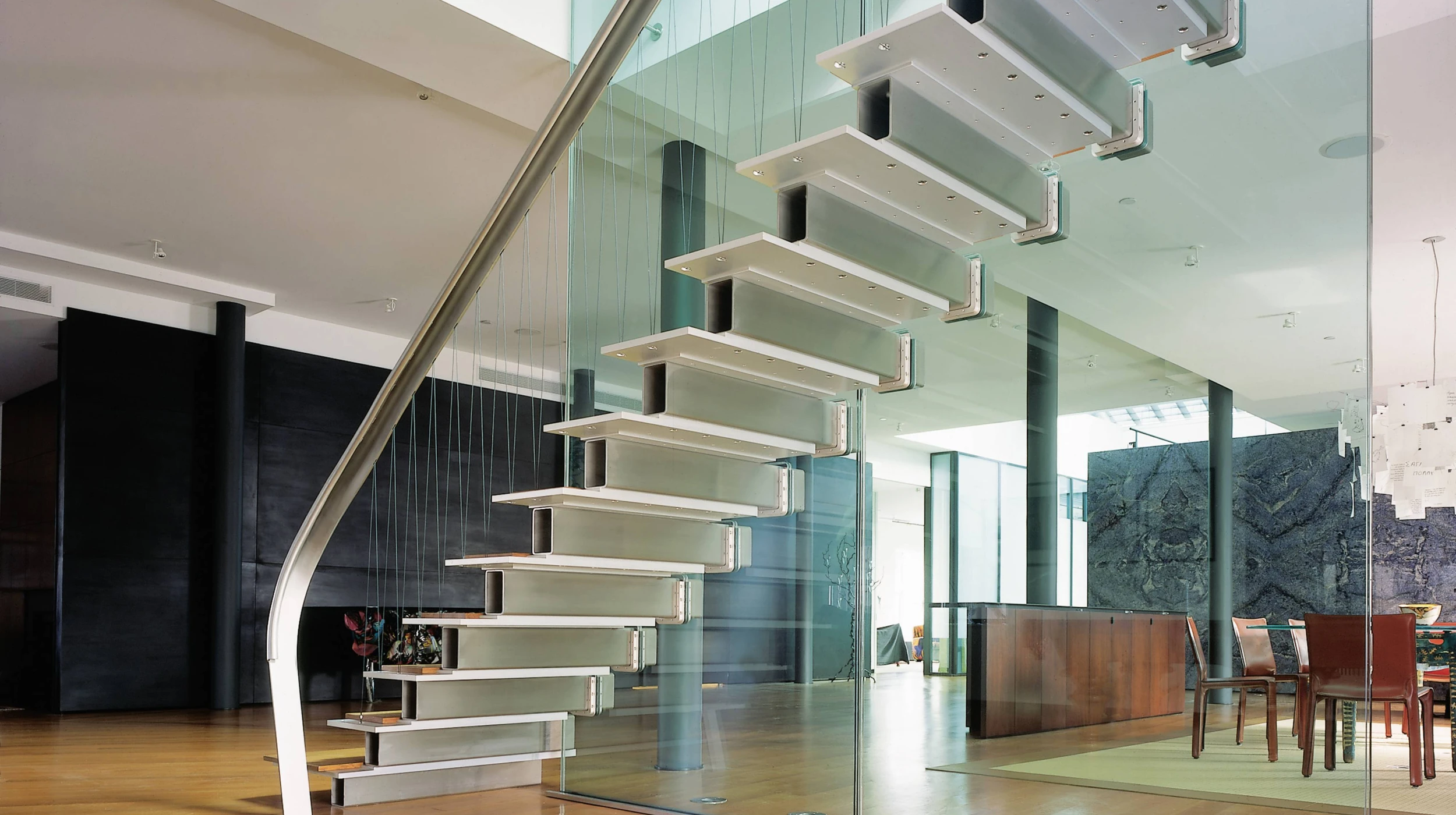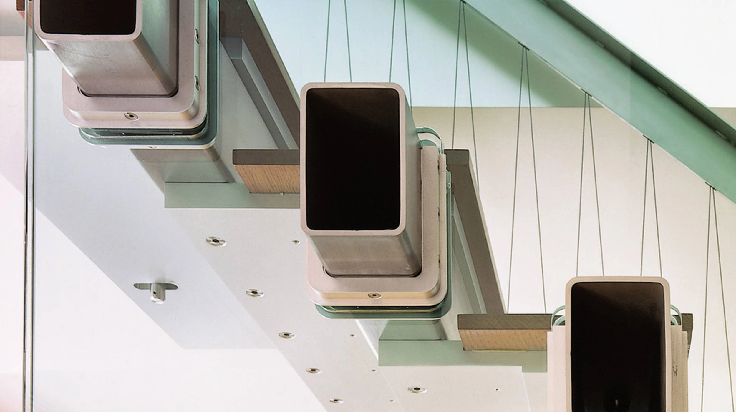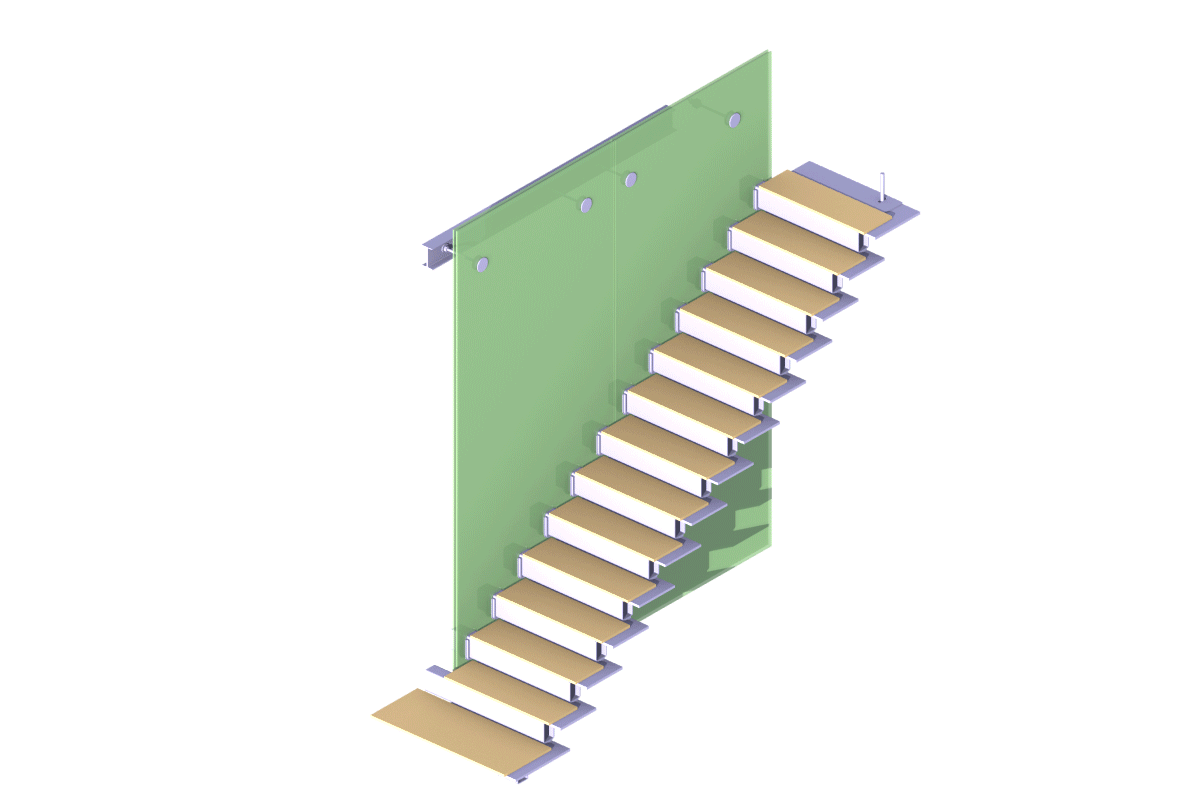 This stair represents a revival of the “cantilever stair” where treads overlap so the load on any tread cascades down to those below. The wall from which the treads extend carries the resulting torque. In this instance, the stair system uses 64in by 6in steel tubes risers, aluminum plate treads, and a perforated triple layer laminated and tempered glass wall to resist torque. The risers carry the cascade torque into the glass through an aluminum U-shaped stirrup that bears on three sides on Delrin wedges.