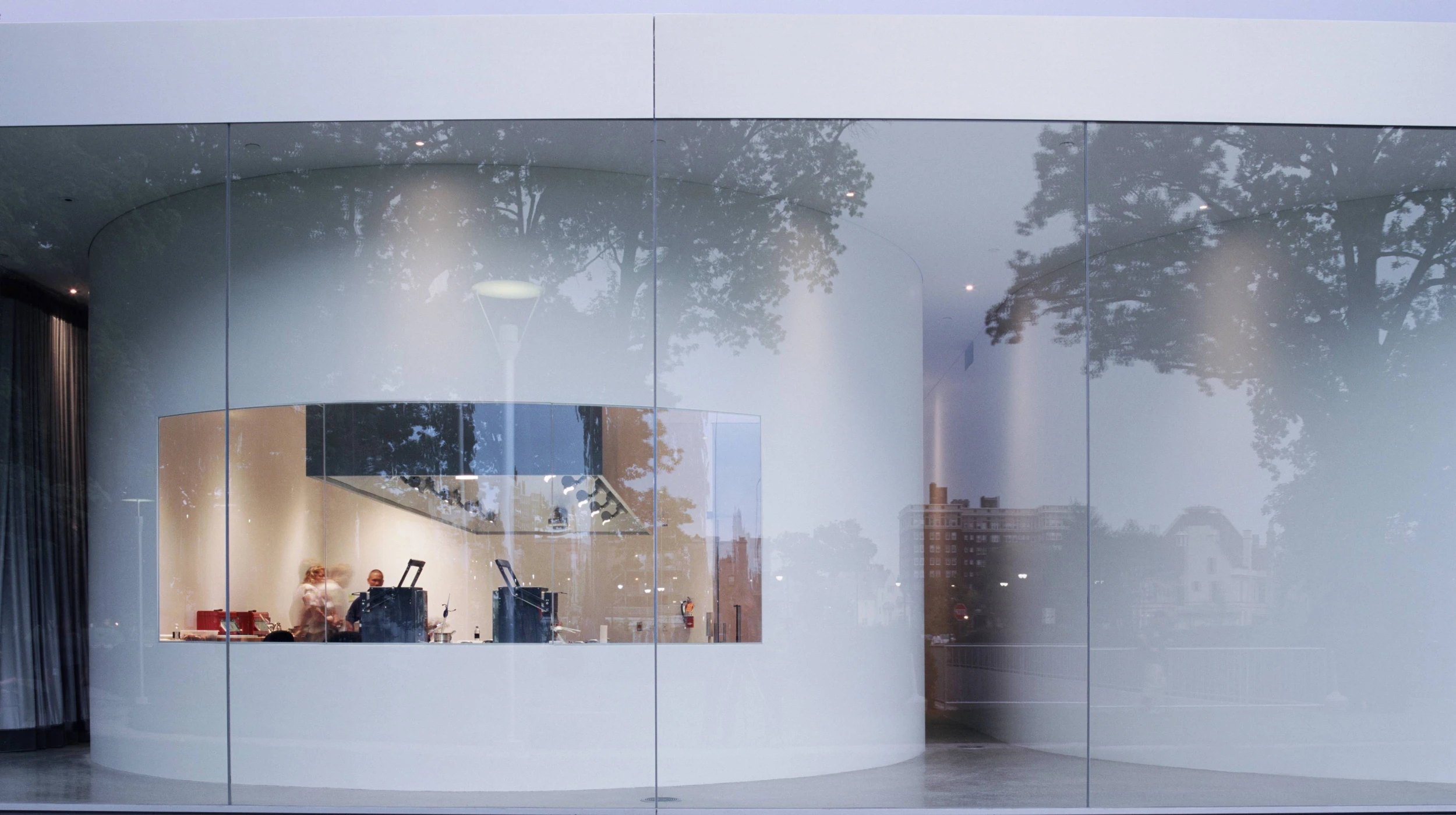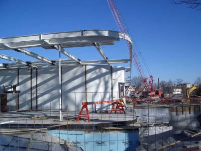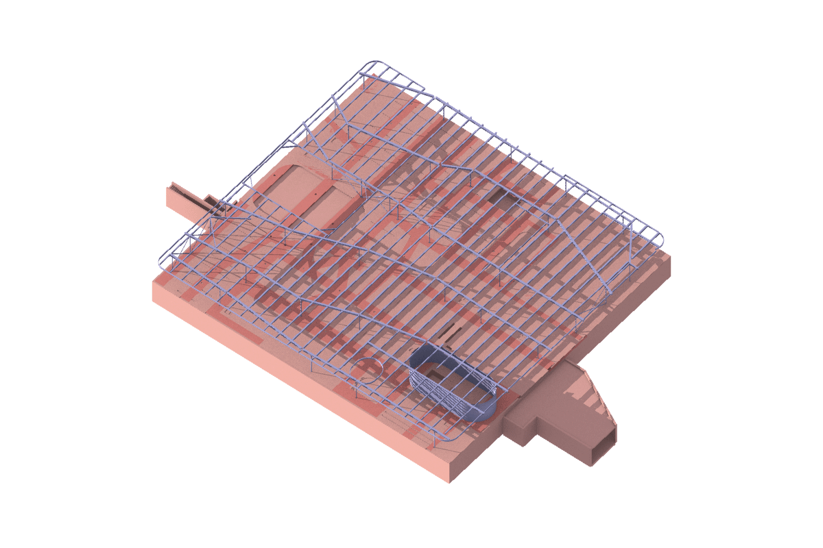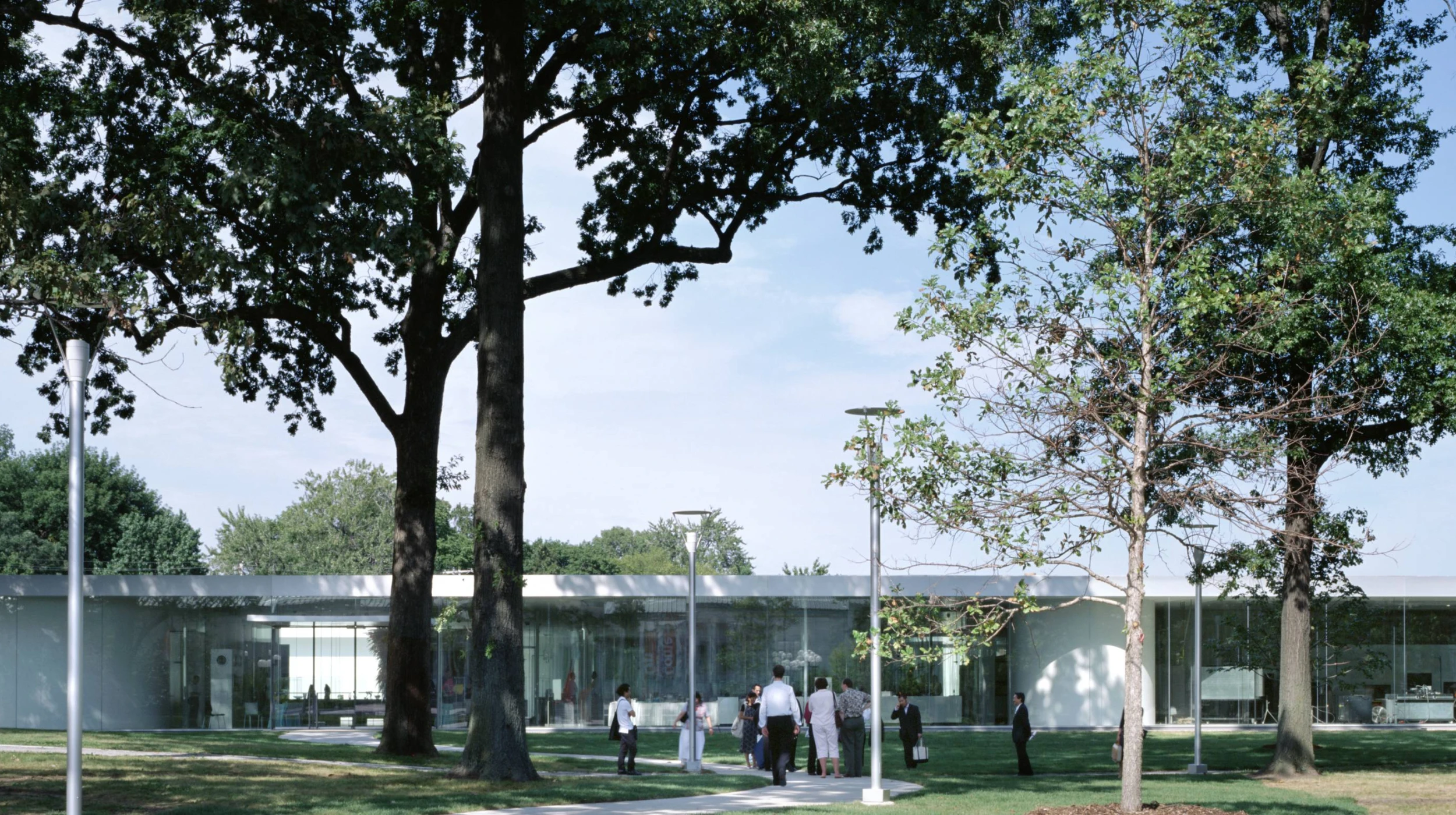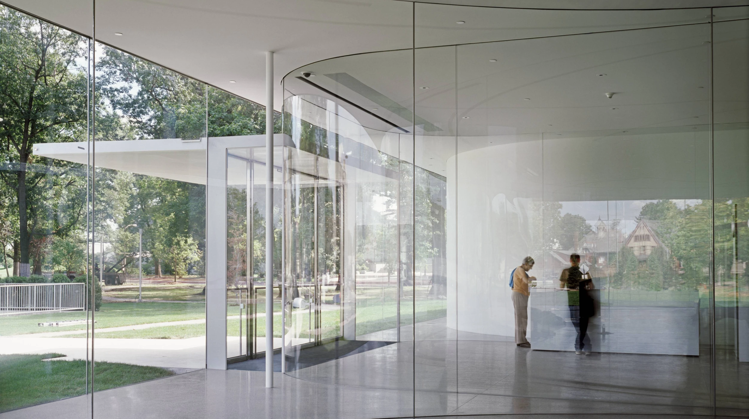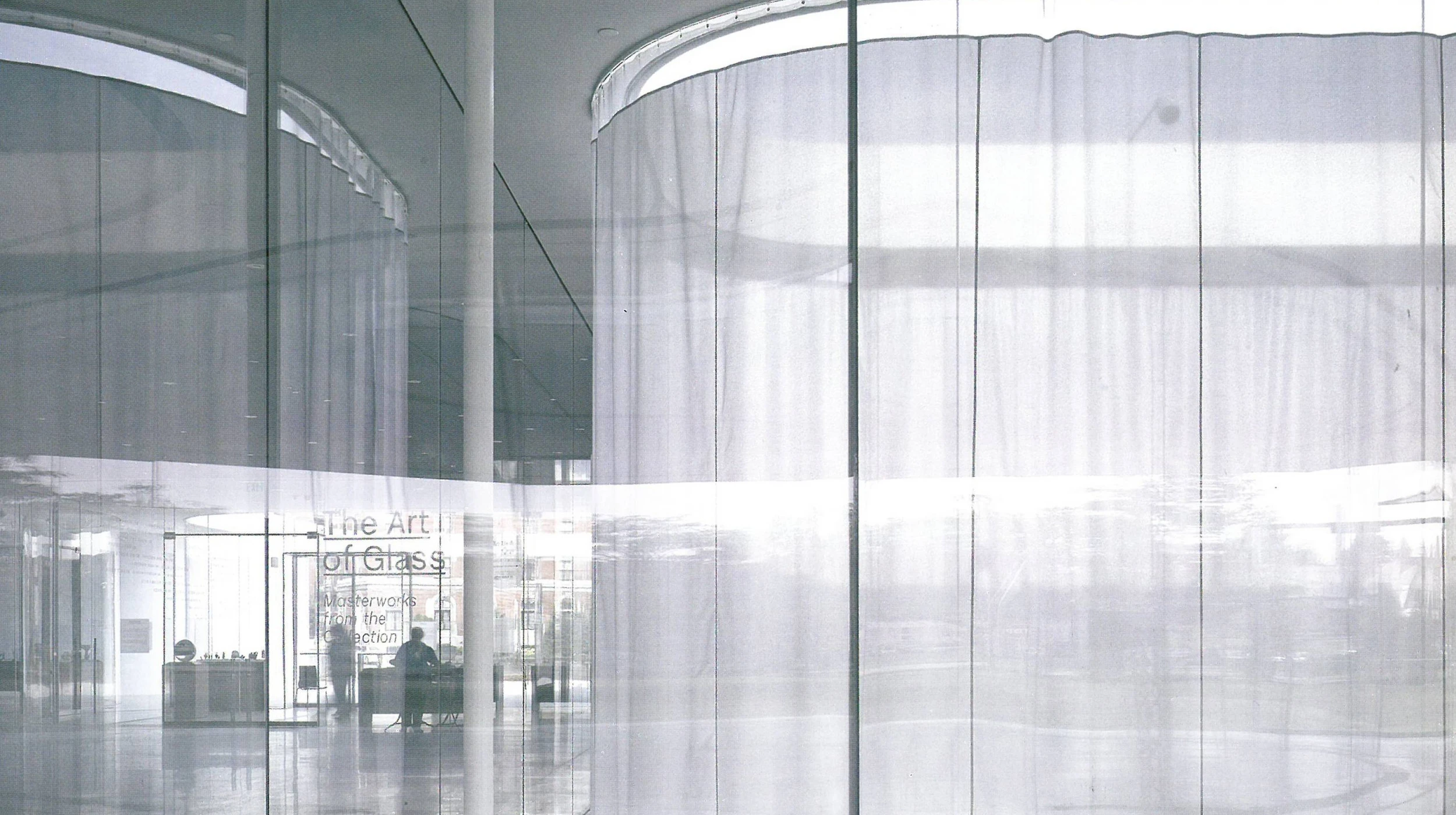 The Glass Pavilion is a free-standing addition to the Toledo Museum of Art with exterior and interior walls of glass. The interior glass walls form the galleries, and the cavities between the interior and exterior walls allow for ventilation and heating. The structure combines unorthodox solutions for steel framing in the roof and concrete framing in the floor to allow circulation of services in the thinnest possible depths. The steel roof consists of a moment-connected beam and girder horizontal grid and has a maximum structural depth of 12in for spans of up to 50ft. The concrete floor is made up of shallow, wide band beams with one-way slabs to create many linear slots through which to feed the HVAC from below. Machined round bar columns form pin connections at the top and reduce the diameter to 4 1/4in. Exposed vertical steel plates serve as both column and shear panel to combine vertical and lateral support with an extremely thin profile.