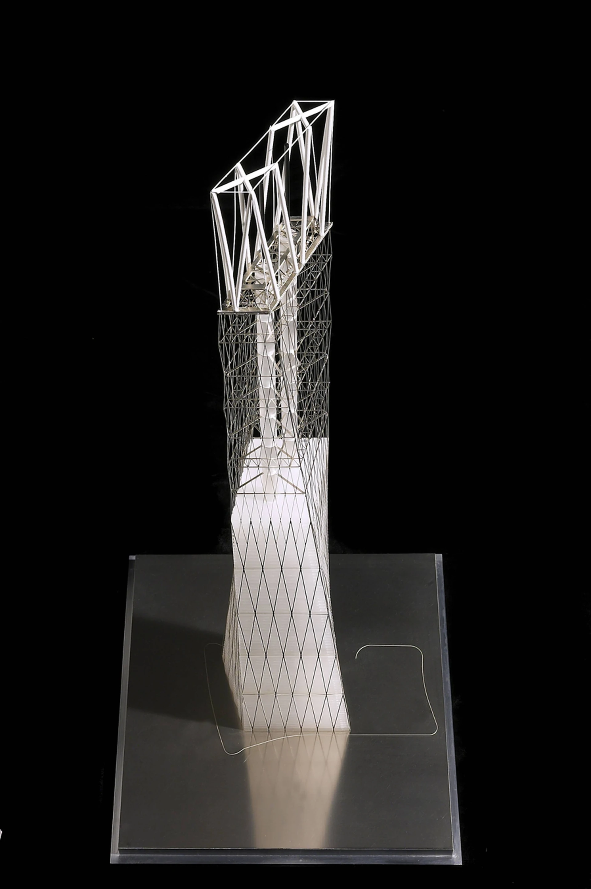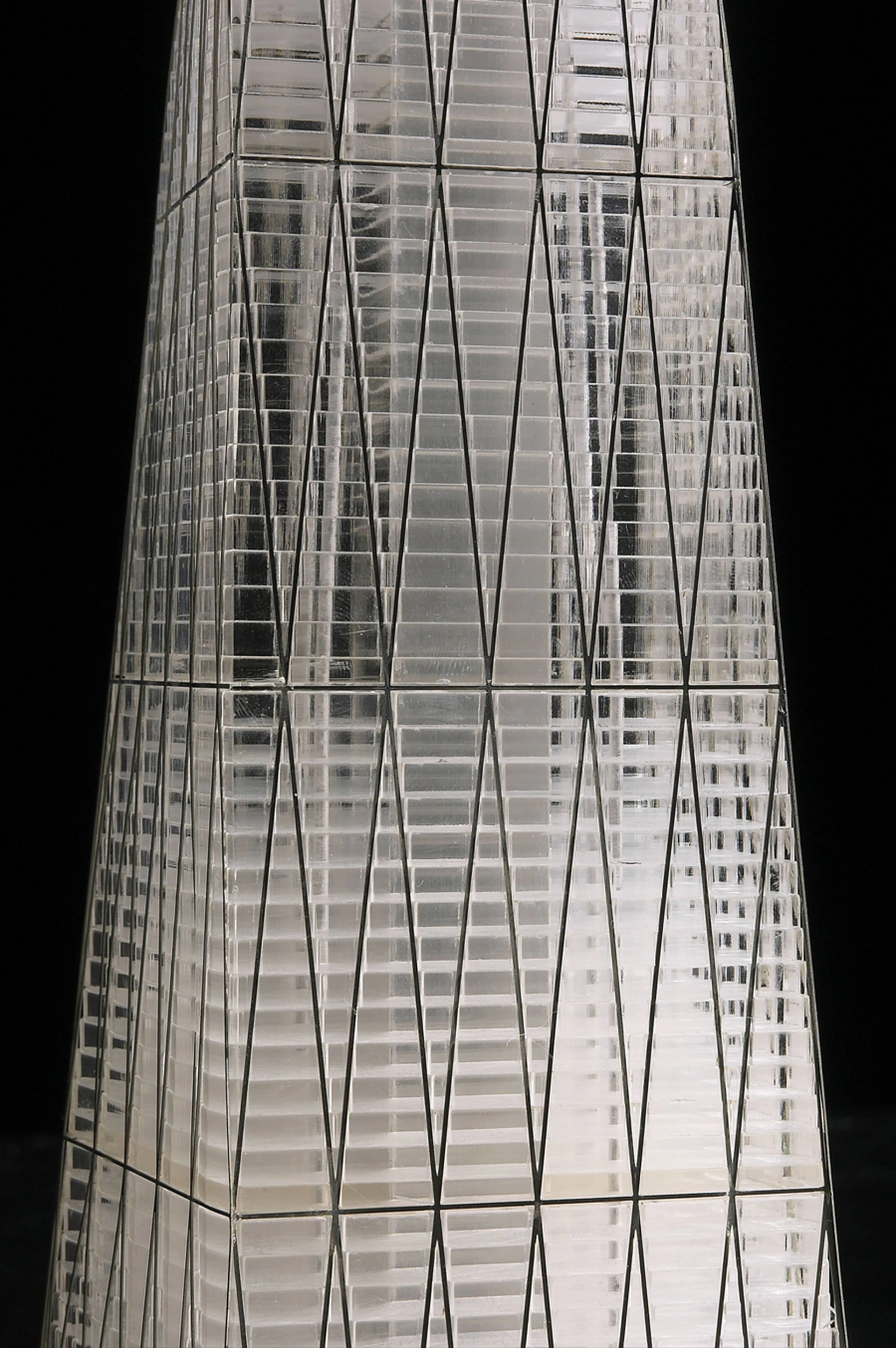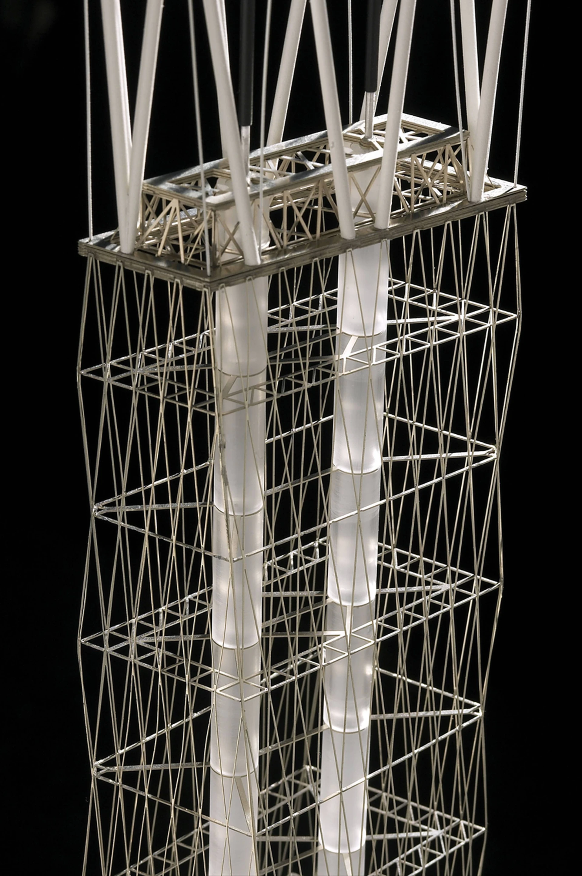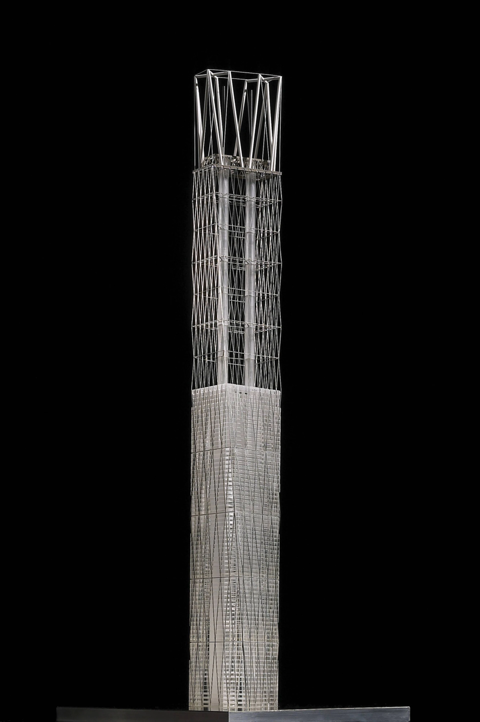 Working with the team designing the World Trade Center Tower 1 from 15 May 2003 until 15 December 2003, Guy Nordenson and Associates developed the design and structure that served as the design basis for the World Trade Center Freedom Tower. The original WTC T1 design is a torqued and tapered volume. The 1000ft building consists of a 700ft cable-stayed double mast structure and a 300ft antenna field and carbon composite tensegrity structure. The building structure uses a steel diagrid exterior frame, a composite steel floor structure and a 110ft by 65ft continuous concrete core. The diagrid structure facilitates the economical transfer of selected columns over the PATH tracks under the building. The cable system contributes both stiffness and transparency and provides for a safe means of construction—allowing both slipped-formed cores and a strand jacked tensegrity/antennae platform—and enhanced safety in use. The open cable structure would permit the operation of wind turbines.