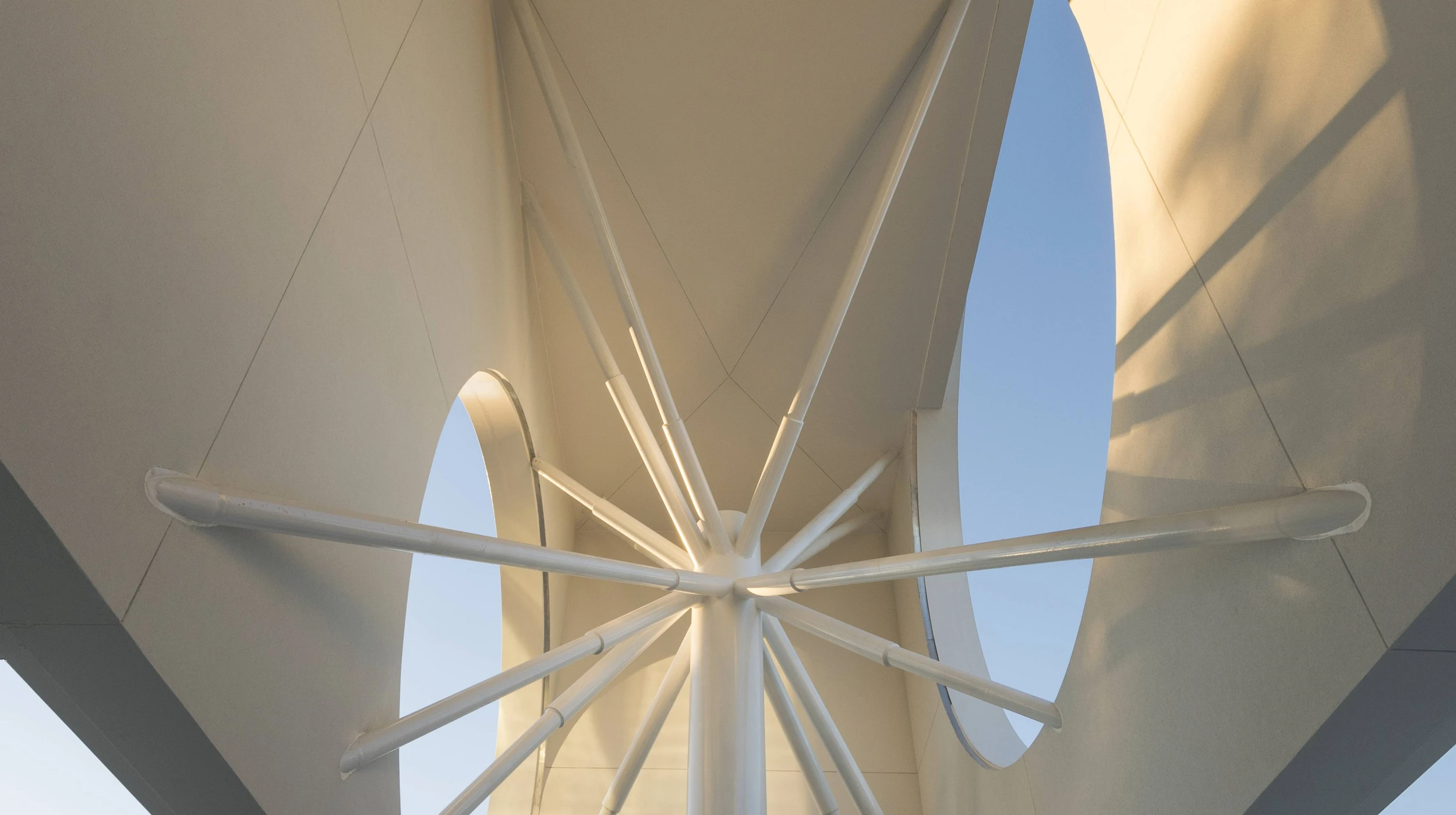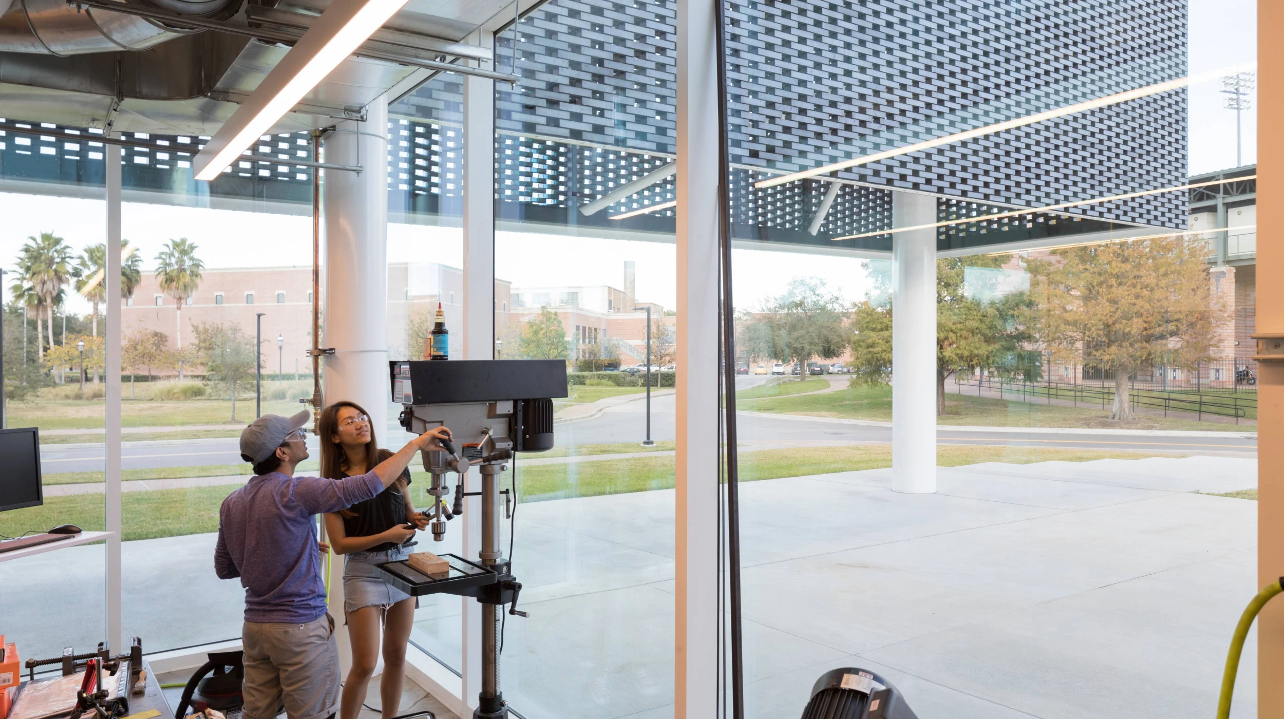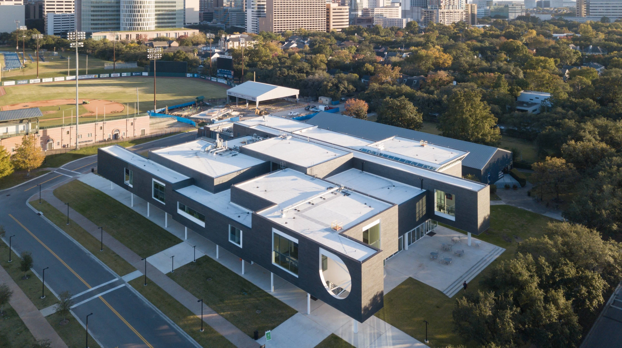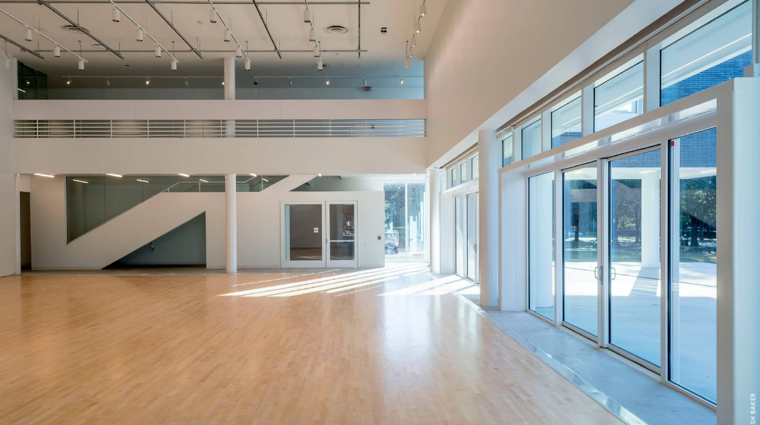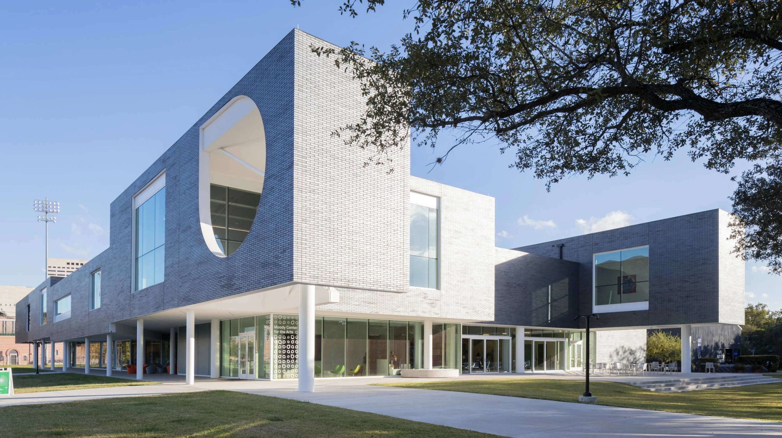The Moody Center for the Arts at Rice University houses a diverse program of instructional, studio, performance, and exhibition spaces that encourage collaboration across disciplines. To create a sense of openness, the upper story appears to levitate over the ground floor, and two masonry screen walls suspend above the ground level pedestrian plaza supported by “starburst” column structures. This openness carries to the building’s interior, featuring a double-height space at its center. The main building structure consists of a cast-in-place concrete foundation and ground floor framing, with a steel framed superstructure and concrete slabs on metal deck. At the roof level, secondar steel beams frame the roof steps and provide support for the unfilled metal roof deck.