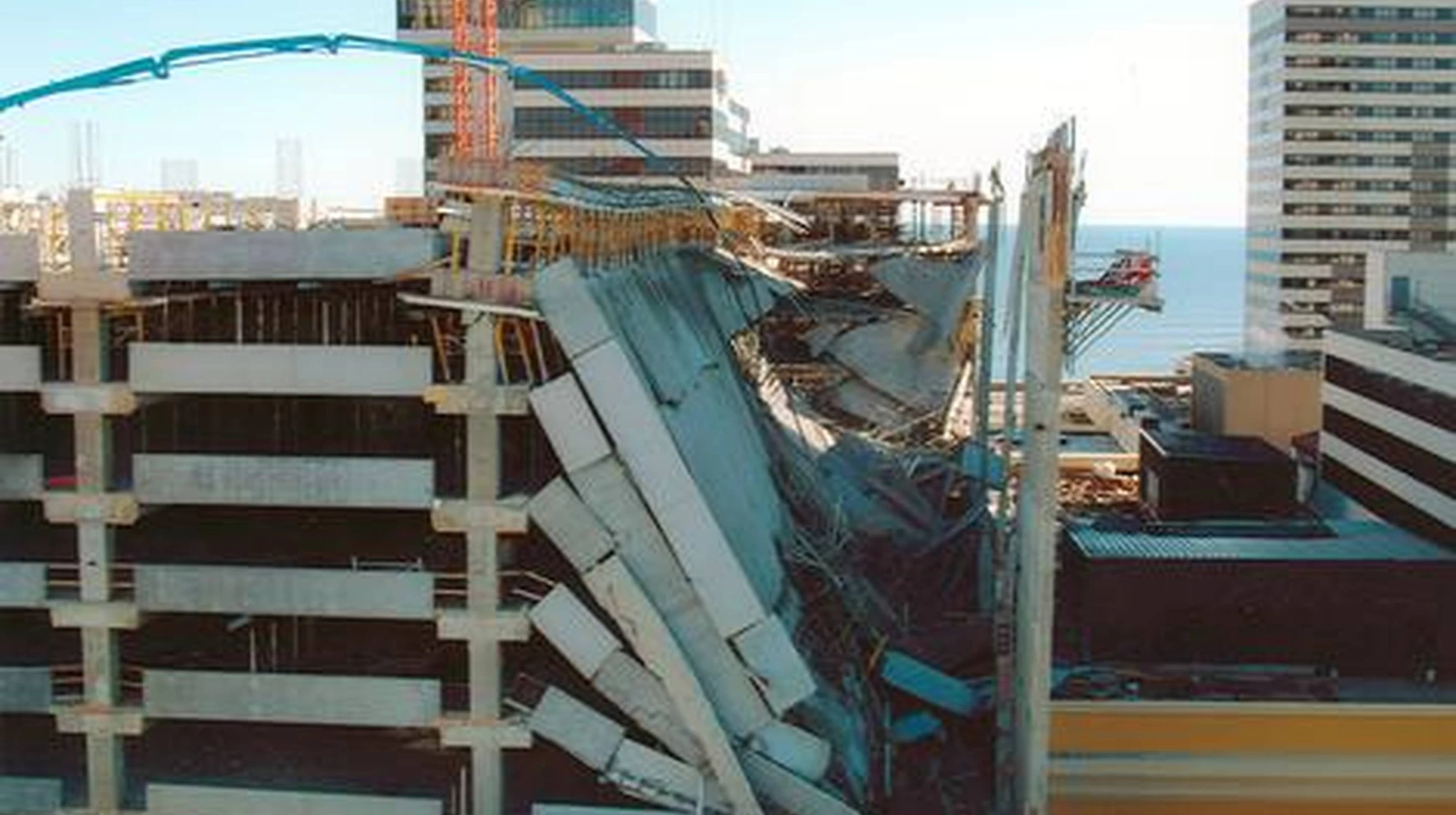 Guy Nordenson and Associates provided forensic engineering services in a litigation related to the 2003 collapse of the 10-story concrete Tropicana Casino Garage, which killed four construction workers. To assess code compliance, GNA reviewed the structure’s design documents, evaluated construction administration documents and correspondence relevant to the collapse region, and performed detailed structural analysis of the reinforced concrete elements responsible for the structural failure. GNA also studied the behavior of the structure prior to failure with nonlinear inelastic equivalent frame “pushdown” analyses (similar to a lateral “pushover” analysis, with plastic hinges representing regions of ductile response). Using software developed by Dr Anthony Ingraffea, a fracture expert at Cornell University, GNA analyzed the brittle punching shear failure of the under-reinforced concrete beam-to-column joint with linear elastic fracture mechanics in a two-dimension finite element analysis.